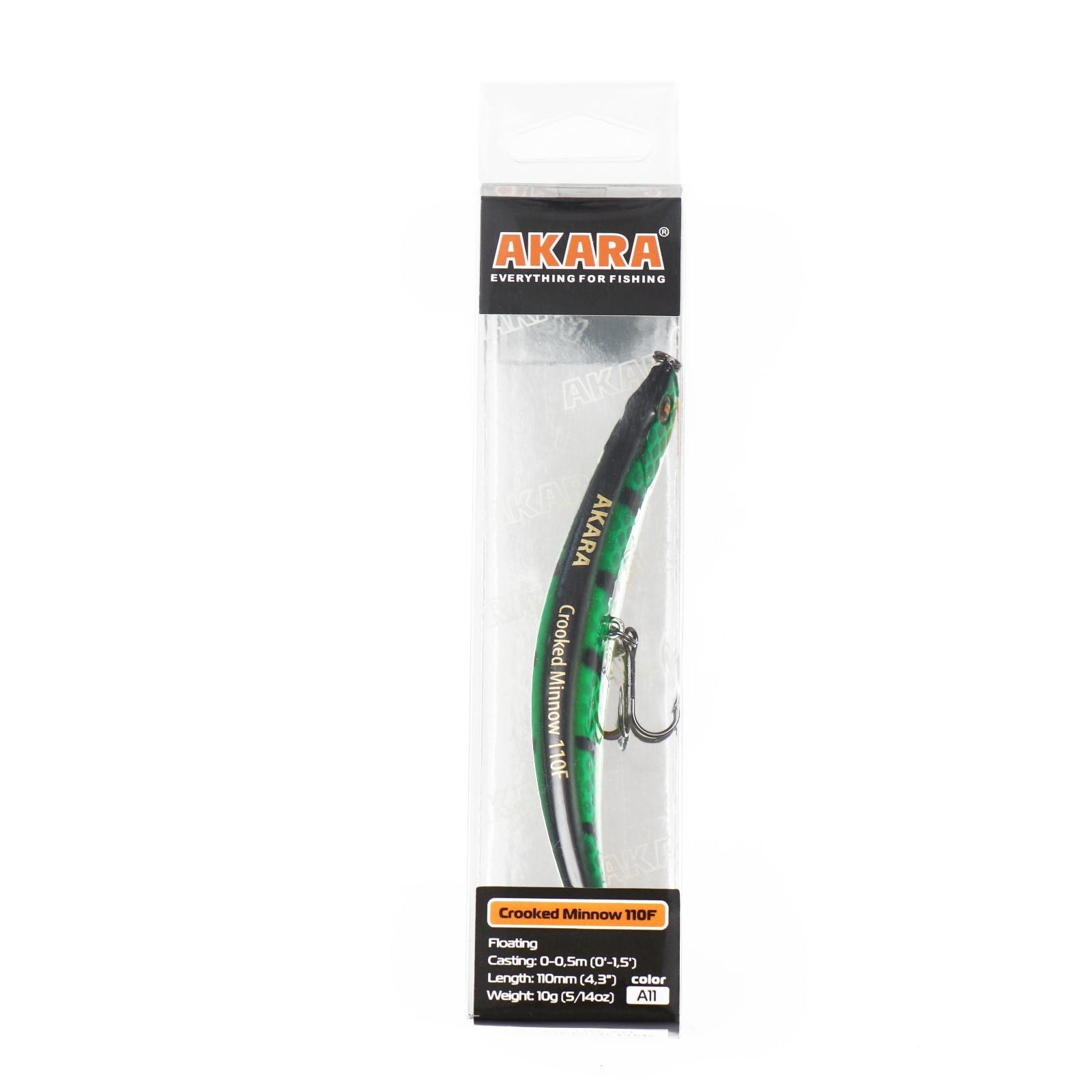 Воблер akara crooked minnow 110f, цвет a11, 11 см, 10 г. Akara Crooked Minnow 110F – плавающий безлопастной воблер оригинальной формы длиной 110 мм. Отлично подходит для ловли по небольшим глубинам. Неповторимая игра на рывковой проводке позволяет облавливать даже маленькие окошки среди водной растительности. Допускает равномерную проводку. Основным объектом ловли для этой приманки выступает щука, а также окунь. Заглубление до 0, 5 м. Оснащен крючками из высокоуглеродистой стали. Цвет: Разноцветный parts count: 0 Вес, г: 10 Тип приманки: Воблер Материал: Пластик Температурное ограничение: Нет Заглубление, м: 0.5 Тип плавучести: Плавающий Форма воблера: Минноу  развернуть описание ▼