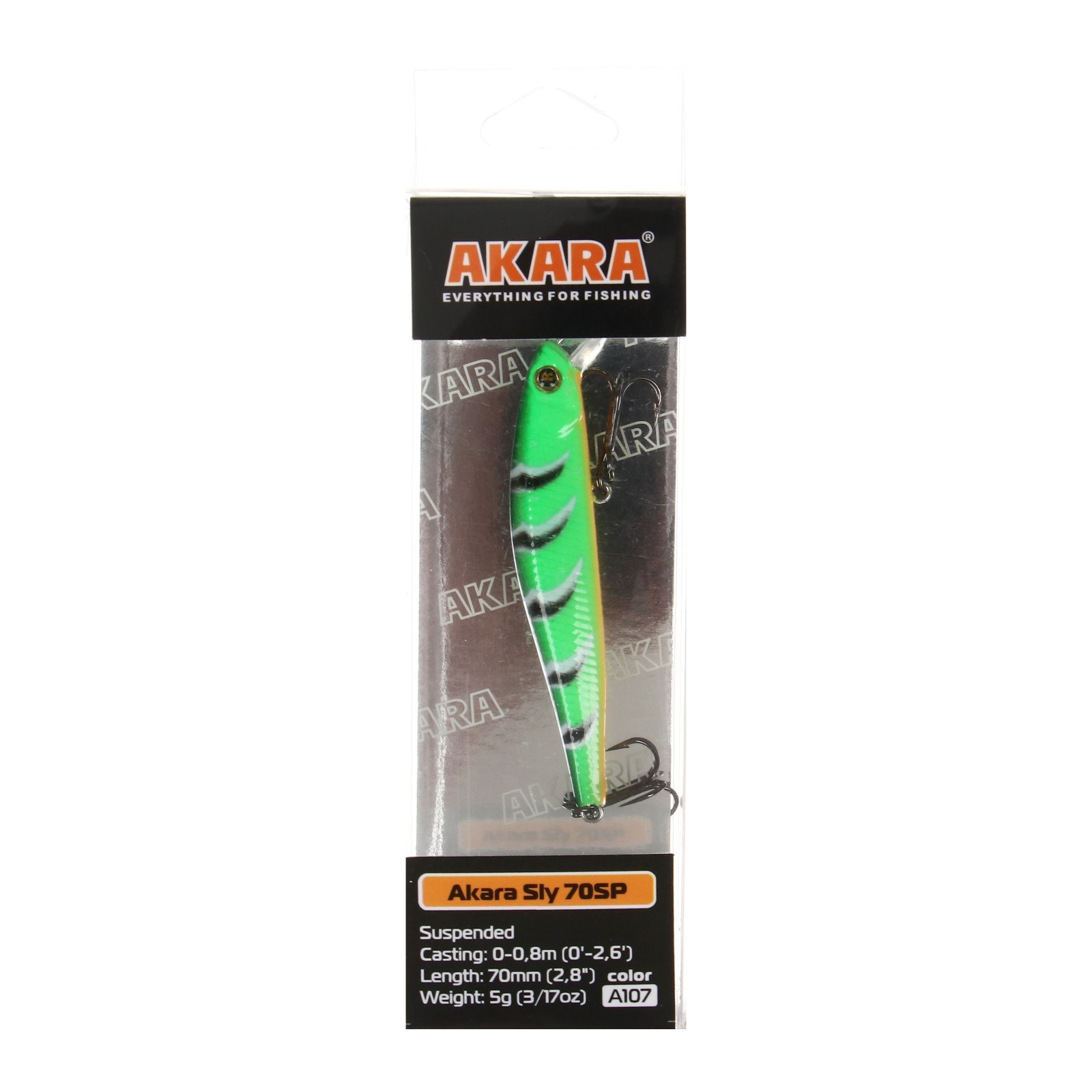 Воблер akara sly 70sp, цвет a107, 7 см, 5 г. Akara Sly 70SP - это классика твичинга. Идеально работает на любой рывковой проводке. На резких и агрессивных рывках воблер идет в 30-40 см от поверхности воды, а на плавных и протяжках его можно заглубить до одного метра. Цвет: Разноцветный parts count: 0 Вес, г: 5 Тип приманки: Воблер Материал: Пластик Температурное ограничение: Нет Заглубление, м: 0.8 Тип плавучести: Суспендер Форма воблера: Минноу  развернуть описание ▼