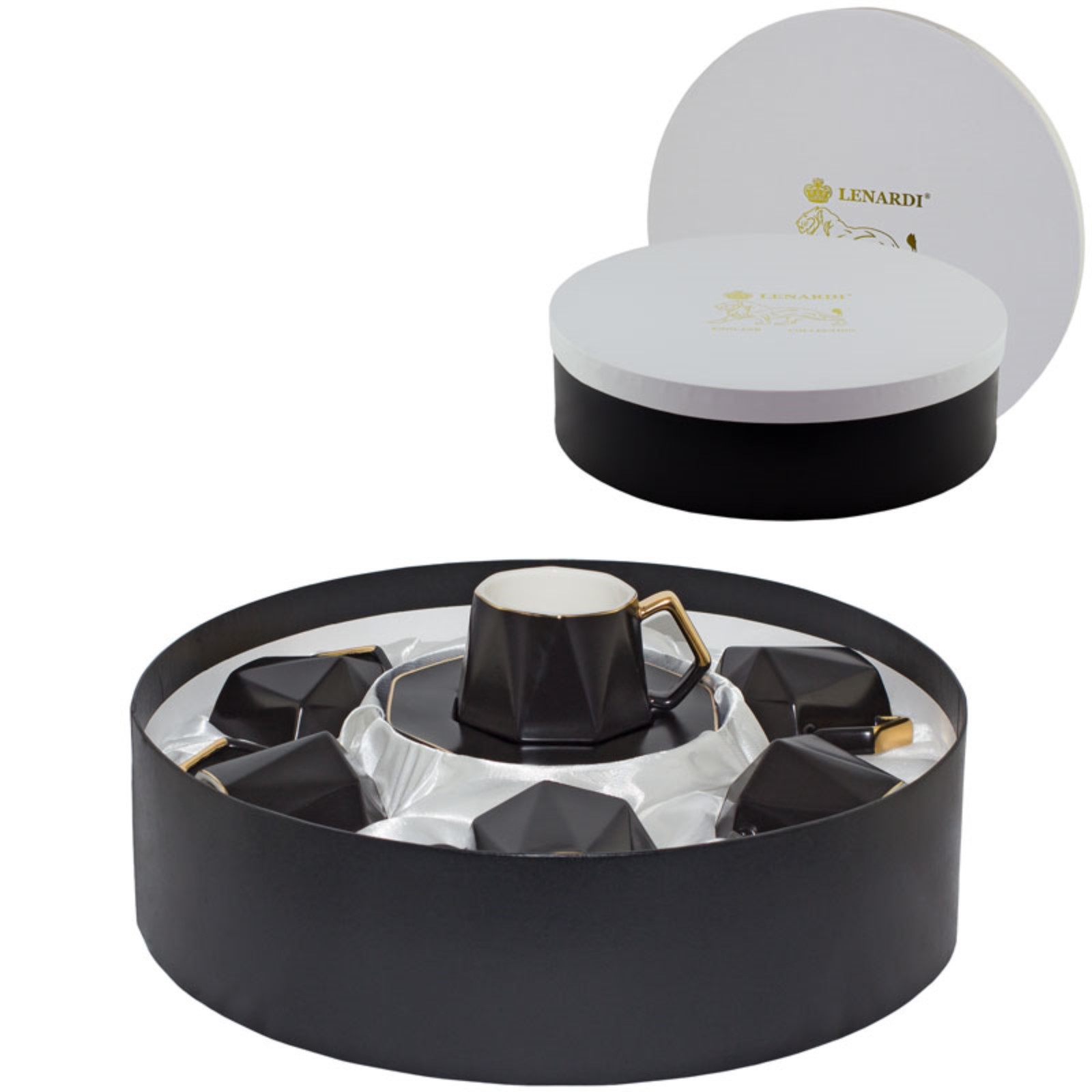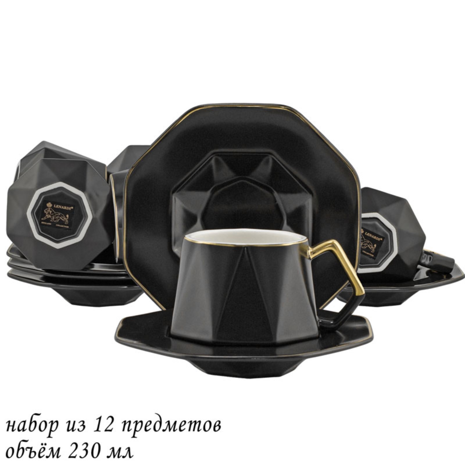 Чайный набор lenardi, 12 предметов. Изделие может иметь следующие несущественные дефекты: незначительный скол краски;прерывание и наплыв рисунка;наличие полосы на рисунке;потёртости и наплыв золотой краски на внутренней стороне;небольшие потёртости и царапины на глазури;засорения под глазурью;плотные вздутия глазури на внутренней поверхности;натёк глазури;наличие мушек (чёрных точек);неровность внутреннего отверстия;отклеивание страз;потёртость упаковки в уголках. Данные недостатки не влияют на свойства изделия при использовании. Цвет: Чёрный Количество персон: 6 В наборе, шт.: 12 Объём, мл: 230 Тематика: Полоски, полоса Материал: Фарфор Наличие подставки: Нет Можно мыть в посудомоечной машине: Нет Можно использовать в СВЧ-печи: Нет Текстура: С рельефом Тип: Чайный сервиз Особенности: С золотой отводкой Матовая поверхность: Да  развернуть описание ▼