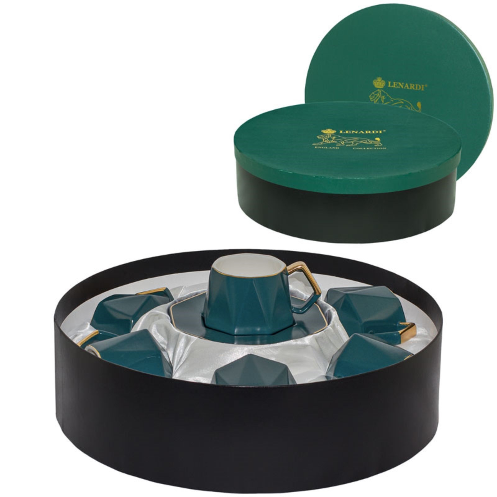 Чайный набор lenardi, 12 предметов. Изделие может иметь следующие несущественные дефекты: незначительный скол краски;прерывание и наплыв рисунка;наличие полосы на рисунке;потёртости и наплыв золотой краски на внутренней стороне;небольшие потёртости и царапины на глазури;засорения под глазурью;плотные вздутия глазури на внутренней поверхности;натёк глазури;наличие мушек (чёрных точек);неровность внутреннего отверстия;отклеивание страз;потёртость упаковки в уголках. Данные недостатки не влияют на свойства изделия при использовании. Цвет: Зелёный Количество персон: 6 В наборе, шт.: 12 Объём, мл: 230 Тематика: Полоски, полоса Материал: Фарфор Наличие подставки: Нет Можно мыть в посудомоечной машине: Нет Можно использовать в СВЧ-печи: Нет Текстура: С рельефом Тип: Чайный сервиз Особенности: С золотой отводкой Матовая поверхность: Да  развернуть описание ▼