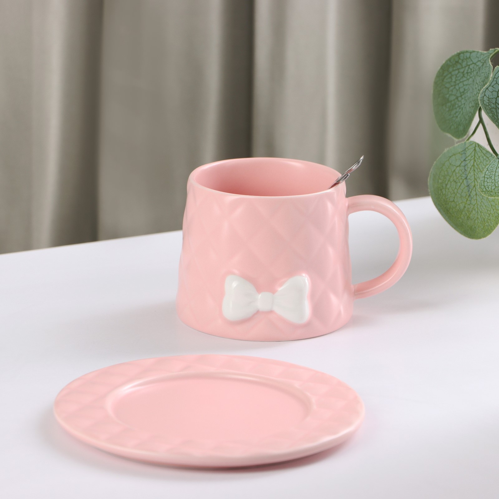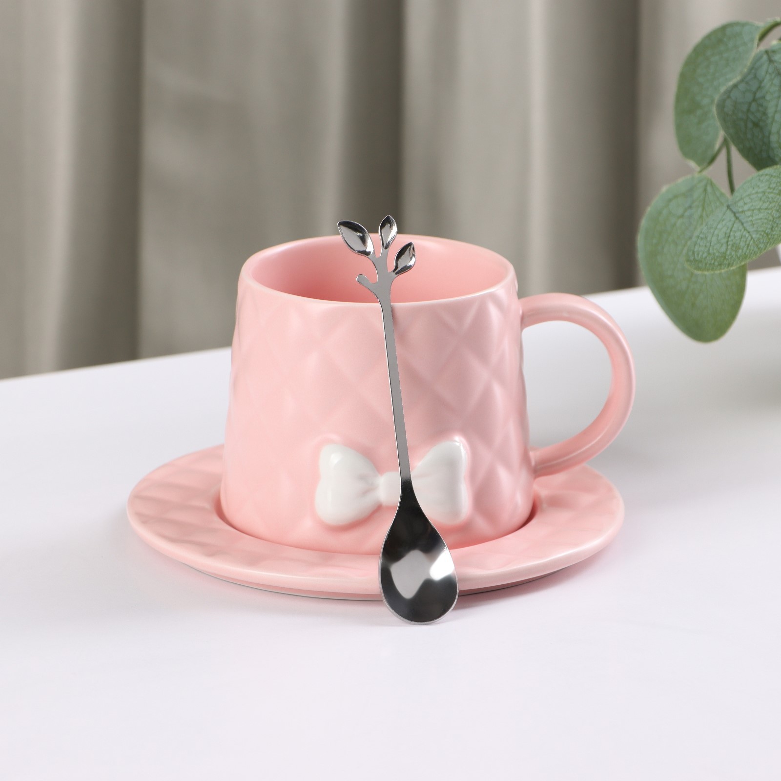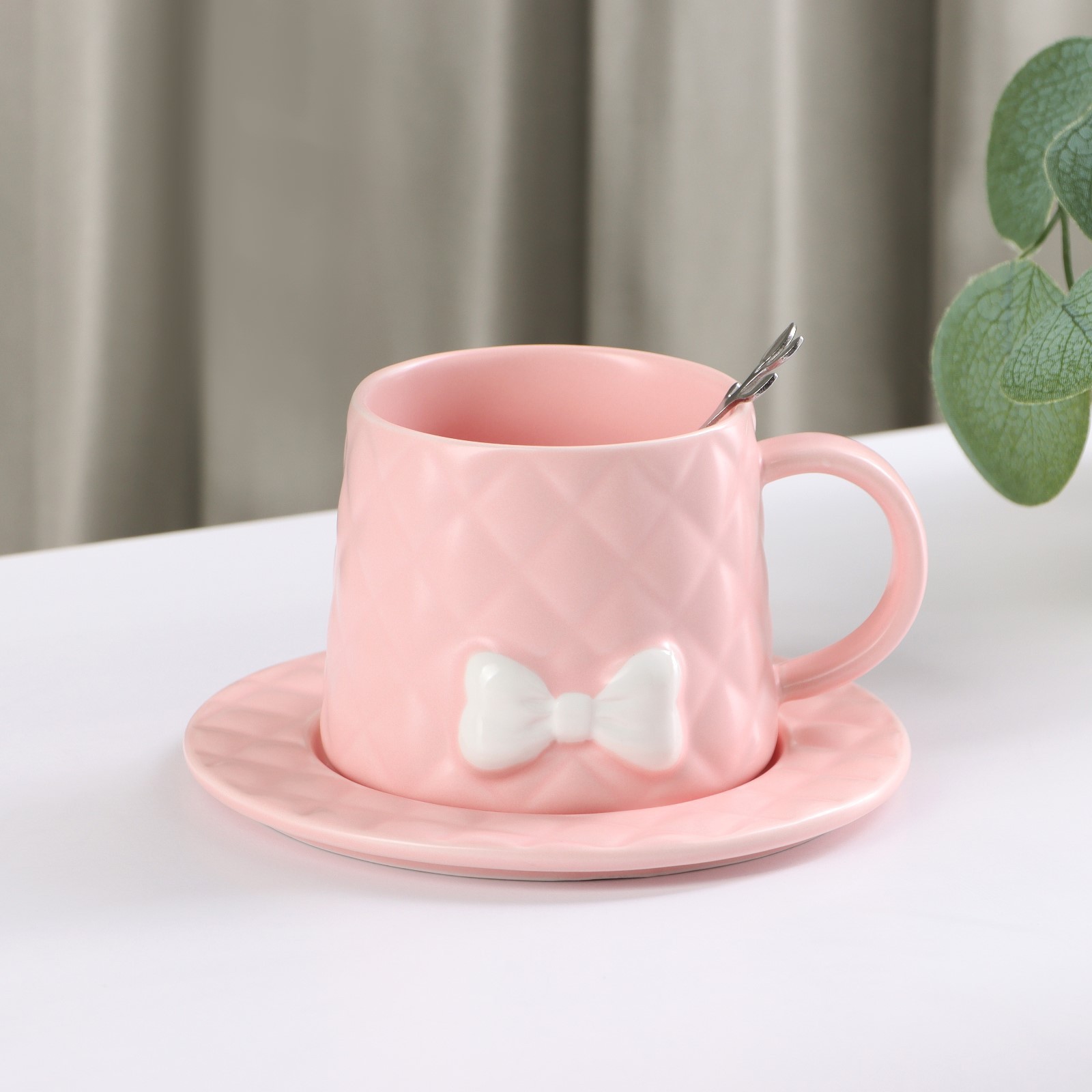 Чайная пара керамическая с ложкой «бантик», 2 предмета: кружка 350 мл, блюдце D=15 см, цвет розовый