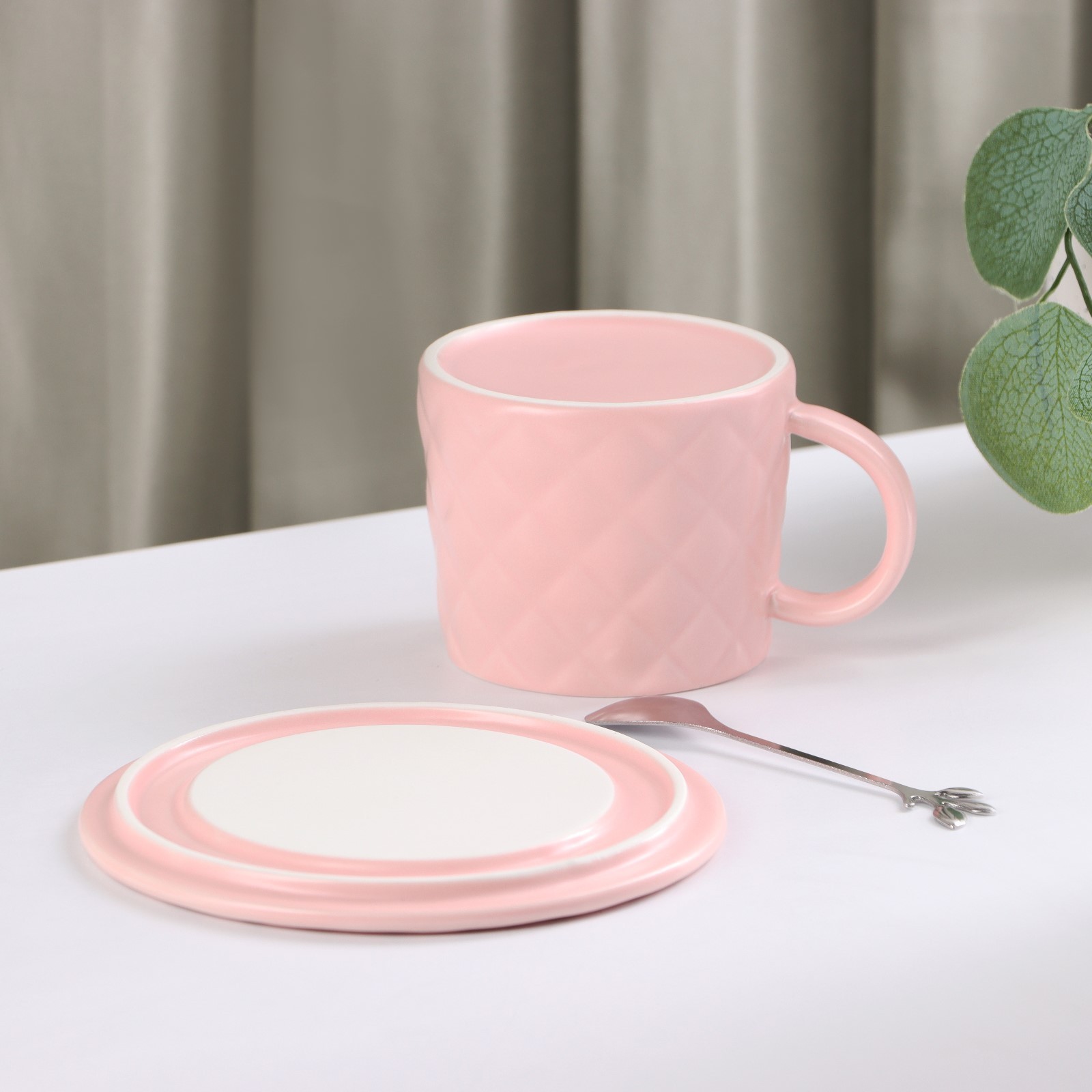 Чайная пара керамическая с ложкой «бантик», 2 предмета: кружка 350 мл, блюдце d=15 см, цвет розовый.
