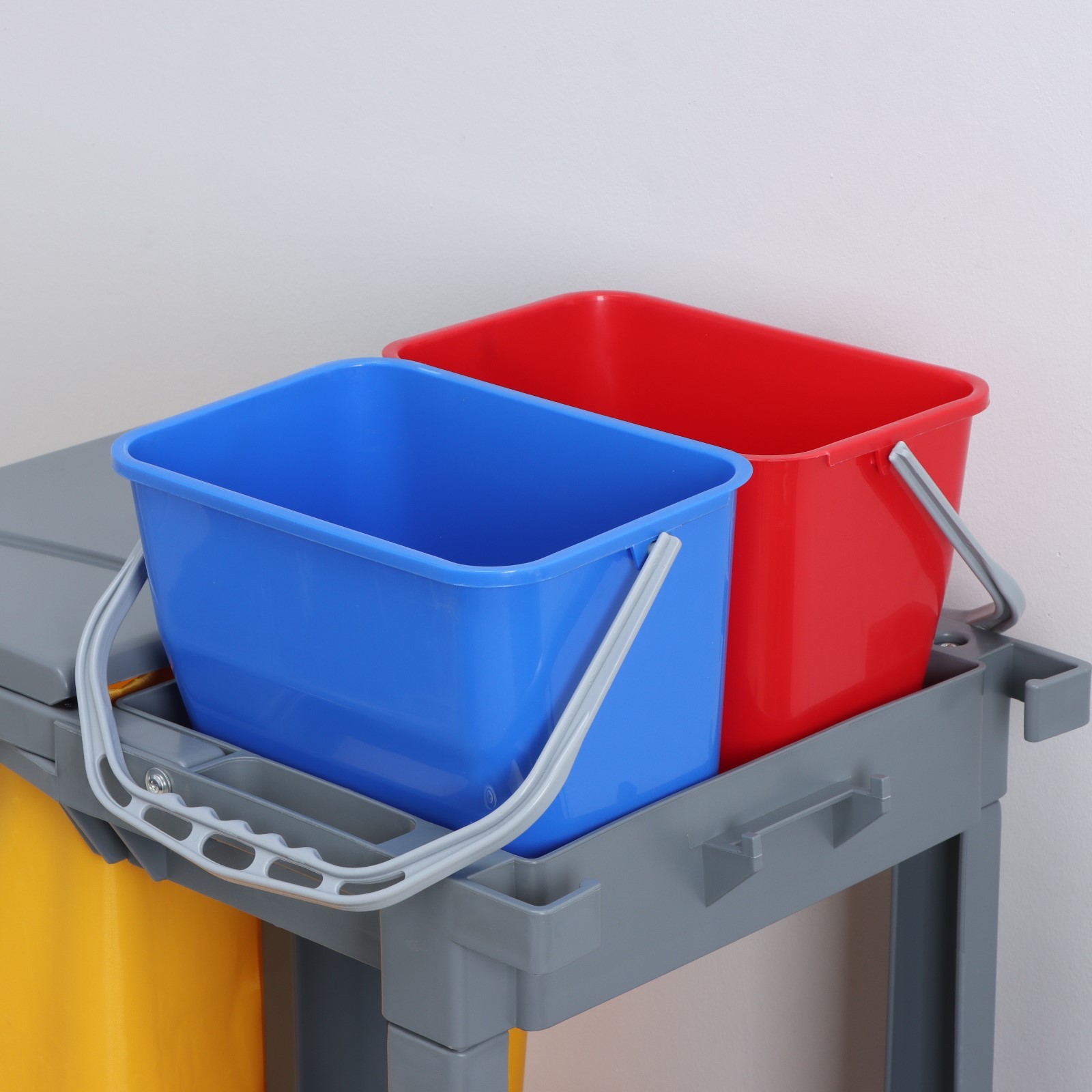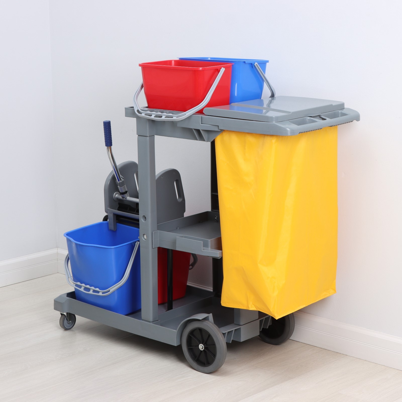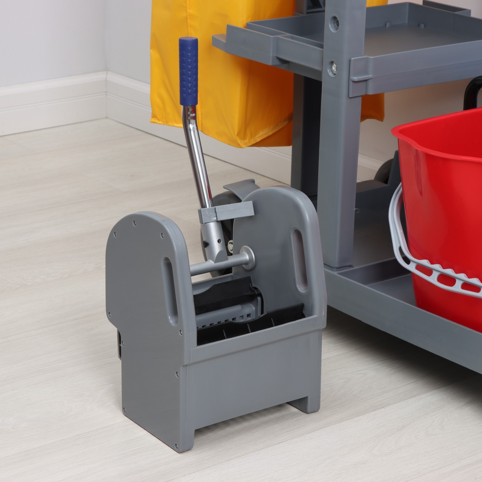 Многофункциональная тележка для клининга с вёдрами, отжимом и лотками, цвет серый