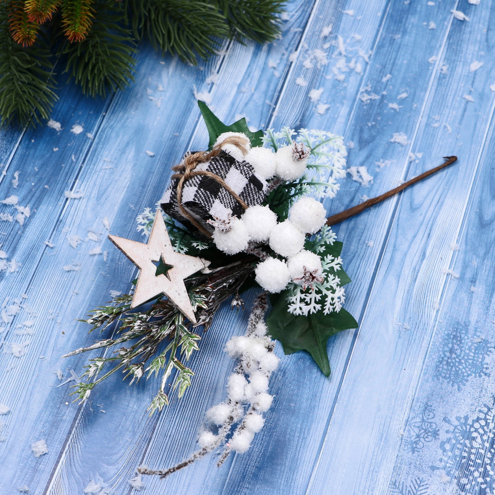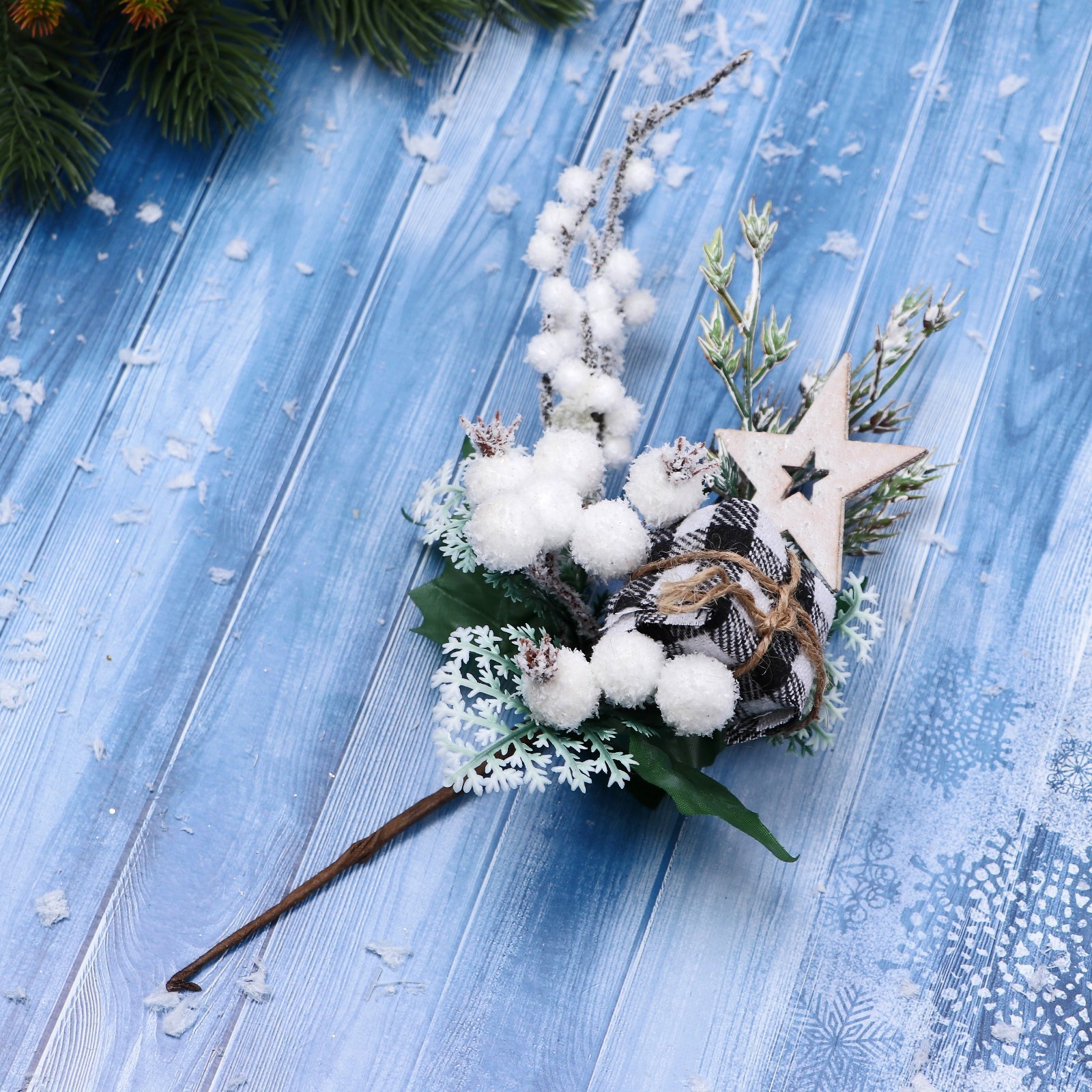 Эта декоративная ветка для новогодних украшений выполнена из пластика, бумаги и текстиля и имеет высоту 21 см. Ее белый цвет и стильное сочетание датского, классического, скандинавского и шебби-шик направлений создают атмосферу уюта и зимней сказки. Такой элемент отлично подойдет для оформления елок, зимних композиций и праздничных интерьеров в стиле минимализм или винтаж.