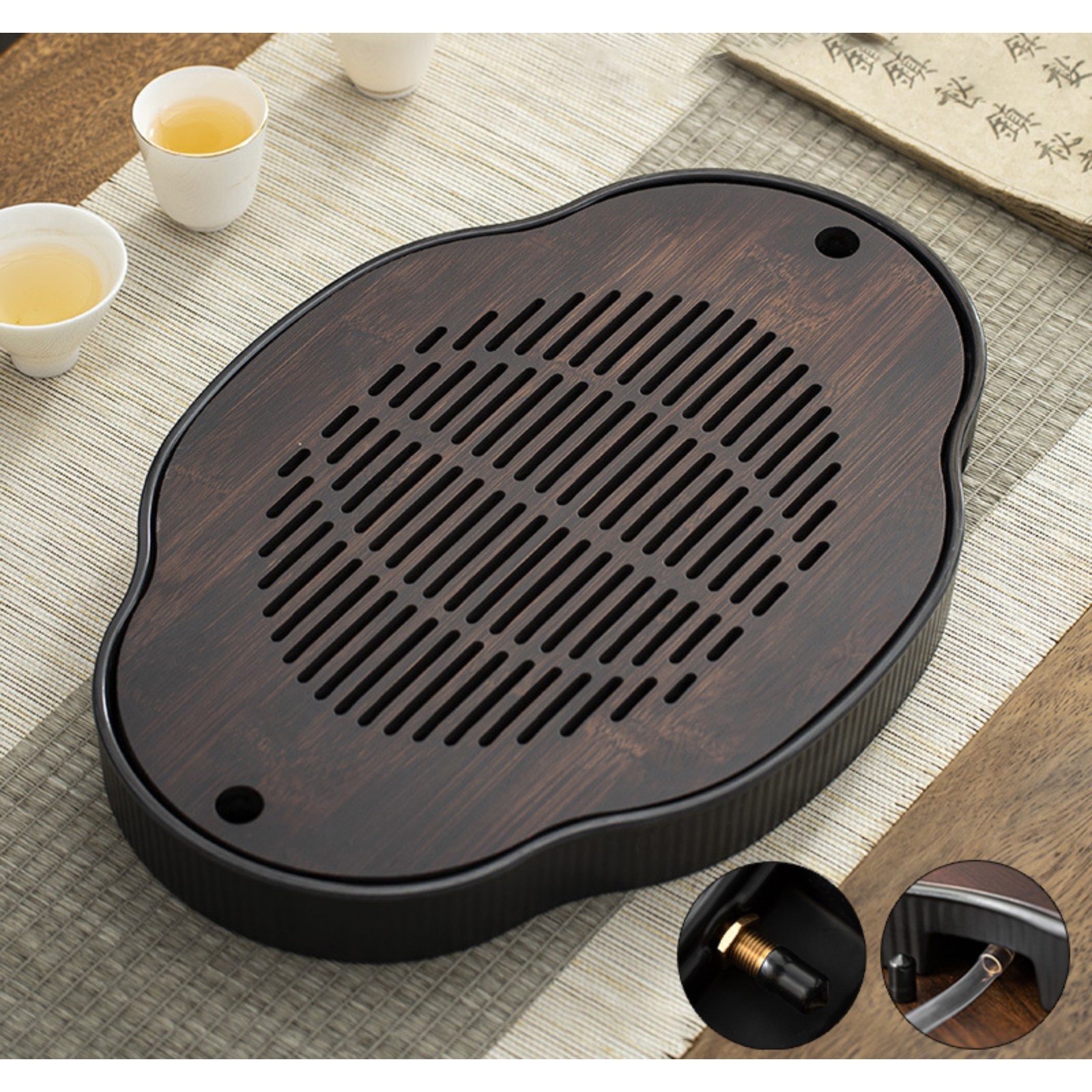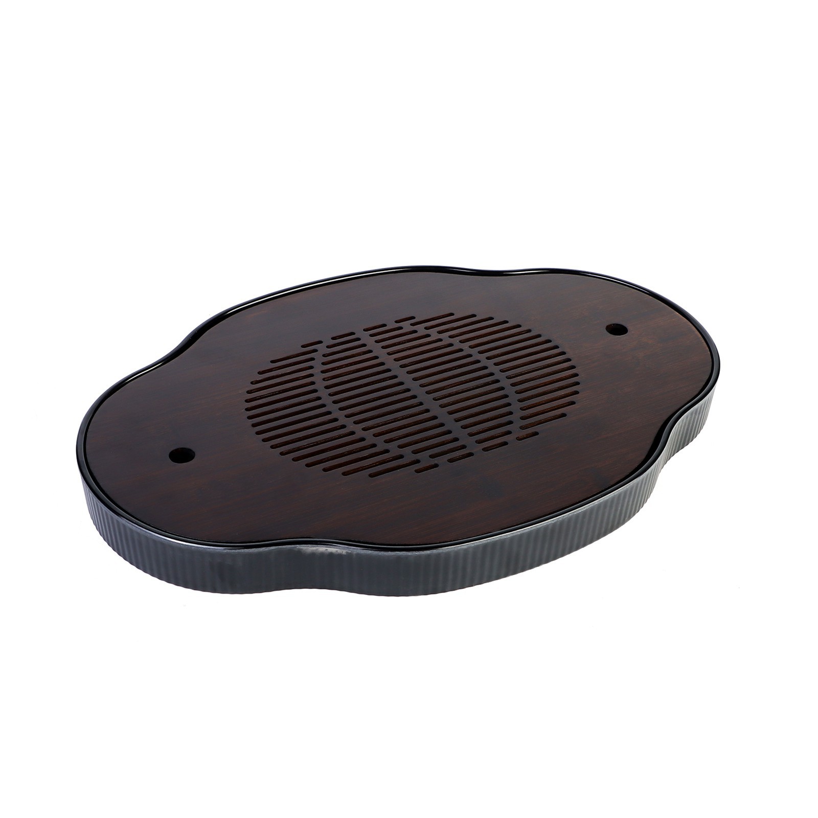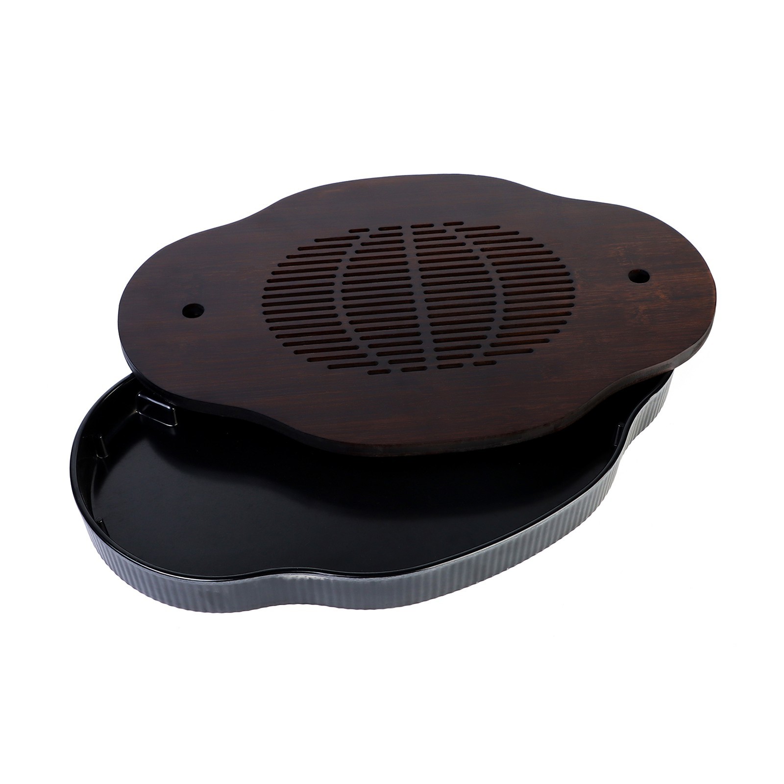 Поднос для чайной церемонии, 45 х 31 х 3.8 см, черный поддон. Желаете устроить чайную церемонию по всем правилам китайского чаепития? Вам необходим для этого процесса чабань! Это отличный подарок любителю китайской культуры и хорошего чая. Поднос (чабань) — один из атрибутов при заваривании чая. Служит чайным пространством, на котором расположена вся чайная утварь. Имеется слив для отвода жидкости из поддона. РЕКОМЕНДАЦИИ Не хранить под прямыми лучами солнцаВовремя опустошать поднос от влагиПротирать мягкой тряпочкой, особенно в стыкахНе ронять. Не царапать Цвет: Чёрный Цвет: Коричневый В наборе, шт.: 1 Количество персон: 2 Количество персон: 6 Материал: Бамбук Материал: Пластик  развернуть описание ▼