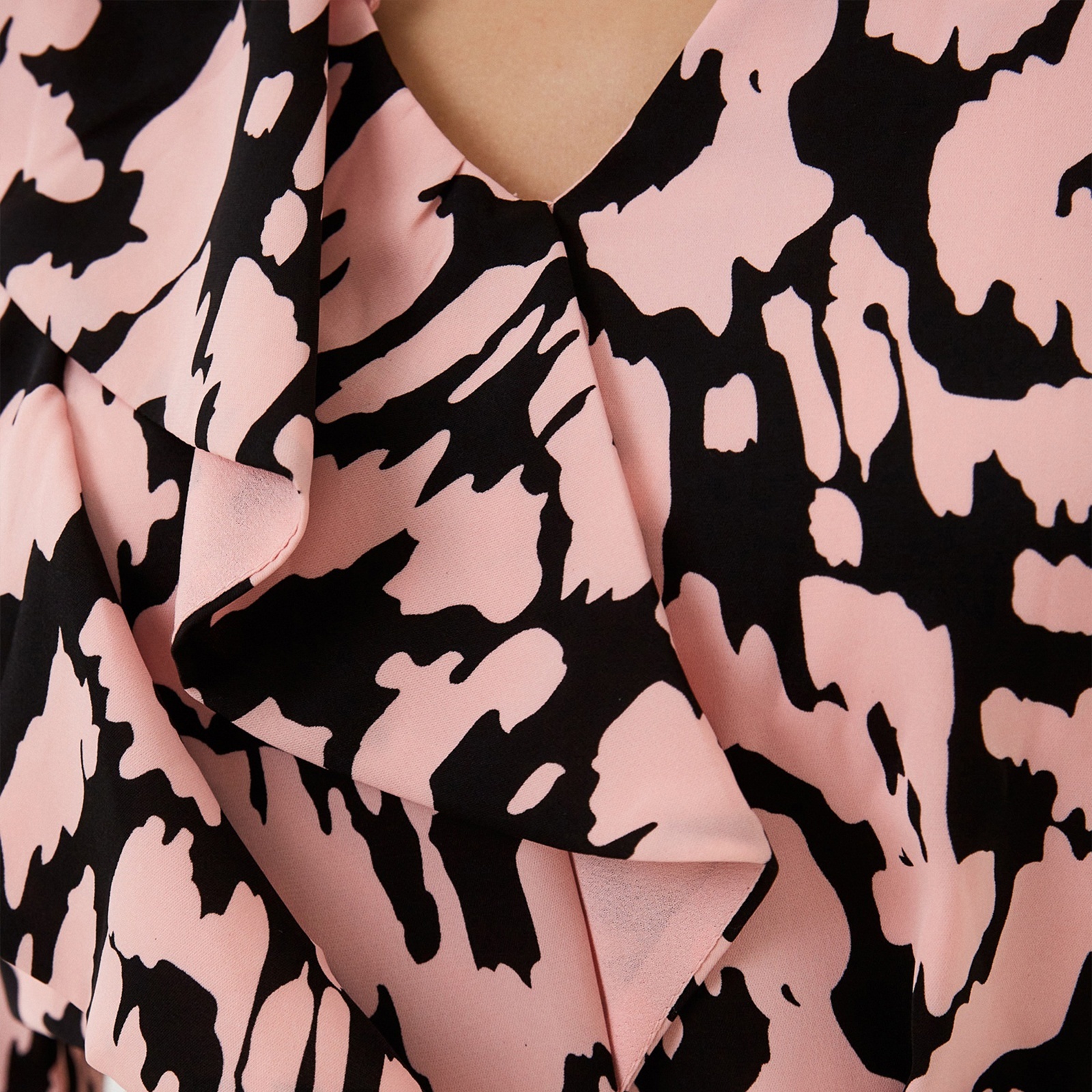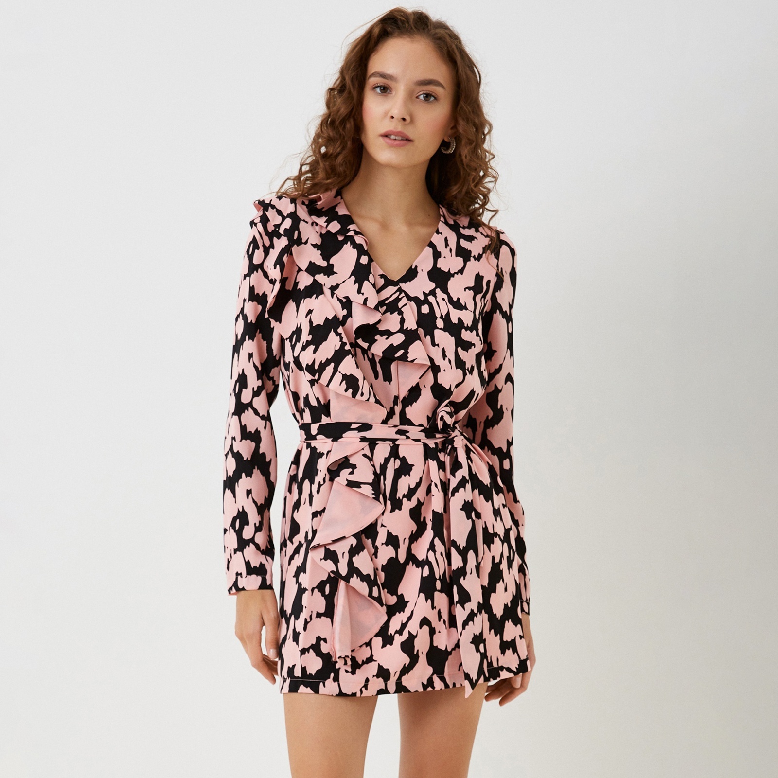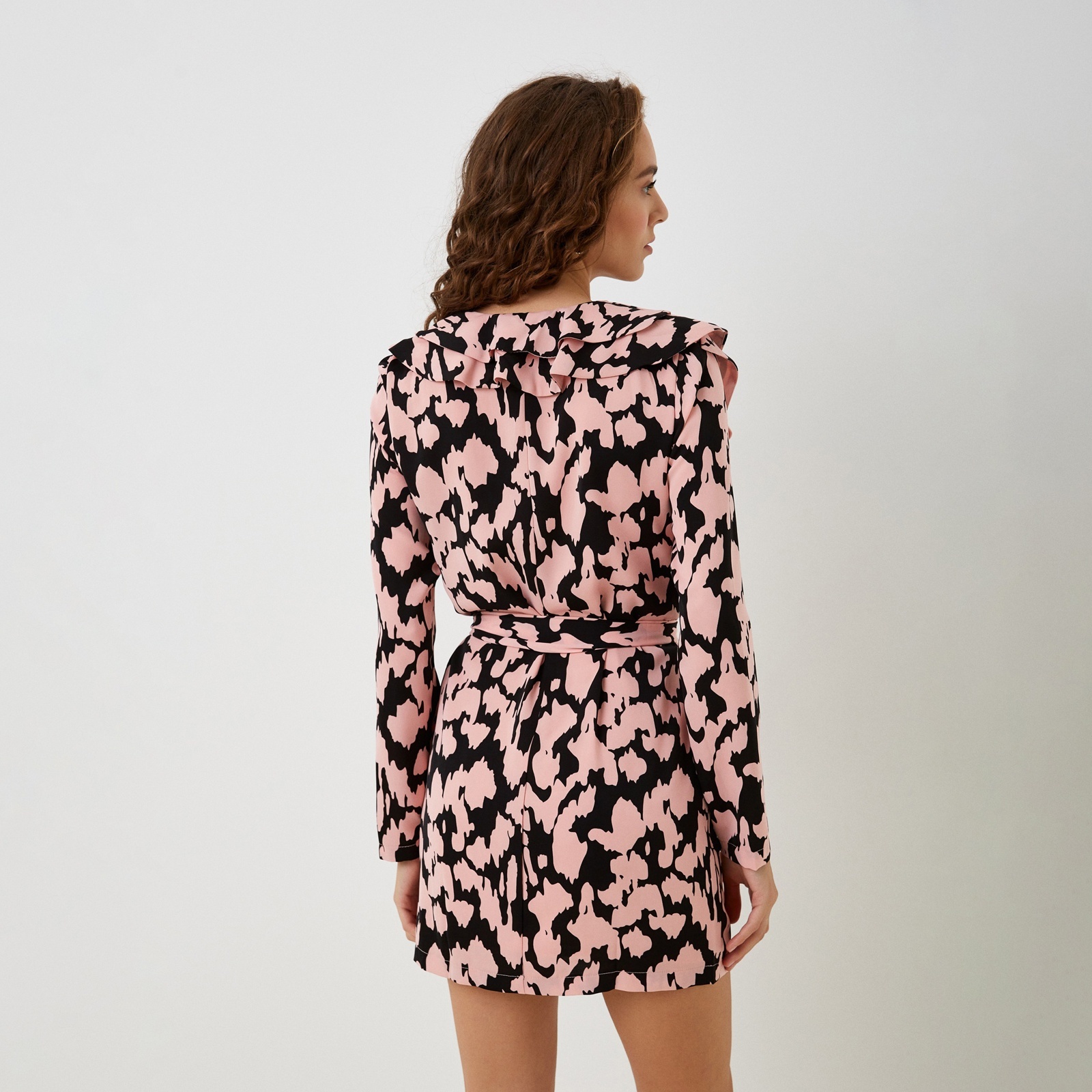 Платье женское с воланом mist, размер 48, розовый. Цвет:Розовый|Для кого:Для женщины|Назначение:Повседневная|Ткань:Поливискоза|Размер:48|Рост, см:165 - 175|Длина рукава, см:62.5|Рост модели на фото, см:170|Сезон:Всесезонный|Тематика:Узоры|Длина рукава:Длинный|Вырез горловины:V-образный|Декоративные элементы:Волан|Покрой:Приталенный|Тип рукава:Втачной|Рекомендации по уходу:Бережный режим глажки|Рекомендации по уходу:Не отбеливать|Рекомендации по уходу:Стирка при 30 °С|Состав ткани:Полиэстер|Длина юбки:Длина до колена|Длина юбки:Мини|Вид юбки:Прямая|Длина изделия по спинке, см:83|Обхват груди, см:104|Обхват бёдер, см:105|Параметры модели на фото (ОГ-ОТ-ОБ):81-59-89|Страна:Россия  развернуть описание ▼