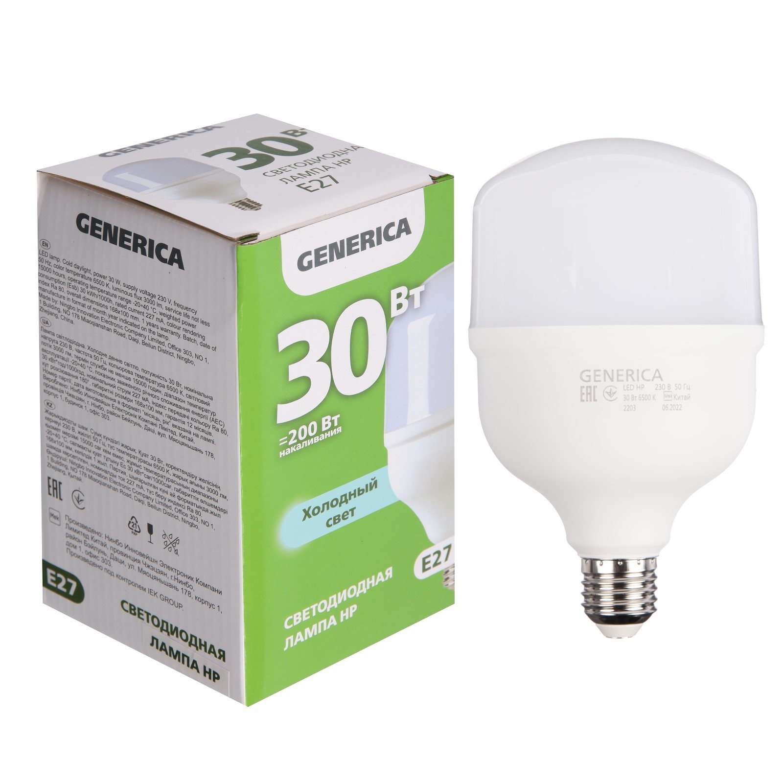 Лампа светодиодная Generica Hp, 30 вт, 6500 к, E27, 230 в, Ll-hp-30-230-65-e27-g