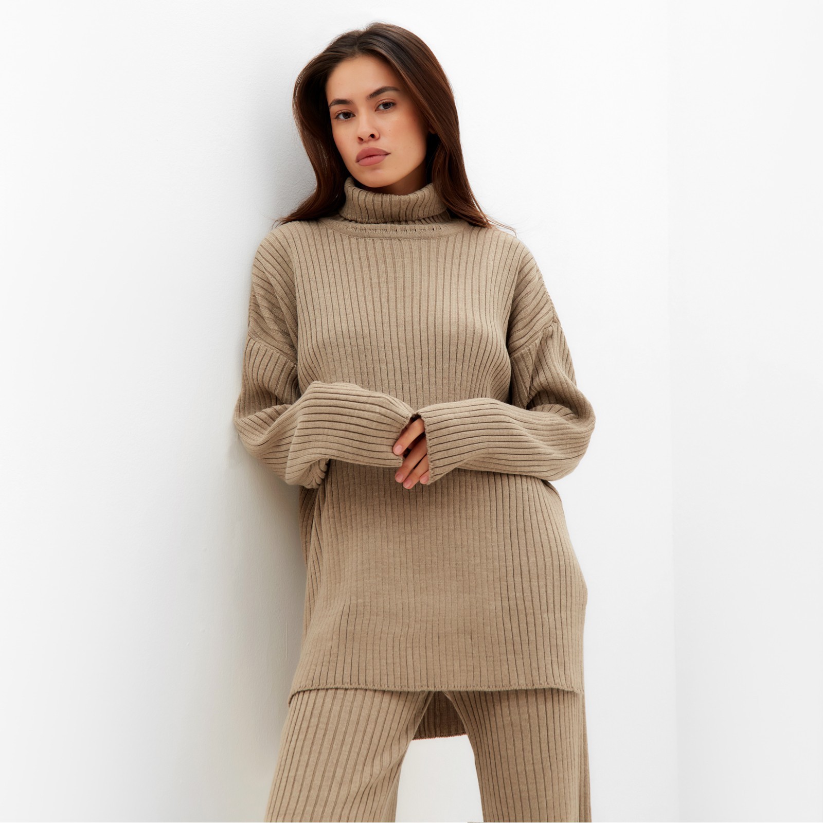 Костюм женский (свитер, брюки) mist, размер l (48-50), бежевый. Цвет:Бежевый|Для кого:Для женщины|Назначение:Повседневная|Ткань:Вязаный трикотаж|Размер:48|Размер:50|Рост, см:165 - 170|Рост модели на фото, см:170|Сезон:Демисезон|Сезон:Зима|Вид застёжки:Без застёжки|Тематика:Однотонная|Длина рукава:Длинный|Вырез горловины:Воротник-стойка|Декоративные элементы:Без элементов|Крой брючин:Расклешенный от бедра|Покрой:Прямой|Тип карманов:Без карманов|Тип рукава:Цельнокроеный|Рекомендации по уходу:Не отбеливать|Рекомендации по уходу:Стирка при 30 °С|Тип посадки:Высокая|Состав ткани:Акрил|Вид:Повседневный|Параметры модели на фото (ОГ-ОТ-ОБ):81-59-89|Страна:Россия  развернуть описание ▼