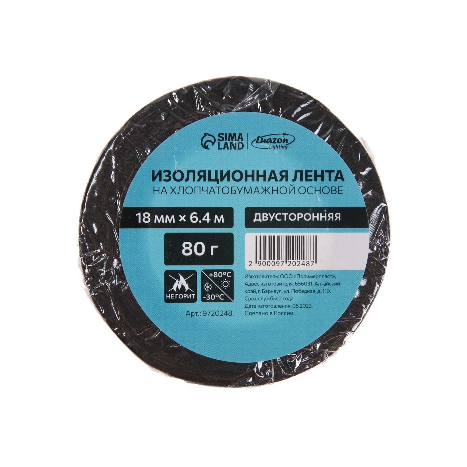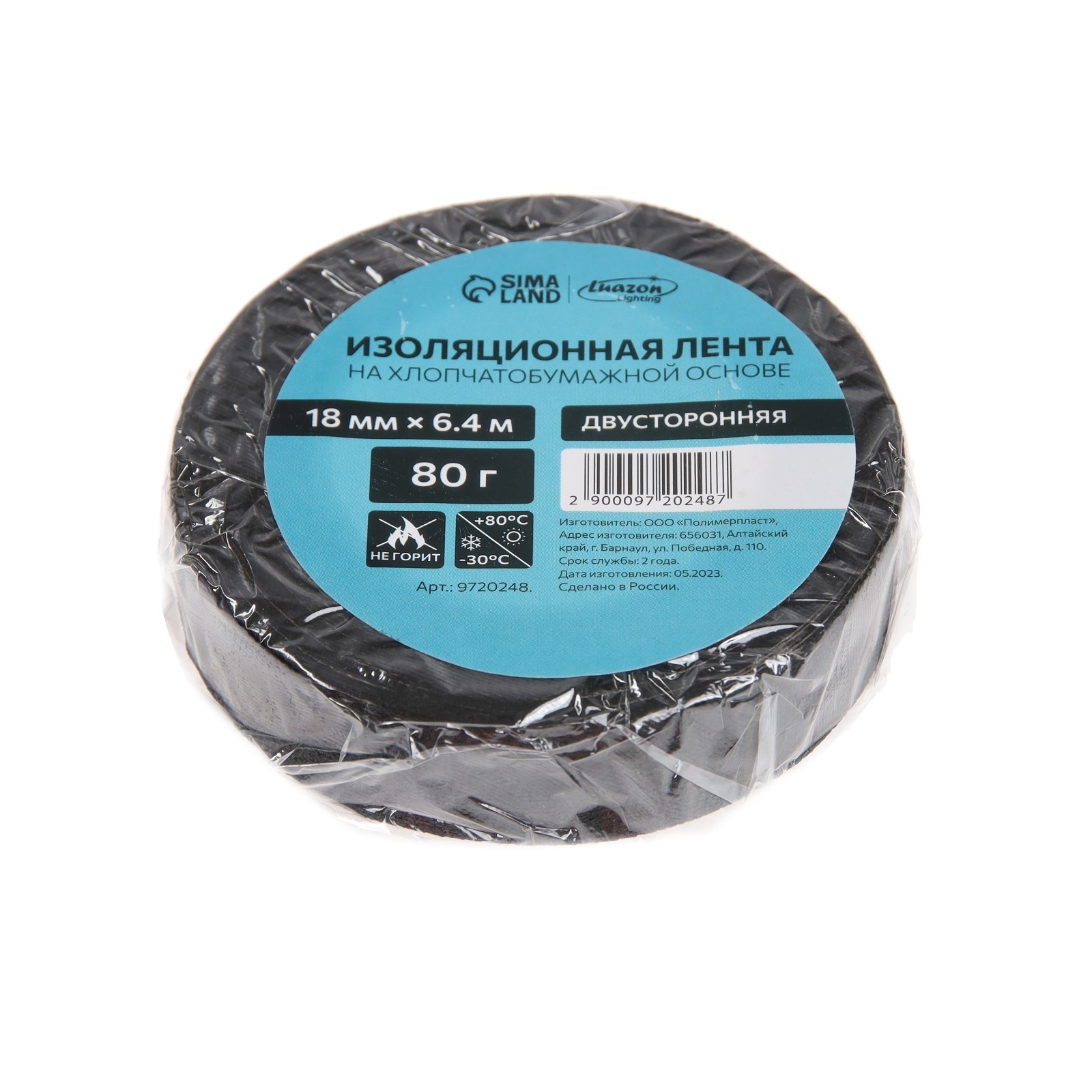 Изолента luazon lighting, хб, 80 г, 18 мм 6.4 м, двусторонняя обычной липкости. Цвет:Чёрный|Длина, м:6.4|Ширина, мм:18|Материал:Хлопок|Тип клейкой ленты :Двусторонняя|Страна:Китай