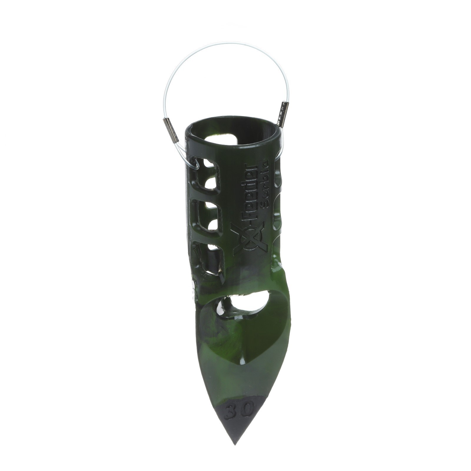 Груз-кормушка пластиковая x-feeder pl camo serbia m, цвет камо, 30 г, 37 мл. X-Feeder Serbia - фидерная кормушка-пуля, известная как «сербская пуля» или «кристалл». Она выполнена из пластика и имеет модернизированную форму, благодаря которой эта кормушка еще лучше летит и всплывает. Особенности: Кормушка имеет удлиненную форму с далеко вынесенным вперед грузом, что улучшает дальность и точность полета;Груз выполнен в форме трехлезвенного наконечника стрелы с углом острия всего 12 градусов и очень эффективно пробивает воздух;Треугольная форма груза гидродинамически эффективна – она одновременно выполняет функции и киля, и наклонных плоскостей, генерирующих подъемную силу, и отводит поток воды, проходящий сквозь корпус кормушки;Крупные отверстия размером 10*10 мм позволяют кормушке быстро освобождаться от прикормки;Отверстия корпуса расположены специальным образом для снижения сопротивления в воде и улучшения всплытия;Кормушка изготавливается не вручную, а методом литья в формы, отфрезерованные по 3D-модели, поэтому груз идеально соосен корпусу и отбалансирован;Груз залит в пластик, поэтому стыки идеально ровные, а груз держится очень прочно;Леска закреплена на станочном оборудовании и вставлена в специальные отверстия на внешней стороне корпуса, поэтому более эргономична и не мешается при заполнении кормушки прикормкой;Кормушка тихо входит в воду, не пугая рыбу, и быстро тонет, донося прикормку до дна. Вес, г: 30 Материал: Пластик Температурное ограничение: Нет  развернуть описание ▼