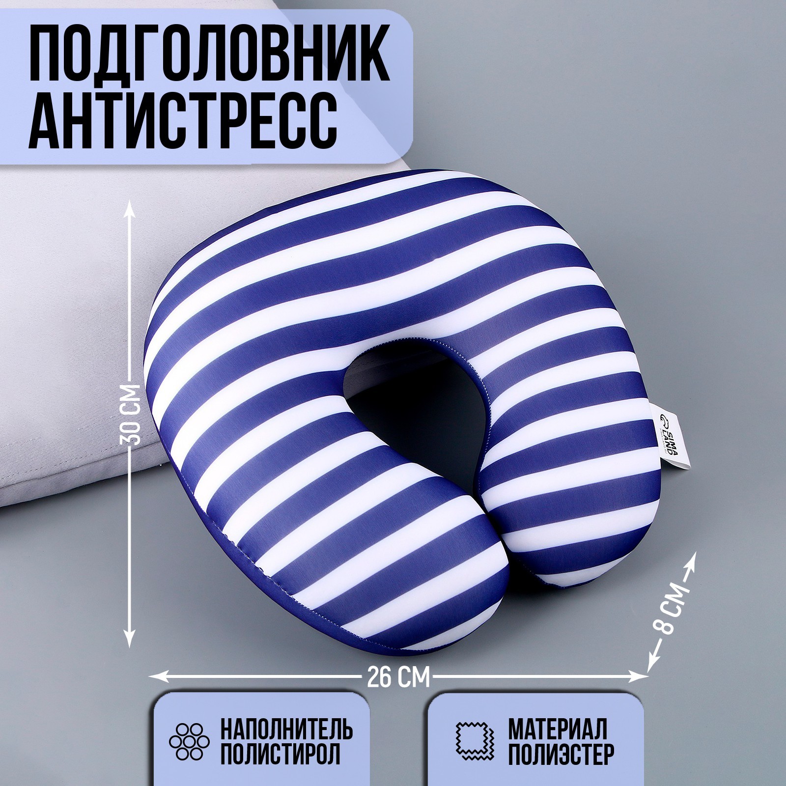 Подушка для путешествий антистресс «полосатый рейс». Подушка для путешествий - необходимый аксессуар для тех, кто много путешествует, проводит много часов за рулем и просто в переездах. Она идеально поддерживает шею, предотвращая неприятные ощущения и усталость, а также дает возможность отдохнуть даже в самых трудных условиях. Подушка легко помещается в ручную кладь и занимает минимум места, поэтому можно взять в самолет, машину, и даже в поездку на поезде. Цвет: Синий Для кого: Унисекс Материал: Полистирол Материал: Полиэстер Особенности: Подголовники Температурное ограничение: Нет  развернуть описание ▼