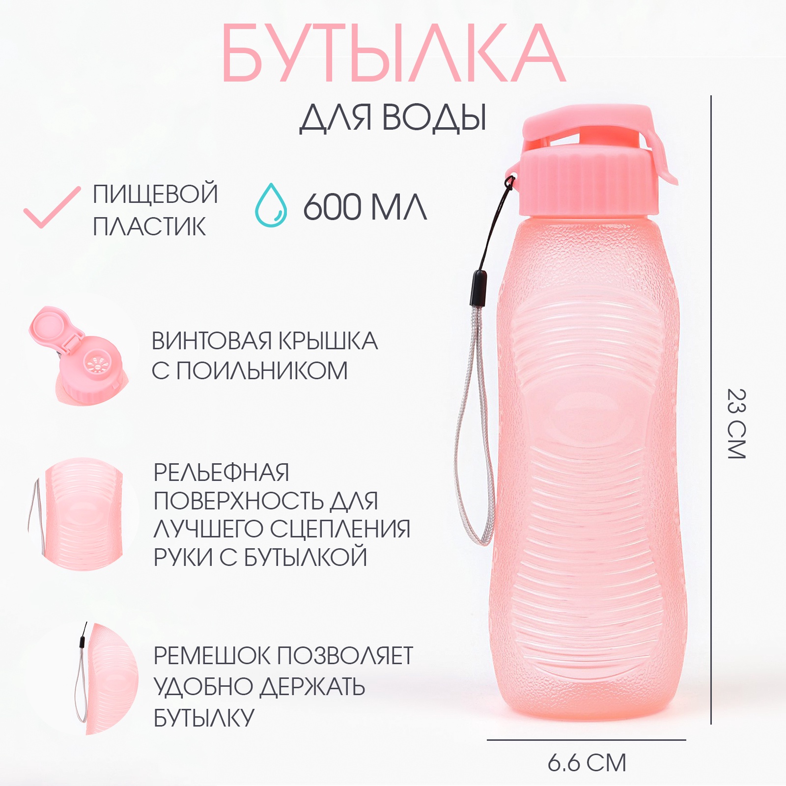 Бутылка для воды, 600 мл, 23 х 6.6 см, розовая. Бутылка для воды — это удобный и практичный аксессуар, предназначенный для хранения и переноски жидкости. Она изготовлена из качественного и безопасного пищевого пластика. Бутылка оснащена крышкой, которая обеспечивает герметичность и предотвращает протекание. Благодаря своей компактности и лёгкости, она идеально подходит для использования в повседневной жизни, особенно во время занятий спортом или активного отдыха. Цвет: Розовый Объём, мл: 600 Материал: Пластик Вид: Бутылка Особенности: На подвесе  развернуть описание ▼