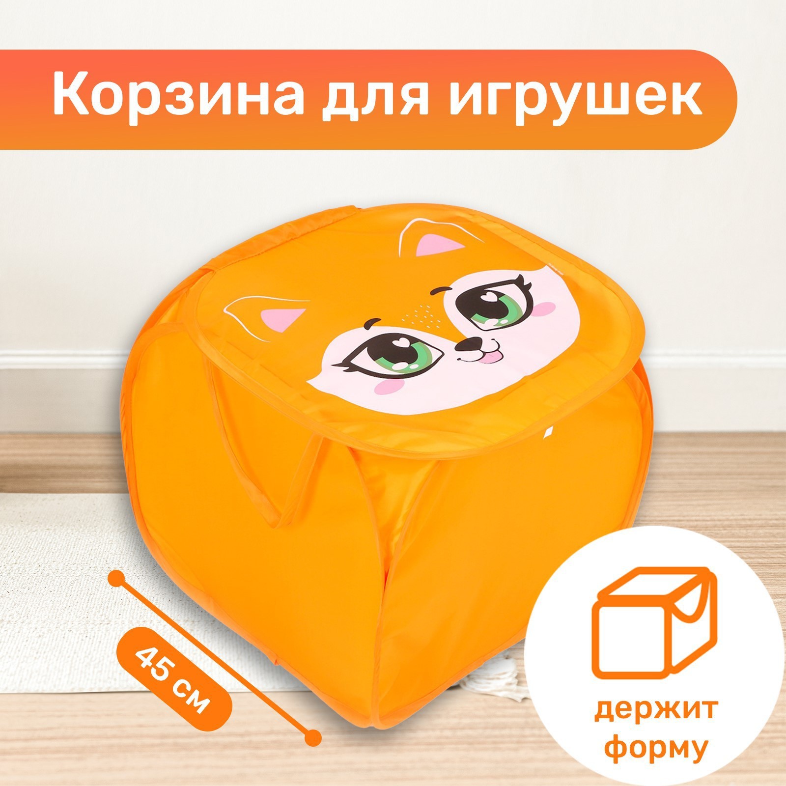 Корзина для хранения игрушек «лисёнок» с крышкой, 45 х 45 х 43 см, оранжевая.   Корзина предназначена для хранения игрушек и других важных вещей малыша. Она поможет поддерживать чистоту в доме и приучить ребёнка к порядку. Прочные и лёгкие материалы делают предмет незаменимым в детской комнате.  Такая корзина пригодится в поездках: в ней будет удобно собрать любимые игрушки, с которыми чадо не может расстаться ни на минуту. Она компактна, но вместит всё необходимое, и вещи не рассыплются в дороге. Если изделие стало ненужно, его можно сложить, так оно займёт совсем немного места.  Цвет: Оранжевый Форма: Параллелограмм Ширина, см: 47 Глубина, см: 43 Высота, см: 47 Тематика: Животный мир Крышка: Да Материал: Полиэстер Основной материал: Текстиль Форма: Параллелограмм  развернуть описание ▼