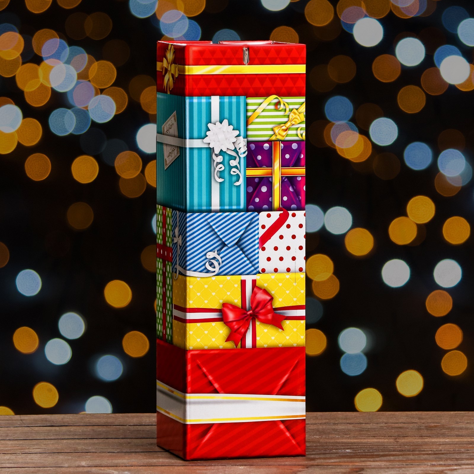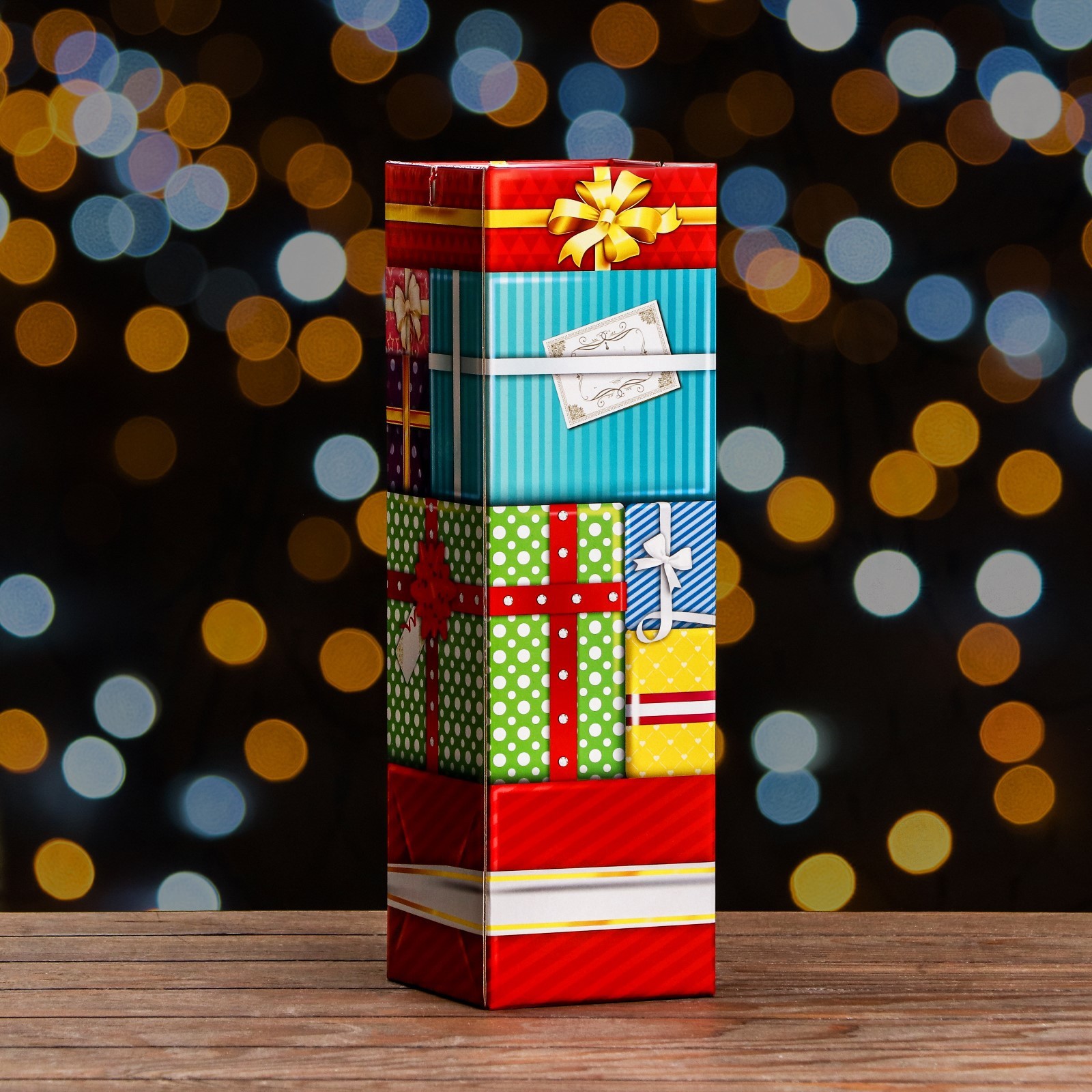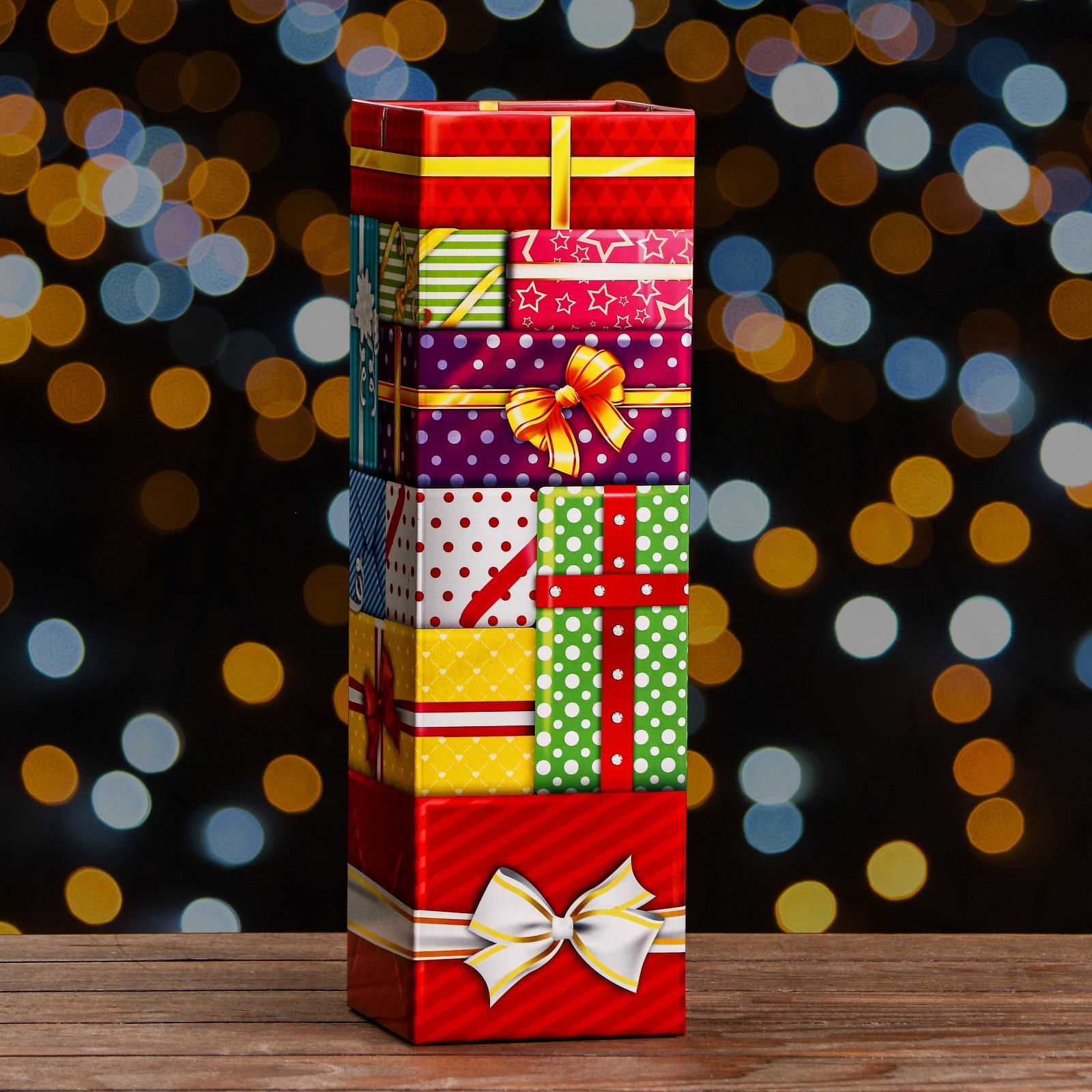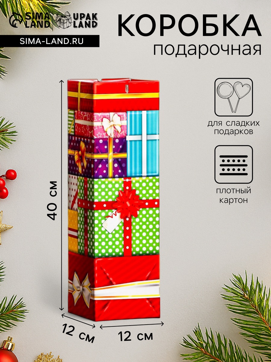 Подарочная новогодняя коробка «подарки» , башня для сладких подарков, 12 12 40 см. Подарочная новогодняя коробка предназначена для использования на утренниках и для подарков под ёлку для детей. Эта коробка создана специально для того, чтобы сделать праздник еще более ярким и запоминающимся. Коробка выполнена из качественных материалов, которые обеспечивают сохранность содержимого. Она имеет яркий и красочный дизайн, который отражает атмосферу Нового года. Эта коробка идеально подходит для упаковки конфет, сладостей, игрушек и других небольших подарков. Она может использоваться как самостоятельный подарок или как часть большого презента. Подарочная новогодняя коробка - это не просто упаковка, это способ создать волшебство и ощущение праздника. Она помогает передать детям радость и ожидание чуда, которое всегда ассоциируется с Новым годом. Вид упаковки:Для шоколада|Вид упаковки:Для печенья|Вид упаковки:Для конфет|Цвет:Разноцветный|Форма:Прямоугольная|Форма:Фигурная|Длина, см:12|Ширина, см:12|Высота, см:40|Отделка:УФ-лак|Тематика:Рождественская|Тематика:Новогодняя|Рисунок:Да|Символ года:Нет|Тематика праздника:Рождество|Тематика праздника:Новый год|Материал:Микрогофрокартон|Материал:Картон|Вид:Кондитерские коробки|Вид еды:Для шоколада|Вид еды:Для конфет|Вид еды:Для печенья|Вид:Фигурные|Вид:Прямоугольные|Вид:Складные коробки|Размер:Большой (25-45 см)|Вместимость, г:1900|Окошко:Нет|Крышка-дно:Нет|Страна:Россия  развернуть описание ▼