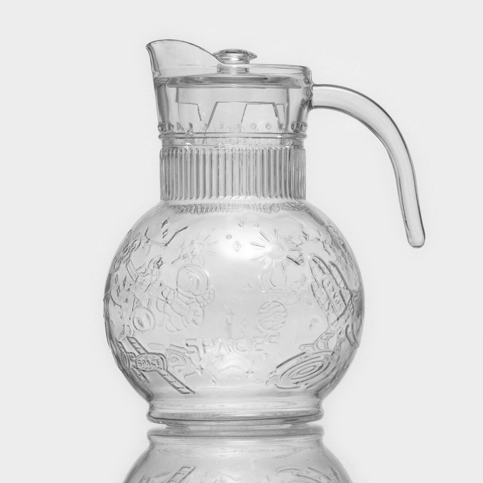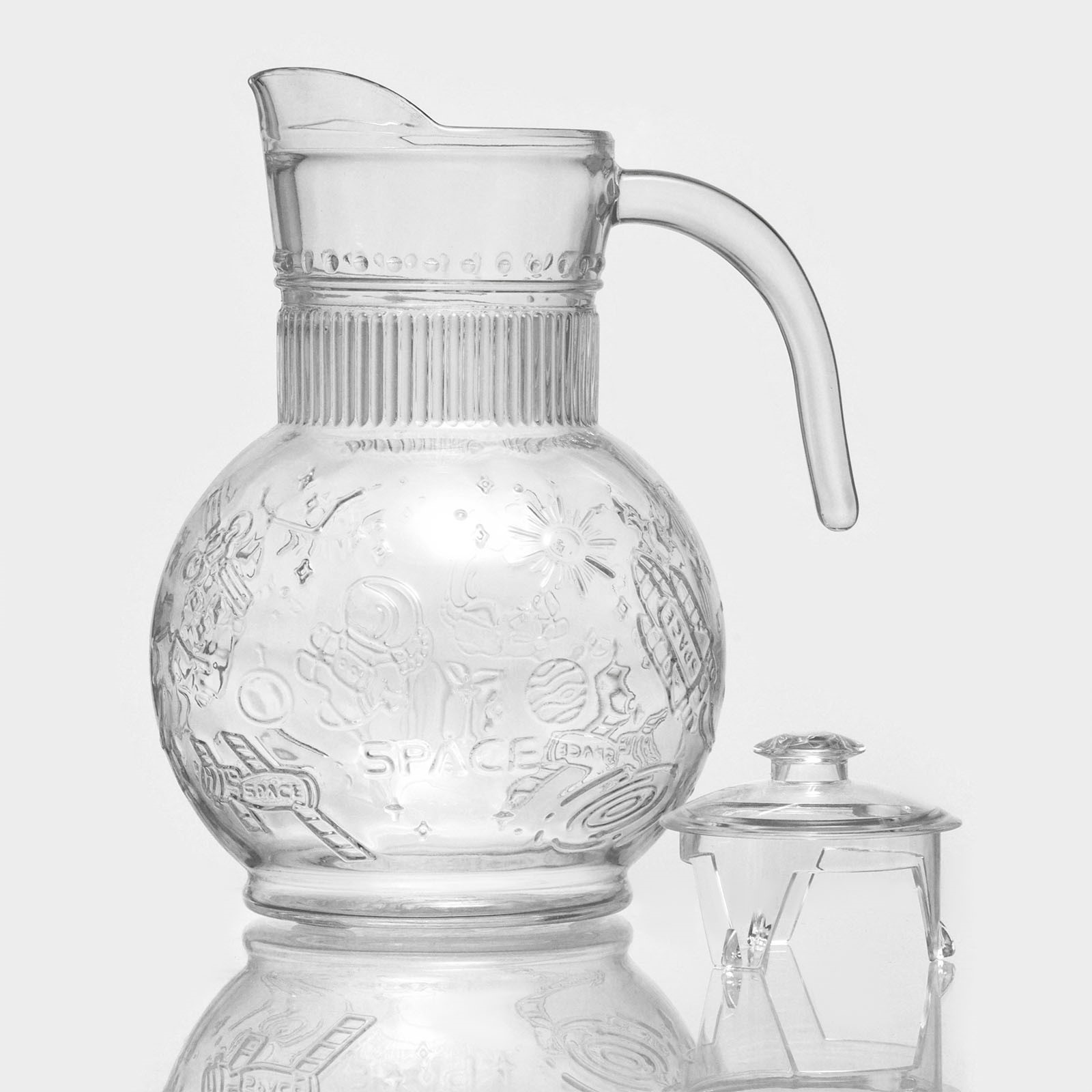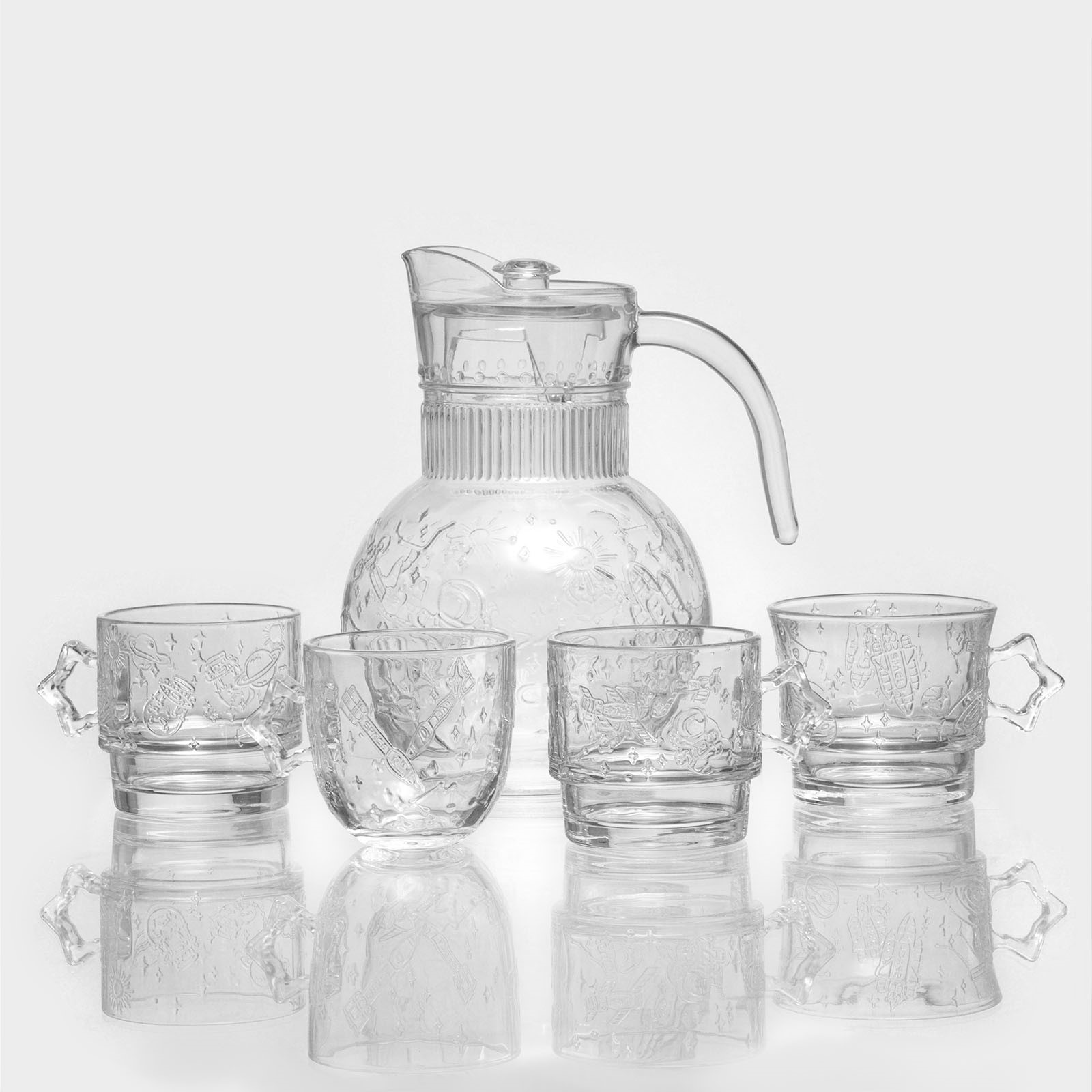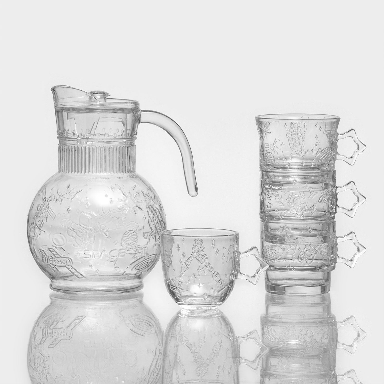 Набор для напитков из стекла «космос», 5 предметов: кувшин 1,9 л, 4 кружки 300/280/280/250 мл. Питьевой набор «Космос» помимо звёздного дизайна отличается большой функциональностью и экологичностью материалов. Изделия подойдут для повседневного использования и праздников. Особенно хорошо набор будет смотреться на тематических вечеринках. Кувшин, стакан и четыре кружки разных объёмов выполнены из прочного стекла; крышка-фильтр обеспечивает удобство в подаче компотов, морсов и лимонадов. Особенности: прозрачный корпус ёмкостей;эргономичная форма ручек;несколько вариантов объёма чашек;стойкость к запахам. Поверхность не окисляется, не вступает в реакцию с напитками. Удобный сливной носик делает использование посуды простым и комфортным. Цвет: Прозрачный В наборе, шт.: 5 Объём, мл: 250 Объём, мл: 280 Объём, мл: 300 Объём, мл: 1900 Тематика: Космос Тематика: Звёзды Крышка: Да Материал крышки: Стекло Материал: Стекло Можно мыть в посудомоечной машине: Нет Можно использовать в СВЧ-печи: Нет Текстура: С рельефом Особенности: С барельефом  развернуть описание ▼