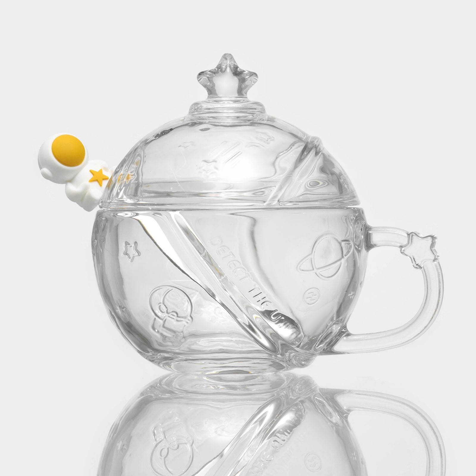 Кружка стеклянная с крышкой и ложкой «космос», 350 мл. Стеклянная кружка «Космос» помимо звёздного дизайна отличается большой функциональностью и экологичностью материалов. Круглая ёмкость подойдёт не только для подачи напитков и десертов, но и хранения джемов, варенья, мёда, сахара и орехов. Металлическая ложка с крышкой обеспечивают удобство в эксплуатации изделия. Фигурка в форме космонавта является ярким дополнением чашки. Данное изделие станет отличным подарком для детей и взрослых. Кружку не рекомендуется мыть в посудомоечной машине и использовать в микроволновой печи. Цвет: Прозрачный parts count: 0 В наборе, шт.: 1 Объём, мл: 350 tnved: 7013379100 Тематика: Звёзды Тематика: Космос Крышка: Да Материал крышки: Стекло Материал: Стекло Дополнительный аксессуар: Ложка Дополнительный аксессуар: Крышка Для детей до 3 лет: Нет Можно мыть в посудомоечной машине: Нет Можно использовать в СВЧ-печи: Нет Текстура: С рельефом Особенности: С барельефом  развернуть описание ▼