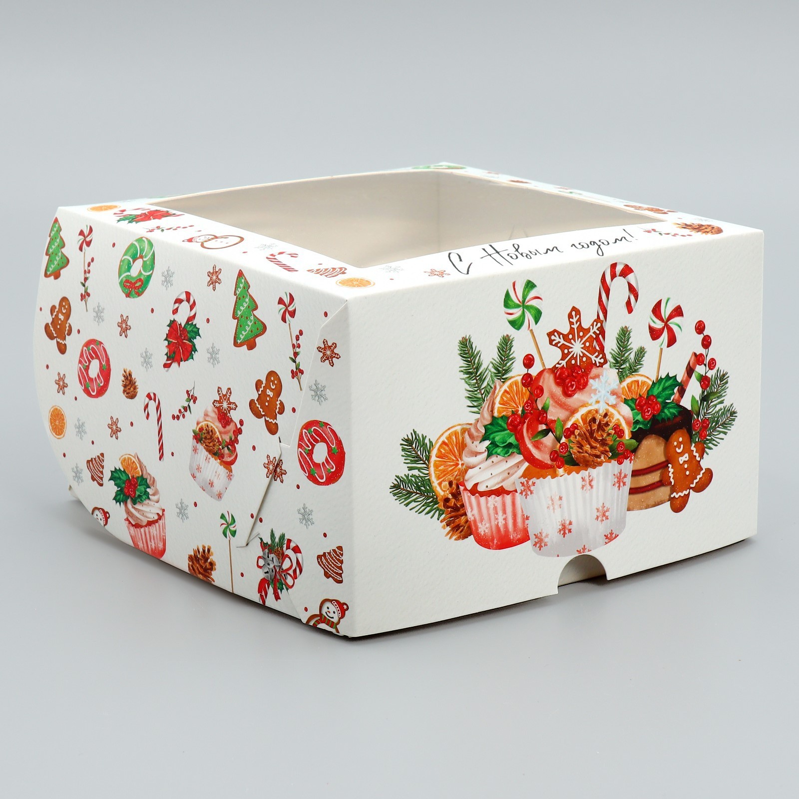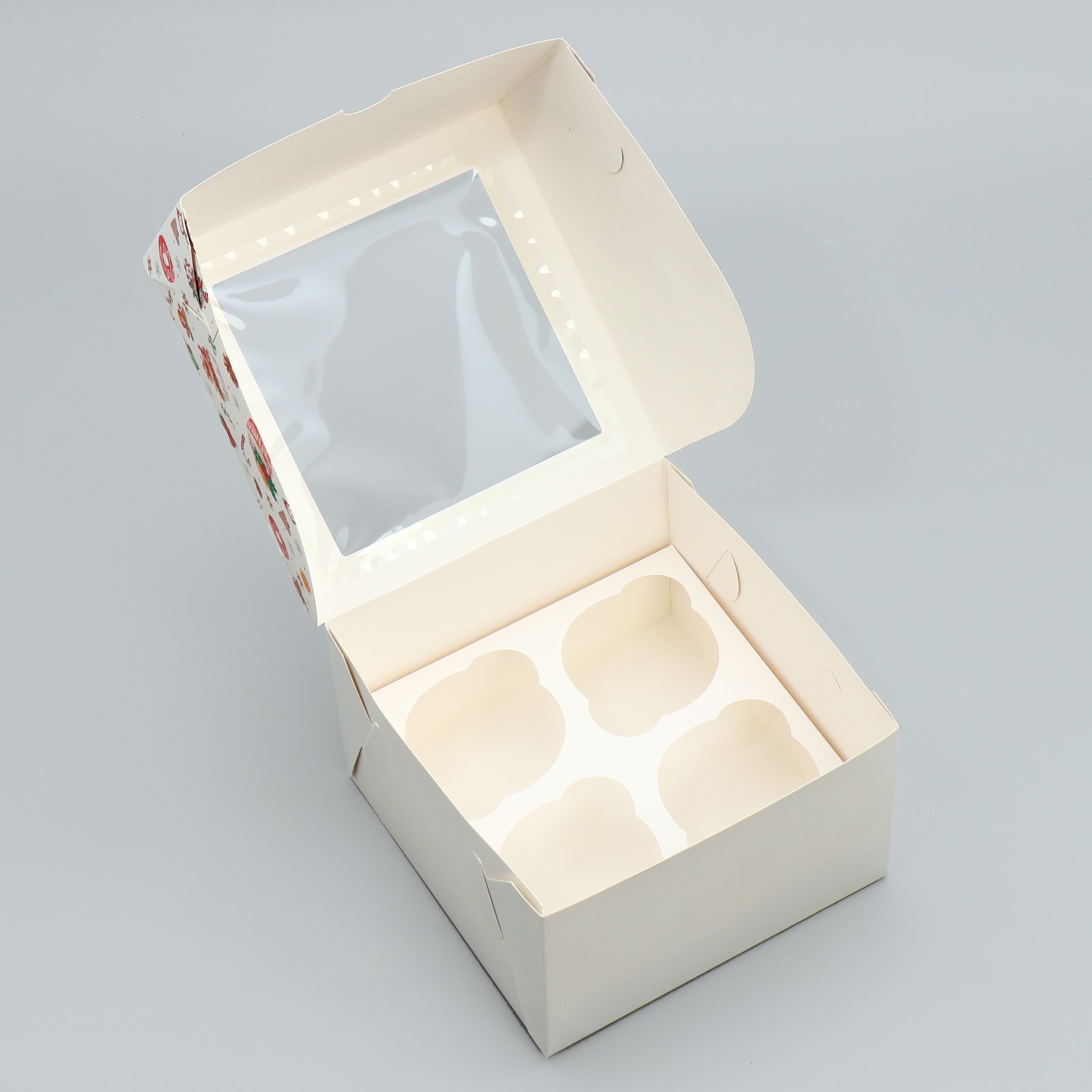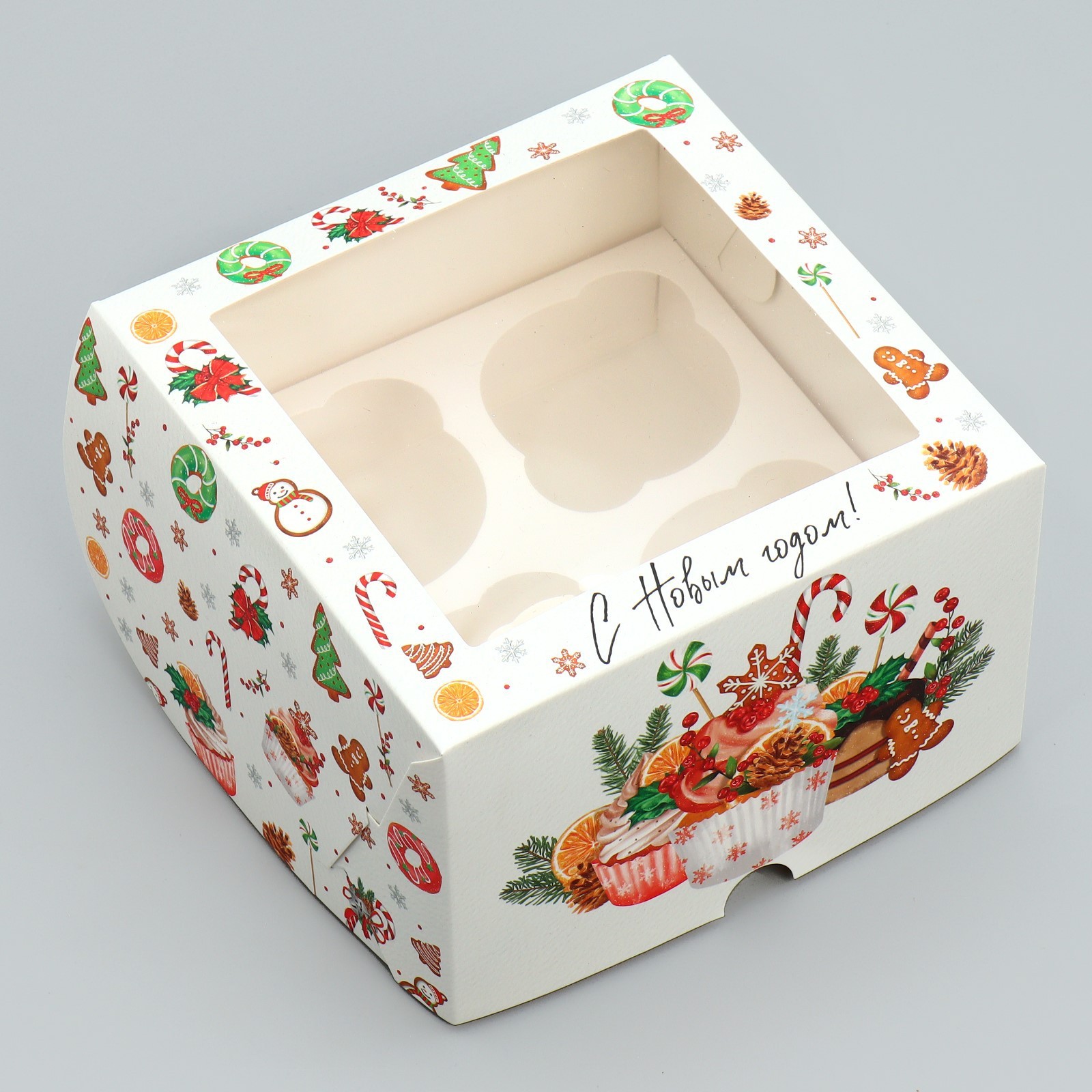 Коробка складная на 4 капкейка с окном «с новым годом!», сладости, 16 х 16 х 10 см. Размер одной ячейки, без учёта выемки под пальцы, ~6,5 см.Вид упаковки:Для капкейков|Цвет:Разноцветный|Цвет:Белый|Форма:Квадратная|Плотность, г/м :250|Длина, см:16|Ширина, см:16|Высота, см:10|Вместимость, шт.:4|Допустимый вес вложения, г:600|Тематика:Новогодняя|Символ года:Нет|Тематика праздника:Новый год|Материал:Пластик|Материал:Картон|Вид:Кондитерские коробки|Размер:Малый (11-17 см)|Страна:Китай  развернуть описание ▼
