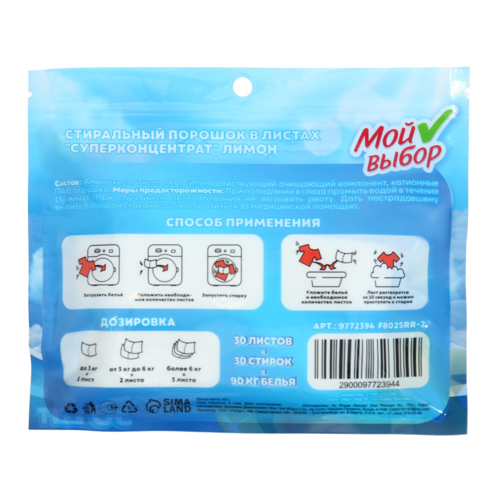 Стиральный порошок в листах, мой выбор, универсальный, лимон, концентрат, 30 листов. Стиральный порошок в листах "Мой выбор" с ароматом лимона - это универсальное решение для стирки любых типов тканей. Этот продукт разработан с учетом всех потребностей современных потребителей. Каждый лист содержит оптимальное количество порошка, что позволяет экономить расход и обеспечивает эффективную стирку. Лимонный аромат придаст свежесть и приятный запах вашим вещам. Стиральный порошок в листах "Мой выбор" - это выбор тех, кто ценит качество и удобство. Благодаря удобной форме листов, порошок легко дозируется и не требует дополнительных мер для измерения. Это позволяет экономить время и усилия при стирке. Продукт подходит для стирки любых типов тканей, включая деликатные и цветные. Он эффективно удаляет пятна и загрязнения, сохраняя при этом яркость и насыщенность цветов. Упаковка содержит 30 листов, что обеспечит длительное использование. Стиральный порошок в листах "Мой выбор" - это надежный помощник в уходе за вашими вещами. Он обеспечивает чистоту и свежесть, а также сохраняет первоначальный вид и качество тканей. Выбирая стиральный порошок в листах "Мой выбор", вы делаете выбор в пользу качества, удобства и эффективности. Этот продукт станет незаменимым помощником в вашем доме и поможет сохранить ваши вещи в идеальном состоянии. Назначение: Для всех видов тканей  развернуть описание ▼