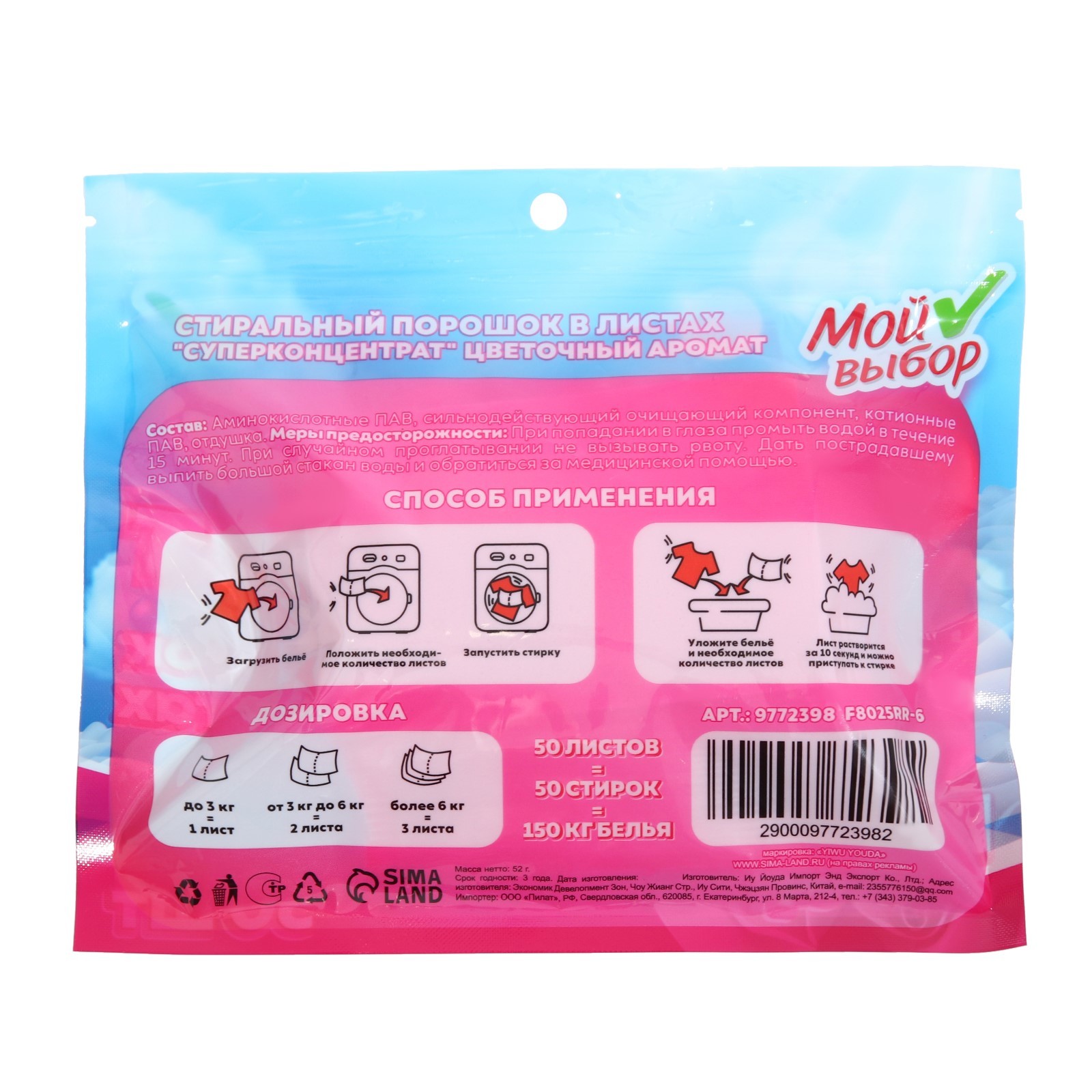 Стиральный порошок в листах, мой выбор, универсальный, цветочный аромат, концентрат, 50 листов.