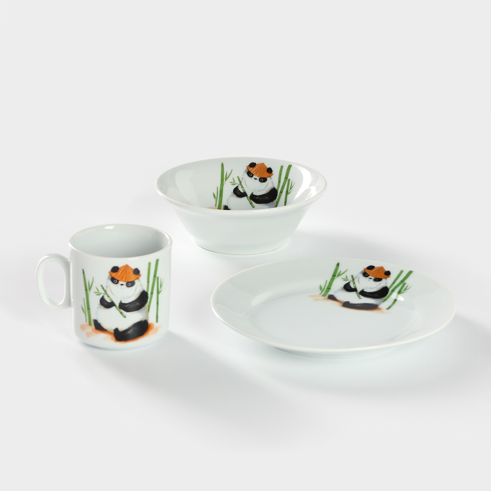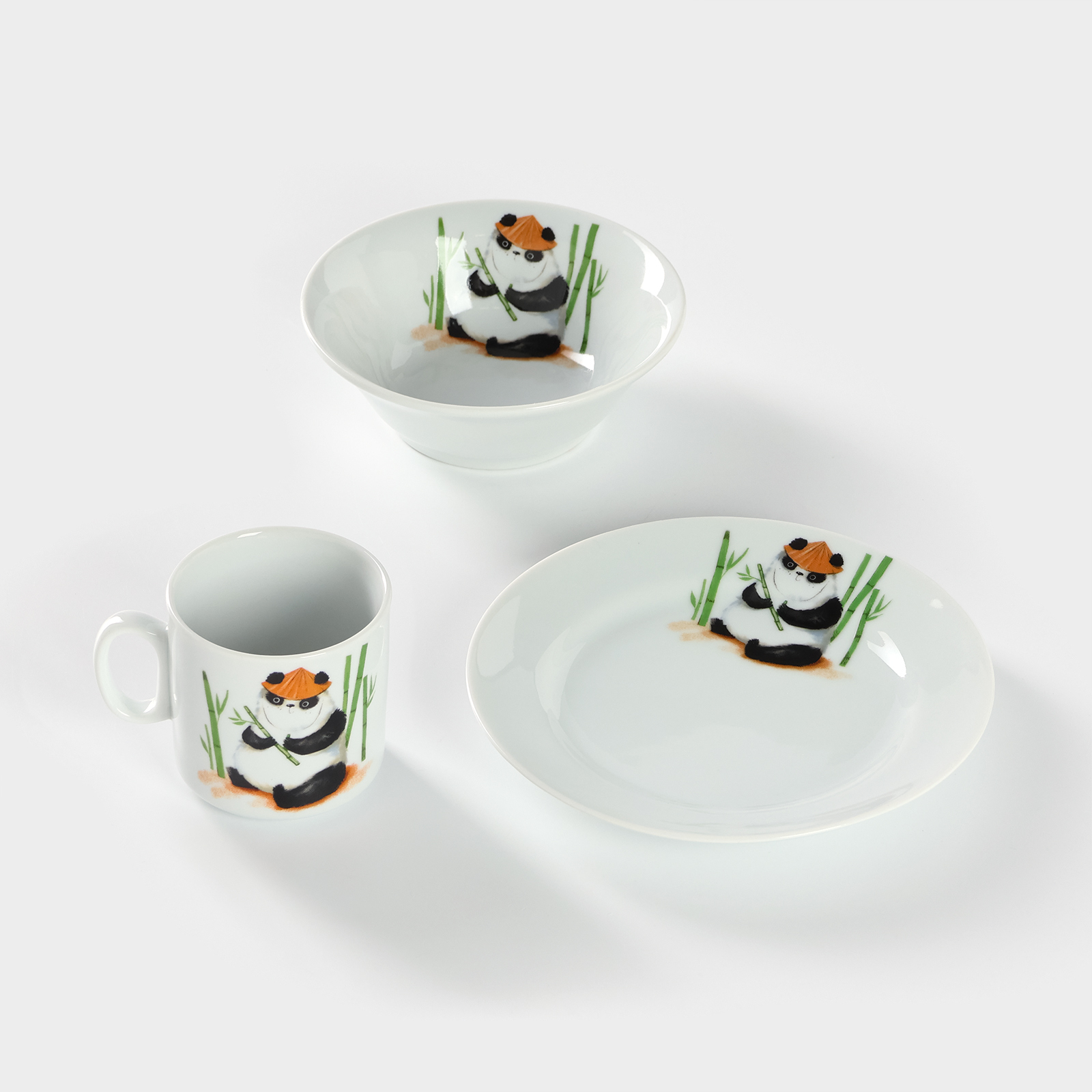 Набор детской фарфоровой посуды «панда», 3 предмета: кружка 200 мл, миска 350 мл, тарелка d=17 см. Выпускаемая продукция ЗАО «Добрушский фарфоровый завод» является высококачественной, экологически чистой, соответствует требованиям международных и европейских норм. Изделия из фарфора бывают настолько тонки, что через них просматривается солнечный свет. Несмотря на всю утончённость, вся фарфоровая посуда наделена особой прочностью. Преимущества:экологически чистая посуда изготавливается из особых сортов редкой белой глины, которая также используется в косметологии;прочность;изящный внешний вид;фарфор дольше удерживает теплоту ваших напитков и блюд, что позволит раскрыть аромат и вкус продукта. Эксплуатация:бережное обращение;избегайте резкой смены температуры, чтобы поверхность не потрескалась;красивая фарфоровая посуда чувствительна к абразивным порошкам и грубым щеткам, используйте мягкие гелевые средства и поролоновые губки. Комплектация:кружка - d=7, 3 см, h=7, 3 см, 229 мл;тарелка - d=17, 3 см, h=2, 2 см, 200 мл;тарелка глубокая - d=14 см, h=5 см, 360 мл. Цвет: Белый Количество персон: 1 В наборе, шт.: 3 Тематика: Животный мир Материал: Фарфор Для детей до 3 лет: Нет Температурное ограничение: Нет Можно мыть в посудомоечной машине: Да Можно использовать в СВЧ-печи: Да Текстура: Гладкая Особенности: Без особенностей Матовая поверхность: Нет  развернуть описание ▼