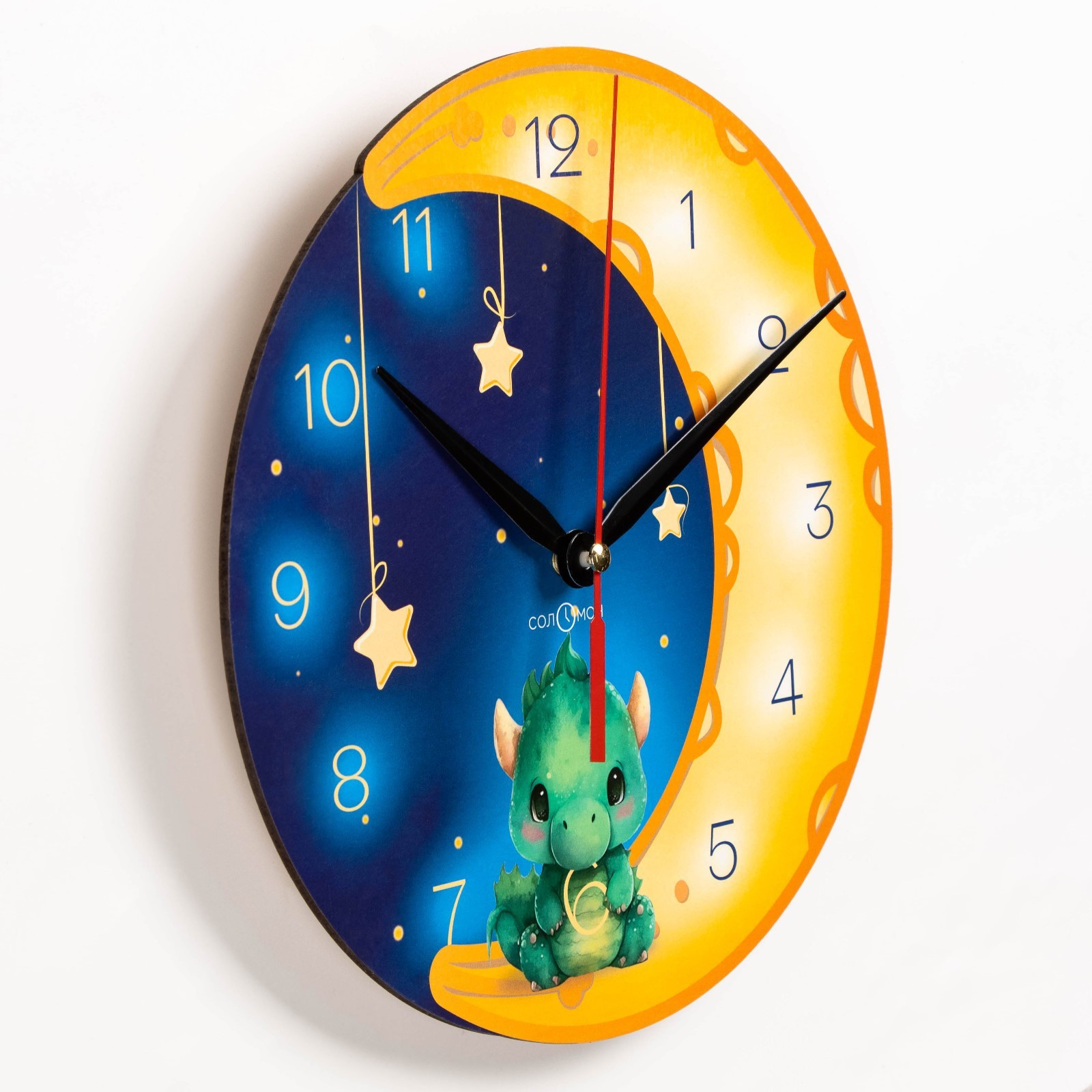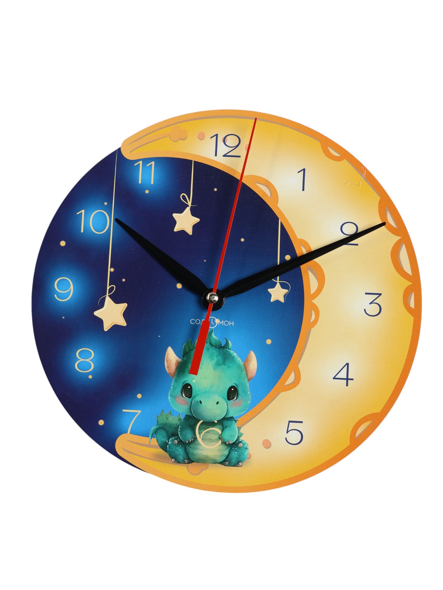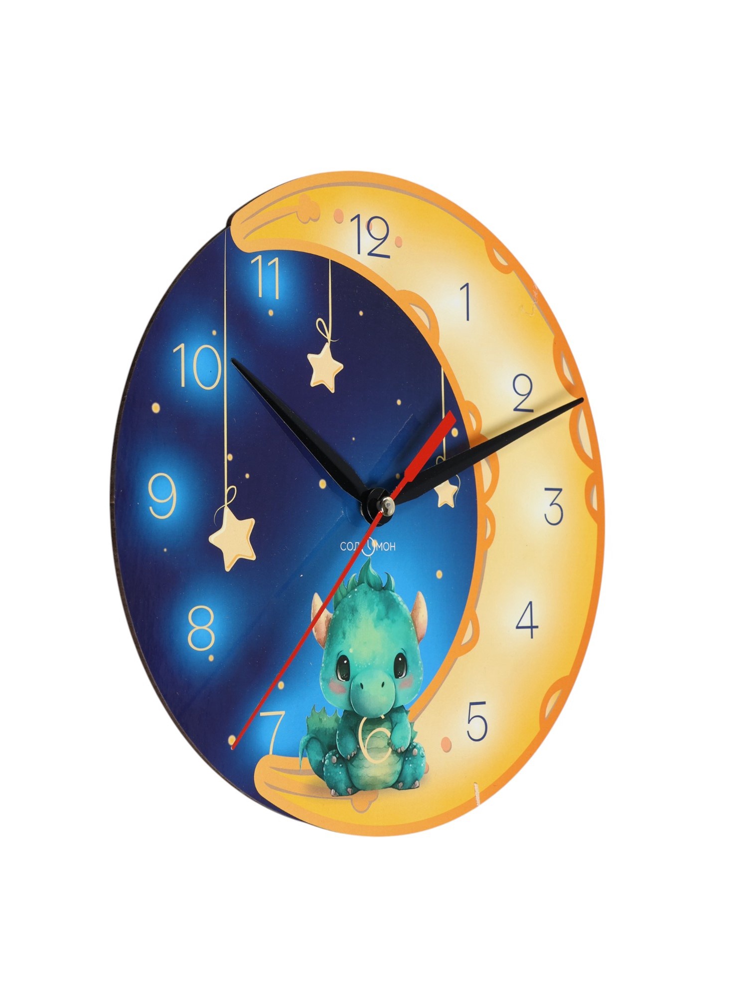 Часы настенные детские дракон на луне, плавный ход. Часы настенные — функциональный элемент декора, который будет уместно смотреться в квартирах, офисах, приемных, вестибюлях, залах ожидания. Они станут отличным подарком на любой праздник. Корпус часов универсален, придаёт стиль и изысканность любой комнате. Часы оснащены кварцевым механизмом, что гарантирует длительный срок их службы. Особенности: Плавный ход механизмаРаботают от батарейки типа АА (1 шт, в комплект не входит)Форма:Круглая|Тематика:Детская|Тематика:Драконы|Тематика:Звёзды|Тип индикации:Арабские цифры|Тип механизма:Кварцевый|Цвет циферблата:Жёлтый|Цвет циферблата:Синий|Материал:МДФ|Ход стрелок:Плавный|Стиль:Советский|Бесшумные:Да|Страна:Россия  развернуть описание ▼