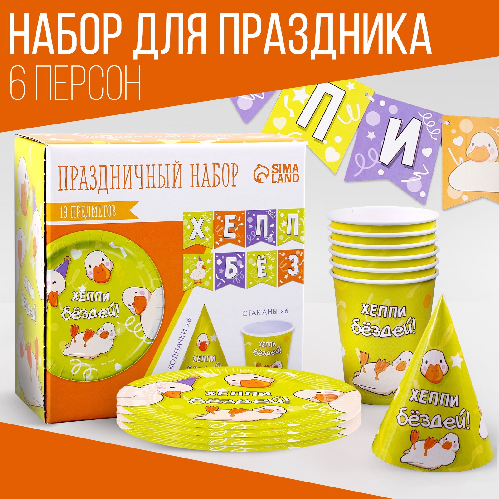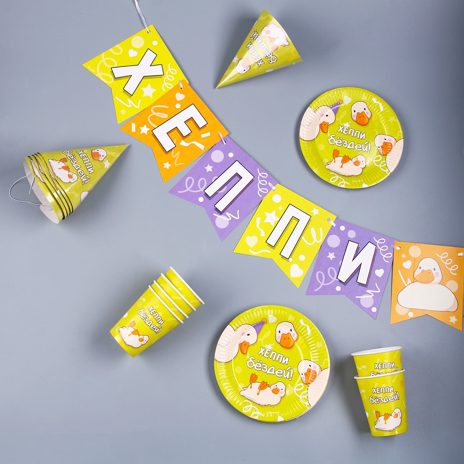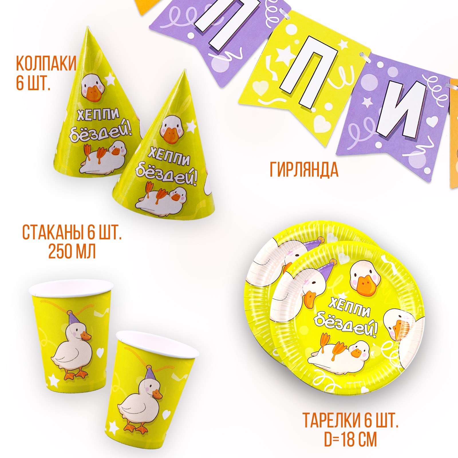 Набор бумажной посуды одноразовый утки»: 6 тарелок, 1 гирлянда, 6 стаканов, 6 колпаков