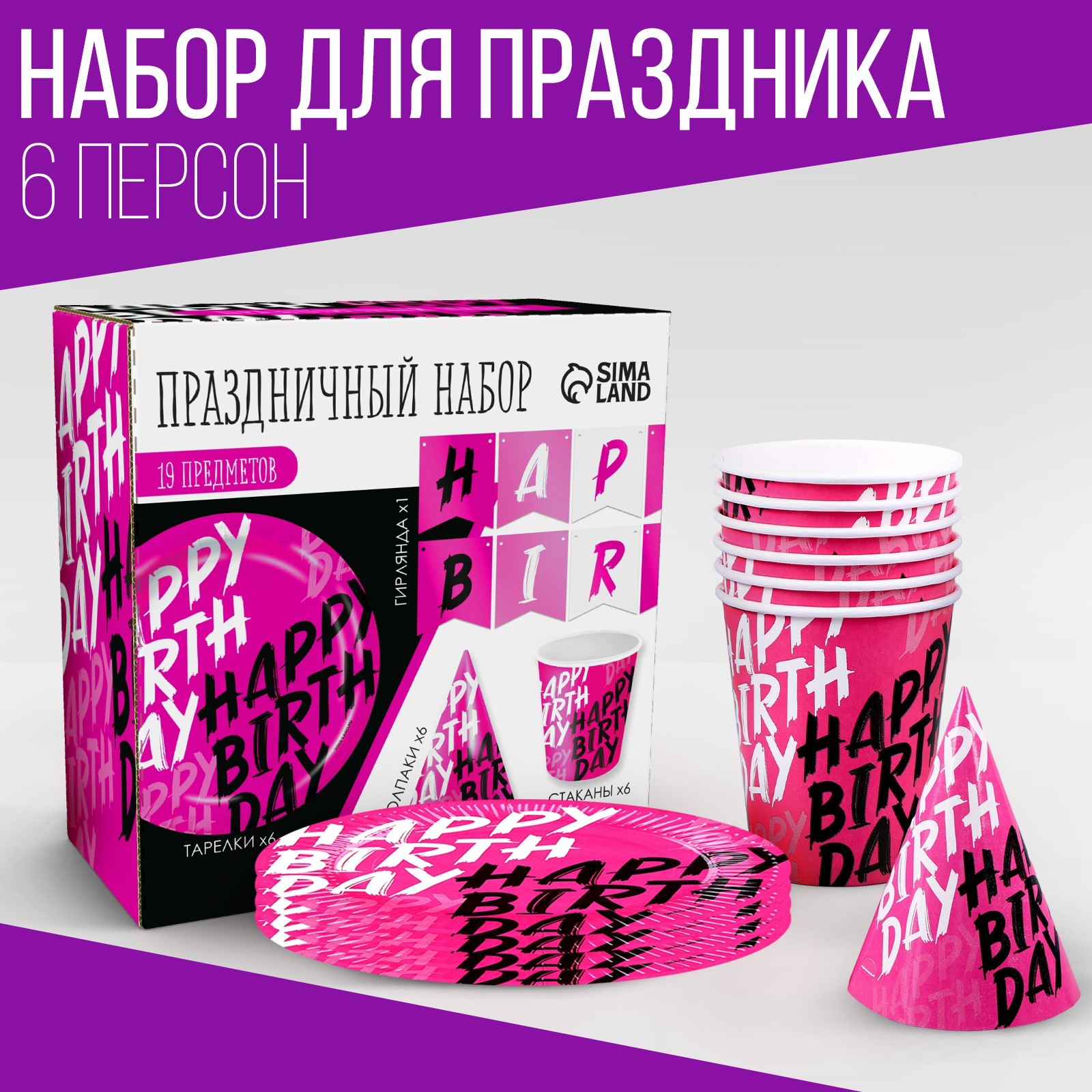 Набор бумажной посуды одноразовый Happy Birthday: 6 тарелок, 1 гирлянда, 6 стаканов, 6 колпаков
