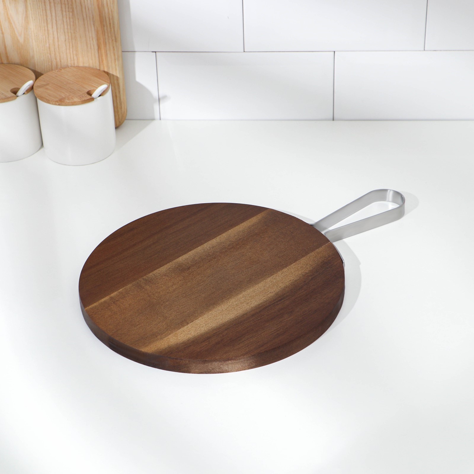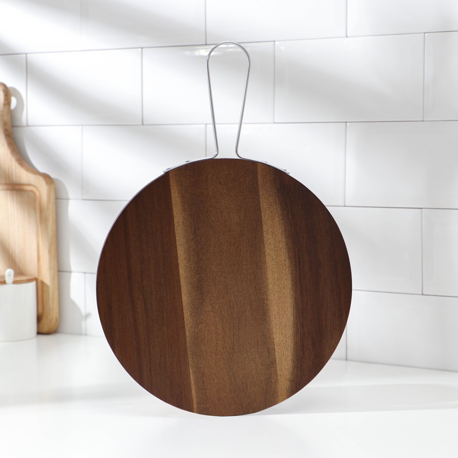 Доска разделочная с металлической ручкой, круглая, 35,8x25x1,6 см, тропическая акация