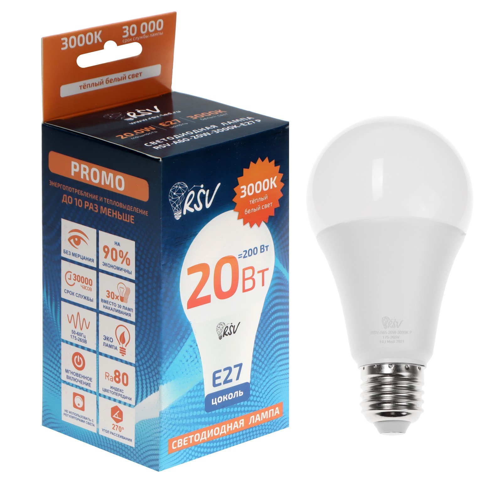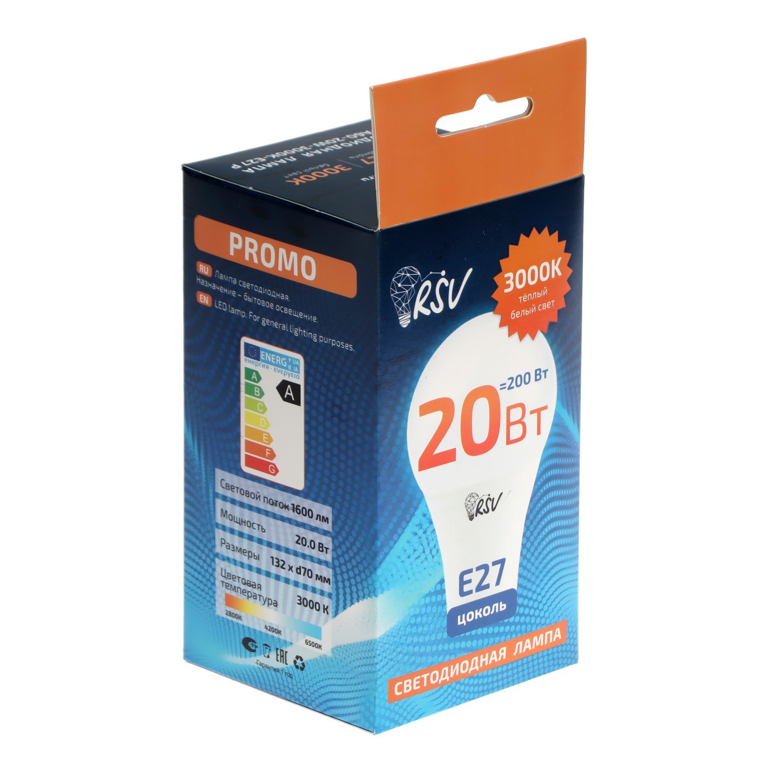 Светодиодная лампа rsv-a65-20w-3000k-e27 p. Цвет свечения: Тёплый белый Цоколь: E27 Мощность, Вт: 20 Напряжение, В: 220 Световой поток, лм: 1600 Цветовая температура: 3000К Форма лампы: Груша Температурное ограничение: Нет Индекс цветопередачи: RA > 80 Диммируемая: Нет Класс энергоэффективности: A  развернуть описание ▼