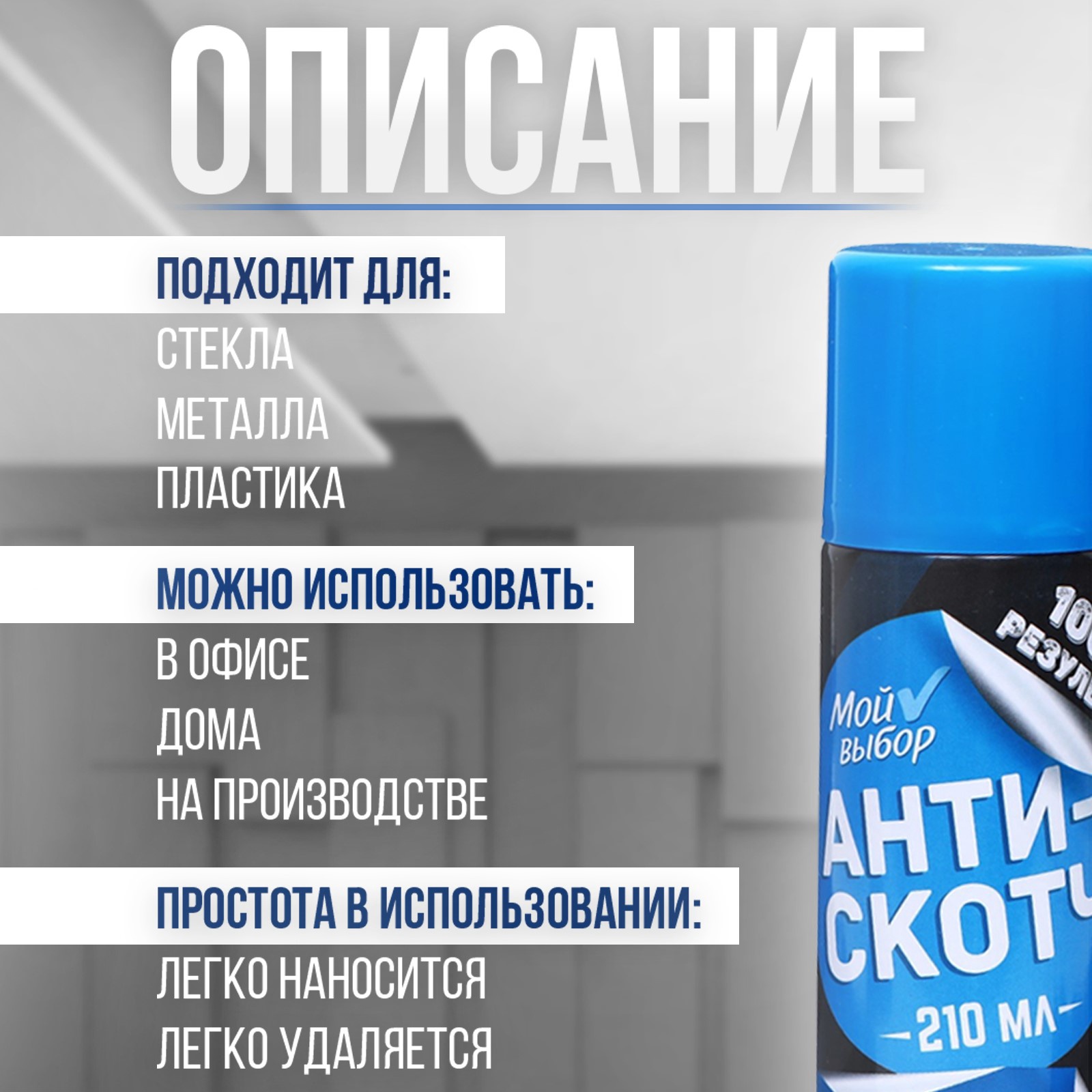 Антискотч аэрозоль «мой выбор», удалитель наклеек, следов клея и скотча, 210 мл. Антискотч «Мой выбор» представляет собой эффективное средство для удаления наклеек, следов клея и скотча с различных поверхностей. С его помощью вы легко и быстро избавитесь от различных неприятных следов и остатков клея на предметах и поверхностях. Основные характеристики товара: Объем: 210 мл. Это достаточное количество для обработки большого числа поверхностей, обеспечивая долговременное использование продукта. Форма выпуска: Аэрозоль. Удобный спрей обеспечивает равномерное распределение средства по поверхности, что упрощает процесс обработки. Универсальность: Подходит для различных материалов, таких как стекло, металл, пластик и др. Может использоваться как в быту, так и в профессиональных целях. Бережное действие: Специальная формула средства разработана так, чтобы минимизировать риск повреждения поверхностей при удалении следов клея, сохраняя первоначальный вид изделий. Простота применения: Продукт легко наносится и распределяется, а затем легко удаляется с поверхности, не требуя дополнительных усилий. Множество применений: Подходит для использования дома, в офисе, на производстве и в других местах, где требуется эффективное и безопасное удаление следов клея и скотча. Антискотч «Мой выбор» - это надежный помощник в борьбе с неприятными следами клея, обеспечивая качественное и безопасное удаление наклеек и остатков скотча. Способ применения: Для удаления наклеек: В случае нанесения на лакокрасочное покрытие или пластик заранее проверить действие состава на малозаметном участке поверхности. Перед использованием энергично встряхнуть баллон. Нанести средство с расстояния 10-15 см на наклейку, стикер или следы клея, удерживая баллон в вертикальном положении. Дать составу подействовать в течение 1-2 мин. Не дожидаясь высыхания, аккуратно удалить наклейку. Остатки клея протереть сухой салфеткой. При необходимости повторить обработку. Для удаления тонировочной плёнки: Во избежание попадания следов аэрозоля необходимо защитить поверхности, не подлежащие обработке. Не допускать длительный контакт с пластикомРавномерно прогреть стекло, подлежащее растонированию. Аккуратно поддеть край пленки и медленно, без рывков, снять пленку со всей площади стекла. Дать стеклу остыть и равномерно распылить состав на стекло, дать подействовать в течение 30-40 секунд. Удалить средство с помощью резинового скребка или сухой салфетки. Вес, г/Объём, мл: 210 Форма выпуска: Аэрозоль Объём: 100 мл - 300 мл Тип ёмкости: Аэрозоль  развернуть описание ▼