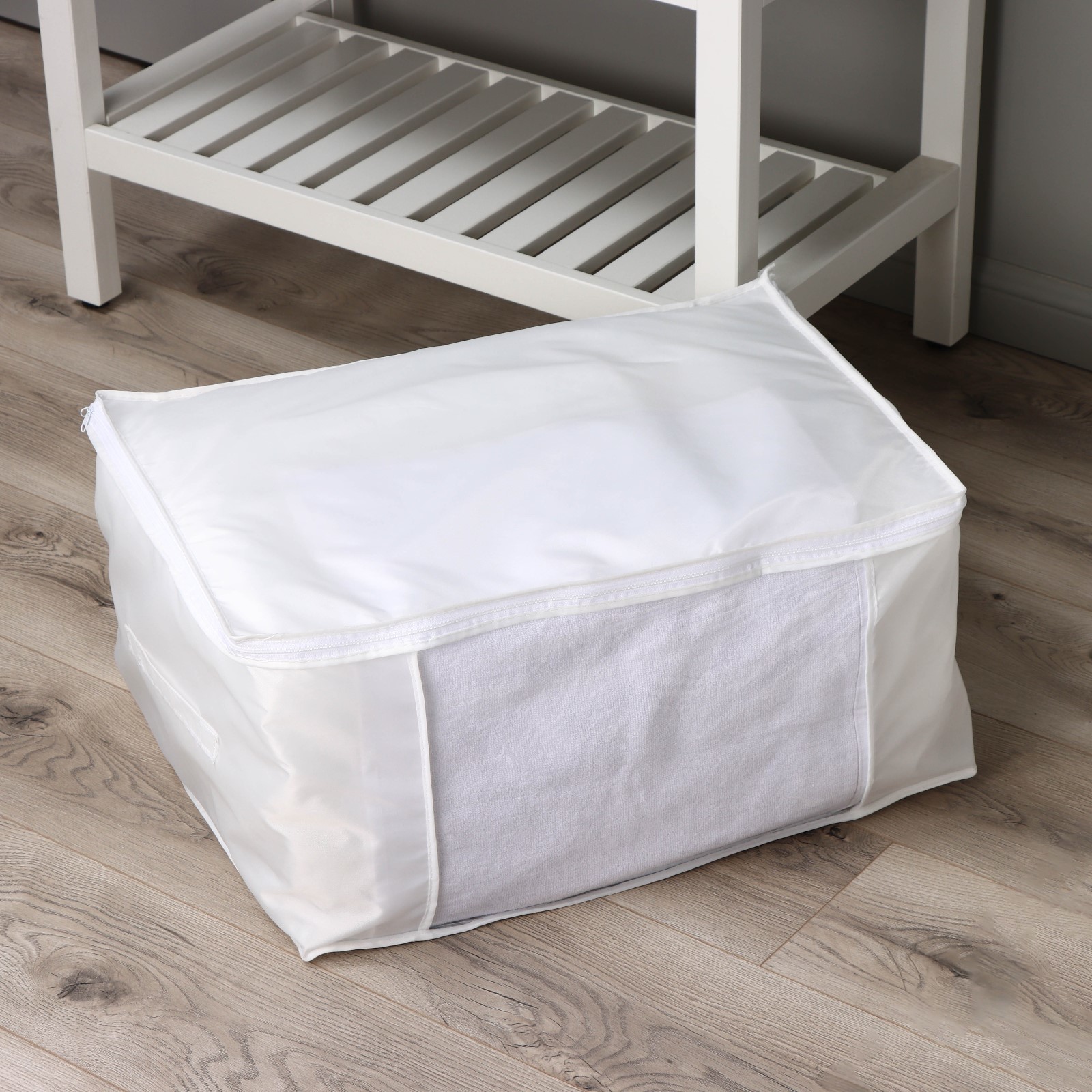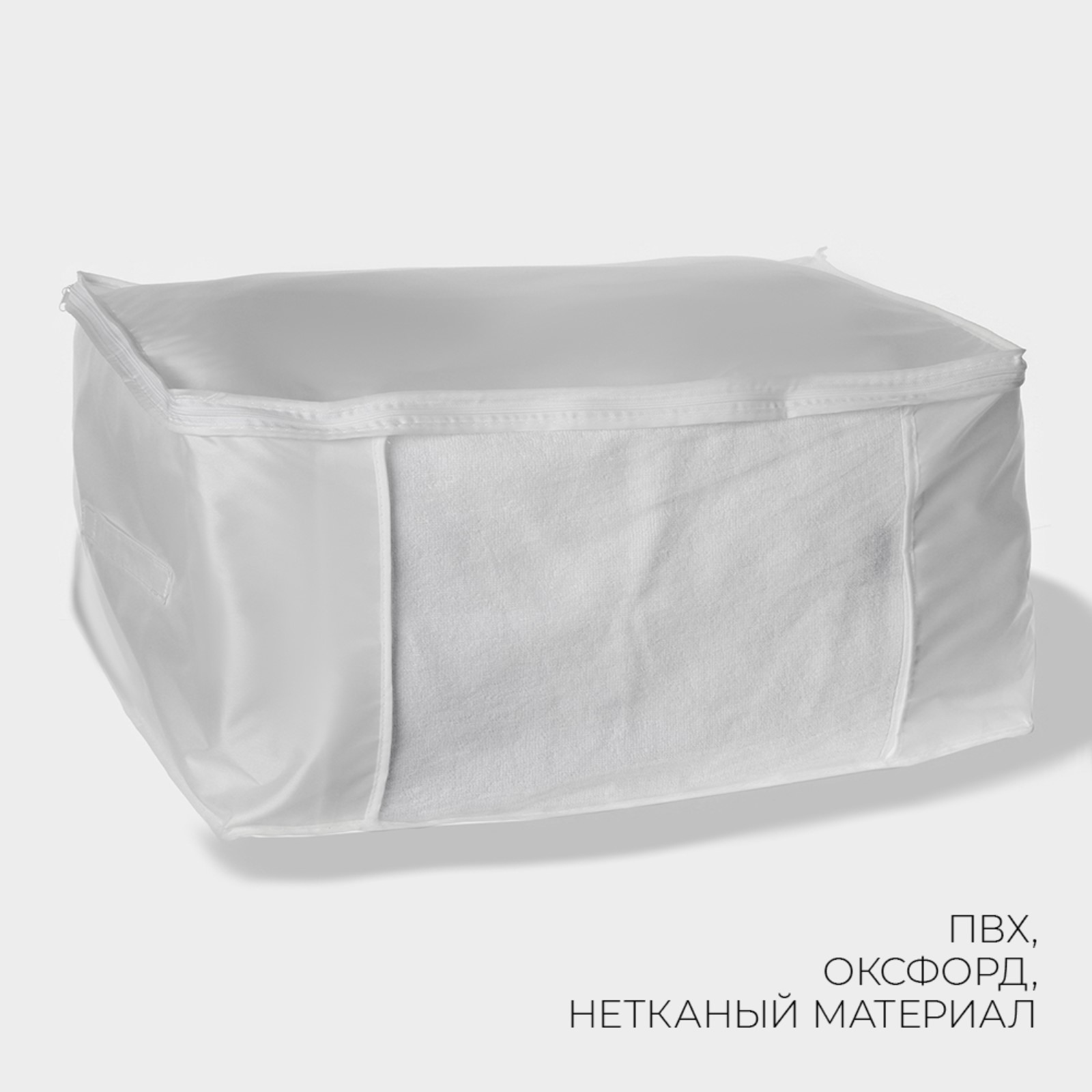 Array. Кофр для хранения вещей позволит навести порядок дома раз и навсегда! Подходит для удобного хранения постельного белья, сезонный одежды, детской одежды, одеял, пледов. Преимущества: Нейтральная цветовая гамма кофров впишется в интерьер спальной, гардеробной или гостиной комнаты, а также в детскую комнату. Органайзеры для хранения легко очистить от загрязнений и компактно сложить в кладовку. Идеально подходит для хранения, удобен для размещения в шкафу. Цвет: Белый Для кого: Унисекс Форма: Прямоугольная Количество отделений: 1 Количество ячеек: 1 Тематика: Однотонная Крышка: Да Материал: Оксфорд Материал: ПВХ Назначение: Для одежды Форма: Прямоугольник  развернуть описание ▼