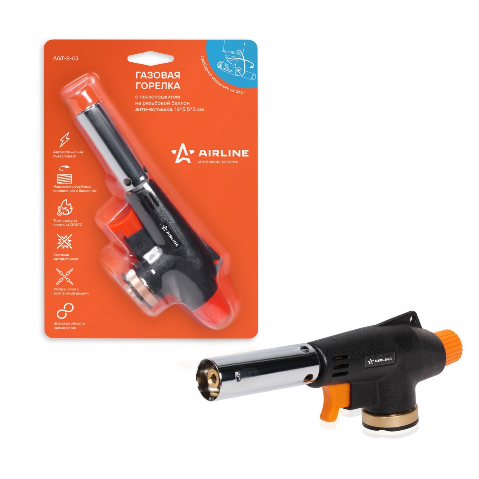 Горелка газовая airline, на резьбовой баллон, пьезоподжиг, анти-вспышка, 16х5,5х3 см. Представляет собой насадку с соплом на газовый резьбовой баллон оборудованую пьезоподжигом. Применяется для розжига костра, разогрева трубопровода, нагрева предметов и проведения различных ремонтных работ. Горелка-насадка используется совместно со стандартным газовым баллоном резьбового типа, который в комплект поставки не входит. Тип захвата: Резьбовой Пьезоподжиг: Да Тип: Горелка  развернуть описание ▼