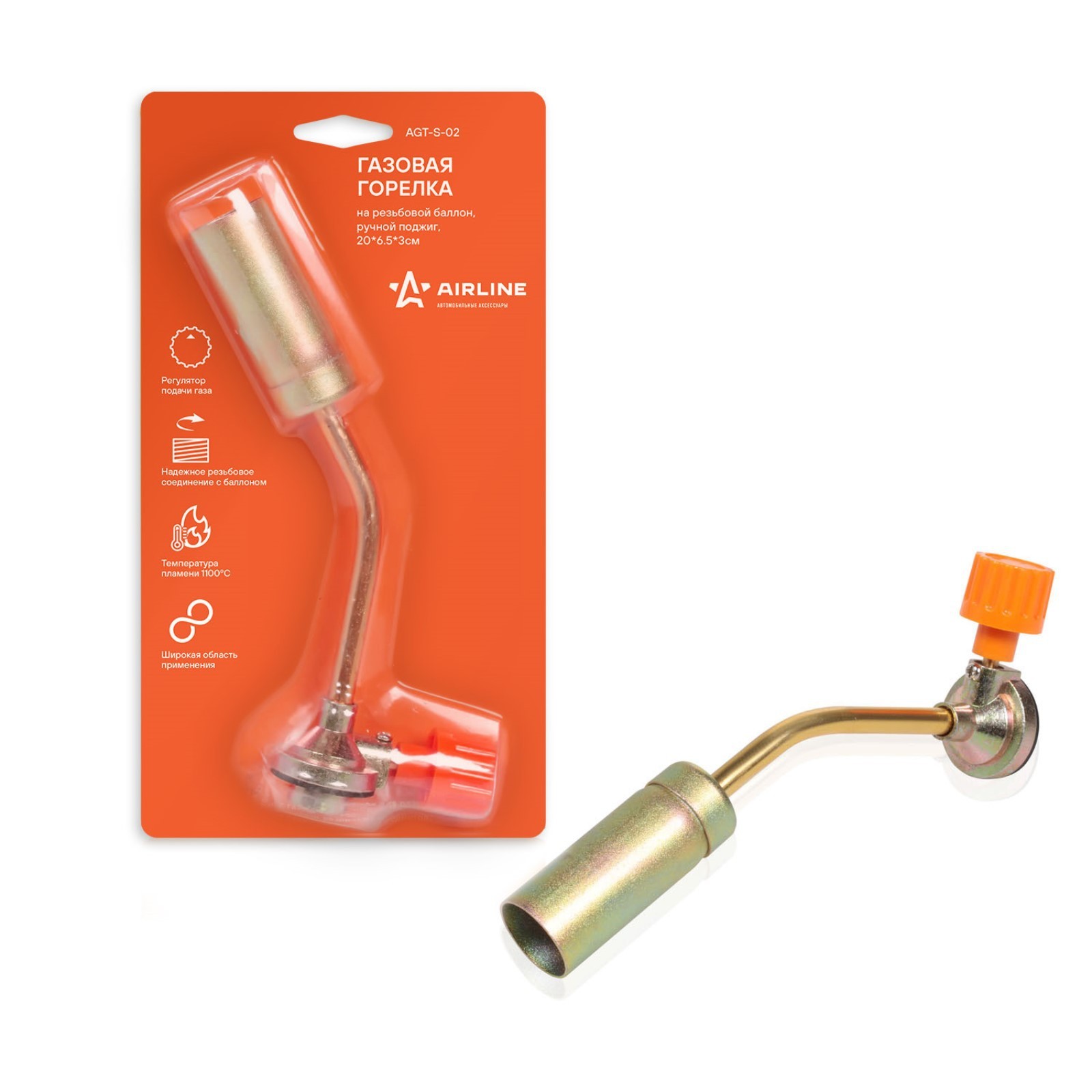 Горелка газовая airline, на резьбовой баллон, ручной поджиг, 20х6,5х3 см. Представляет собой насадку с соплом на газовый баллон. Применяется для розжига костра, разогрева трубопровода, нагрева предметов и проведения различных ремонтных работ. Горелка-насадка используется совместно со стандартным газовым баллоном резьбового типа, который в комплект поставки не входит. Поджиг осуществляется вручную посредством зажигалки или спичек. Тип захвата: Резьбовой Пьезоподжиг: Нет Тип: Горелка  развернуть описание ▼