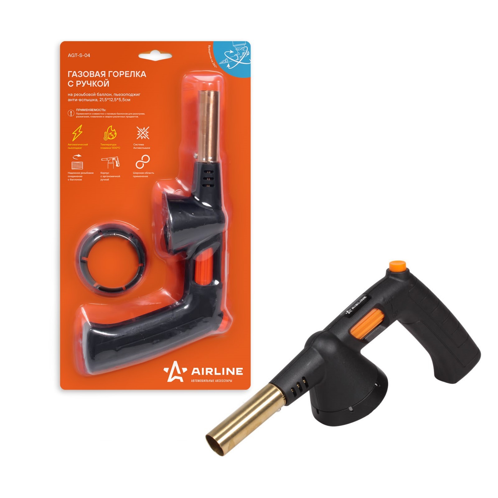 Горелка газовая с ручкой Airline, на резьбовой баллон, пьезоподжиг, 21,5х12,5х5,5 см