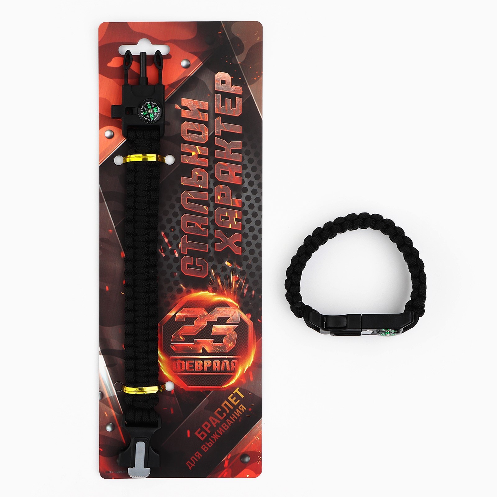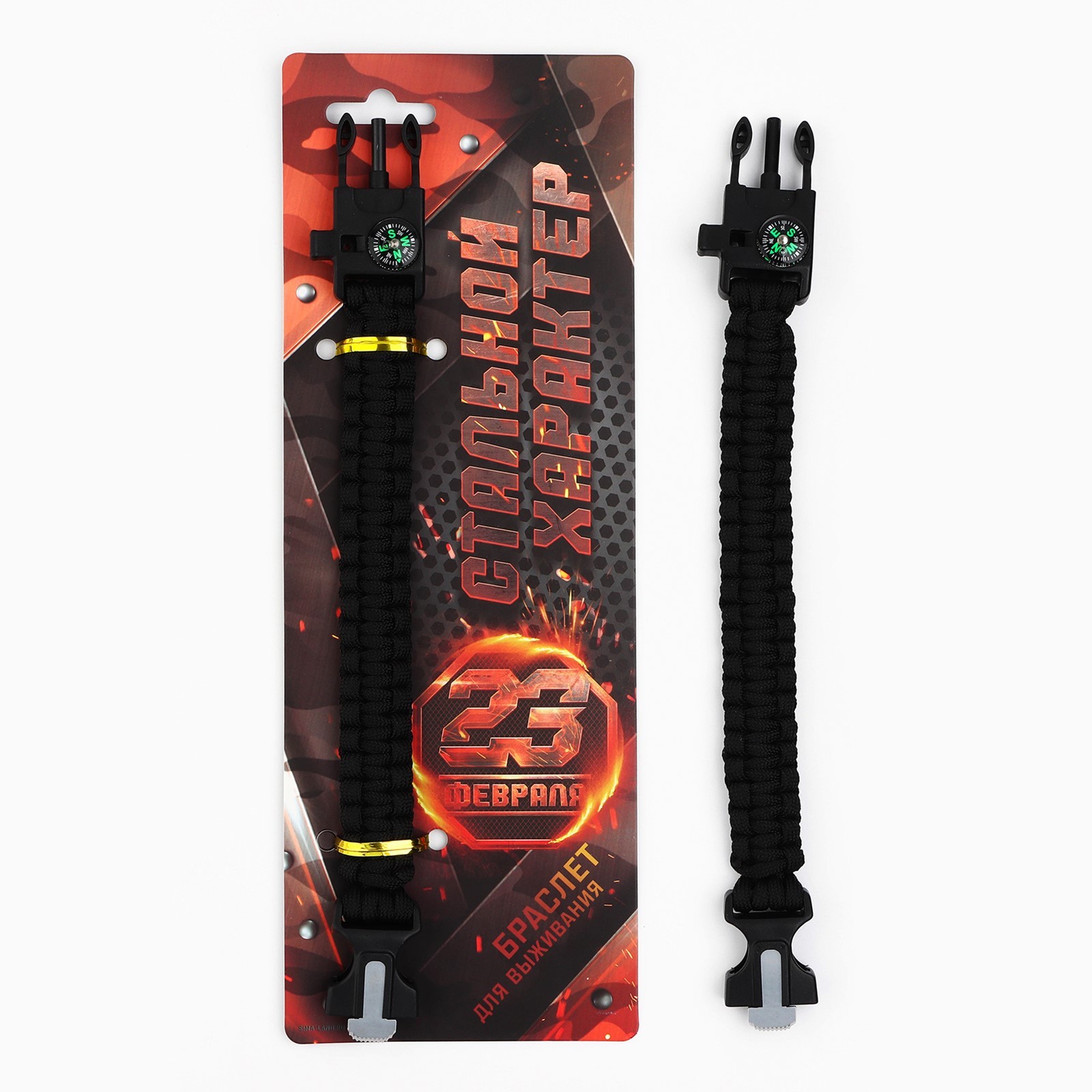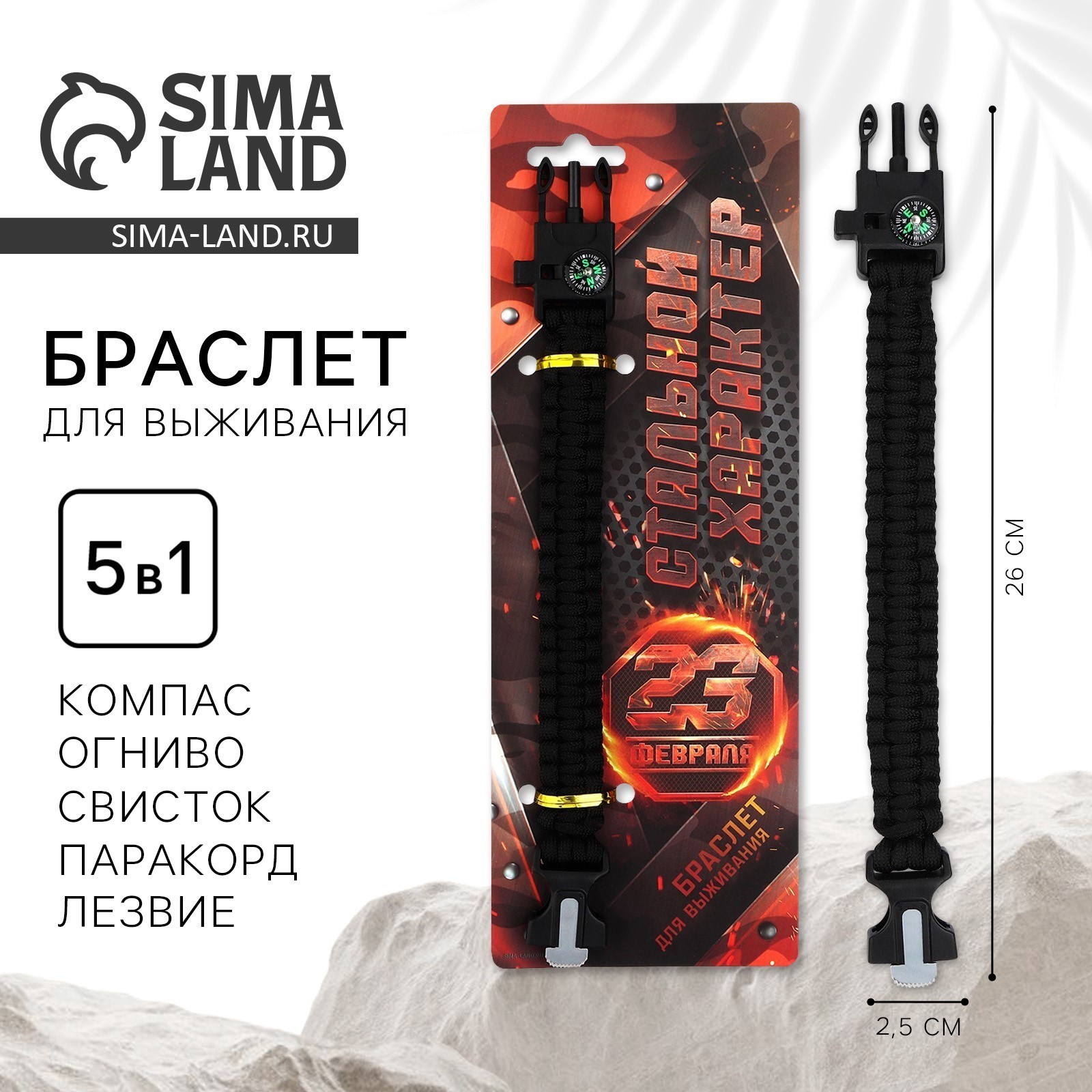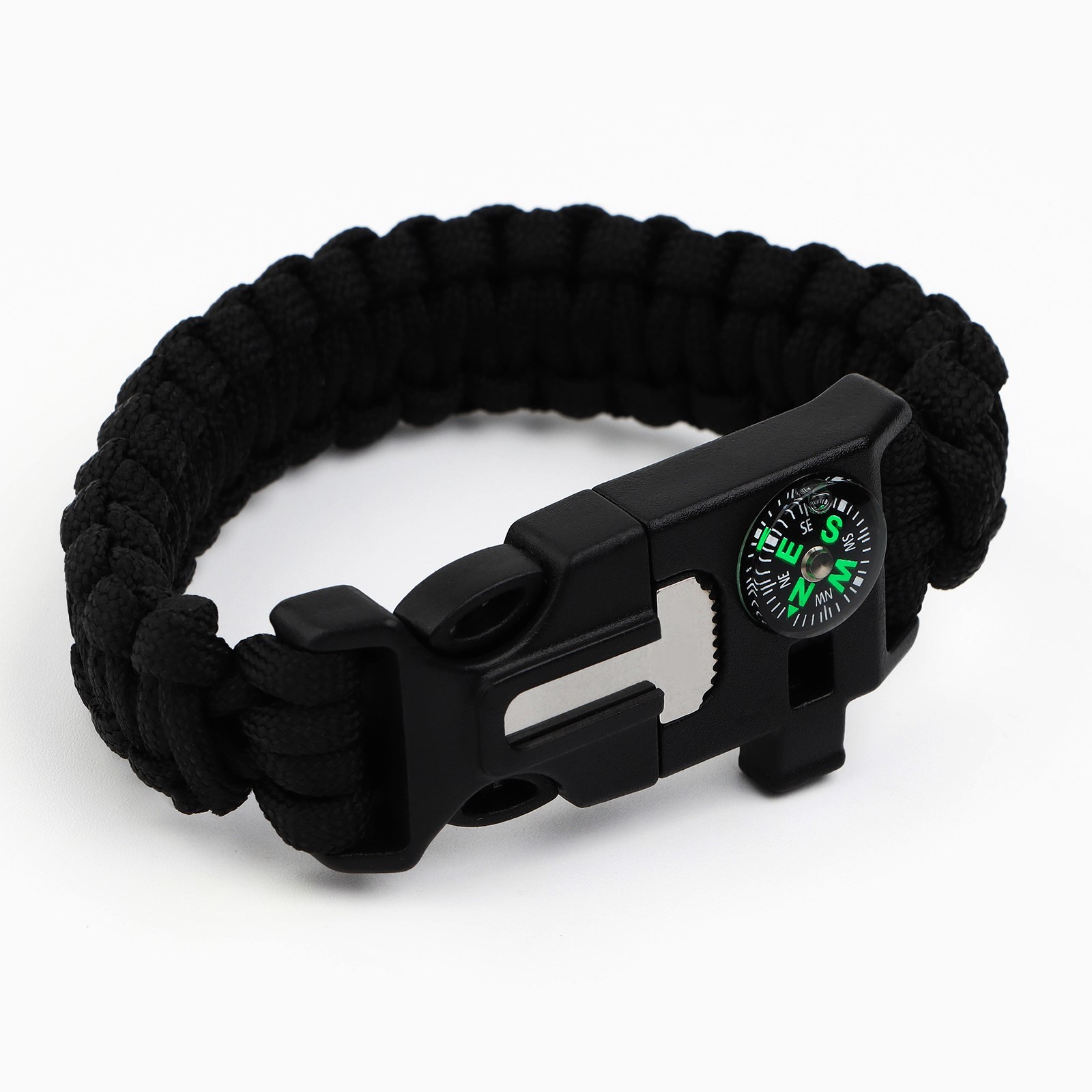 Браслет для выживания «стальной характер», 26 х 2,5 см.. Браслет для выживания много функциональный туристический Браслет 5 в 1 идеально подойдет как для экстримальных видов спорта, так и для одтыха на природе. Очень полезная, а иногда и незаменимая вещь в походе, туристических поездках, для выживания, и просто красивый и стильный аксессуар для повседневной жизни. Можно использовать в видах спорта: рыбная ловля, охота, рафтинг, байдарка, каяк, гидроцикл, вейкборд, лодка, лыжи, самокат, ролики, скейтборд, спортивный велосипед. Браслет состоит из: - Компаса (для точной навигации) - Огнива (Для разведения огня) - Свистка (Для подачи звукового сигнала) - Паракорда- 7 жильного шнура 370 см (Для перевязок, троса и тд) - лезвия ( Для резки и деления) Туристический браслет- отличный подарок папе, брату, мужу и любителью походов и туризма на День Рождения, Новый год, 23 февраля и другие праздники, а так же будет хорошим дополнением к основному подарку. Цвет: Чёрный В наборе, шт.: 1 Количество функций: 5 Материал: Текстиль Материал: Пластик Материал: Металл Размер: Универсальный Вид: Многофункциональный браслет Вид: Браслеты  развернуть описание ▼