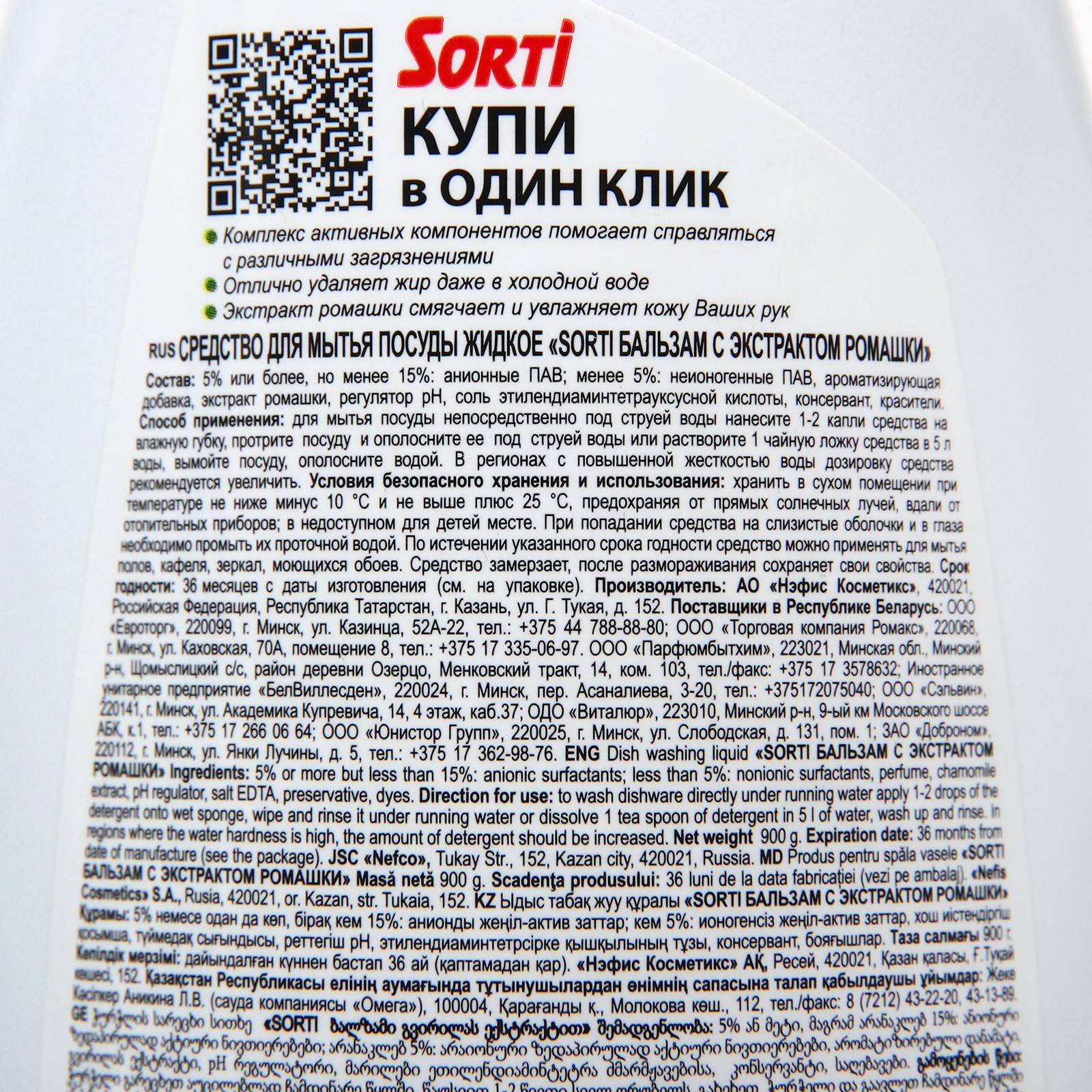 Средство для мытья посуды sorti "с экстрактом ромашки", 900 гр. Средство для мытья посуды Sorti "С Экстрактом Ромашки", 900 гр -Комплекс активных компонентов помогает справляться с различными загрязнениями даже в холодной воде -Натуральный экстракт Алоэ Вера смягчает и увлажняет Вашу кожу -Отлично пенится и легко смывается водой Способ применения:Для мытья посуды непостредственно под струей воды нанесите 1-2 капли средства на влажную губку, протрите посуду и ополосните ее под струей воды или растворите 1 чайную ложку средства в 5 л воды, вымойте посуду, ополосните водой. Состав:5% или более, но менее 15%: анионные ПАВ; менее 5%: неионогенные ПАВ, ароматизирующая добавка, экстракт ромашки, регулятор рН, соль этилендиаминтетрауксусной кислоты, консервант, красители Меры предосторожности: Использовать средство только по назначению. Хранить в недоступном для детей месте. Хранить вдали от пищевых продуктов. Хранить с закрытой крышкой. Хранить в сухом, прохладном и темном месте. Условия хранения: Хранить в сухом помещении при температуре не ниже минус 10 0С и не выше плюс 25 0С, предохраняя от прямых солнечных лучей, вдали от отопительных приборов; в недоступном для детей месте. При попадании средства на слизистые оболочки и в глаза необходимо промыть их проточной водой. По истечении указанного срока годности средство можно применять для мытья полов, кафеля, зеркал, моющихся обоев. Средство замерзает, после размораживания сохраняет свои свойства. Вес, г/Объём, мл: 900 Температурное ограничение: Нет Вид: Гель  развернуть описание ▼