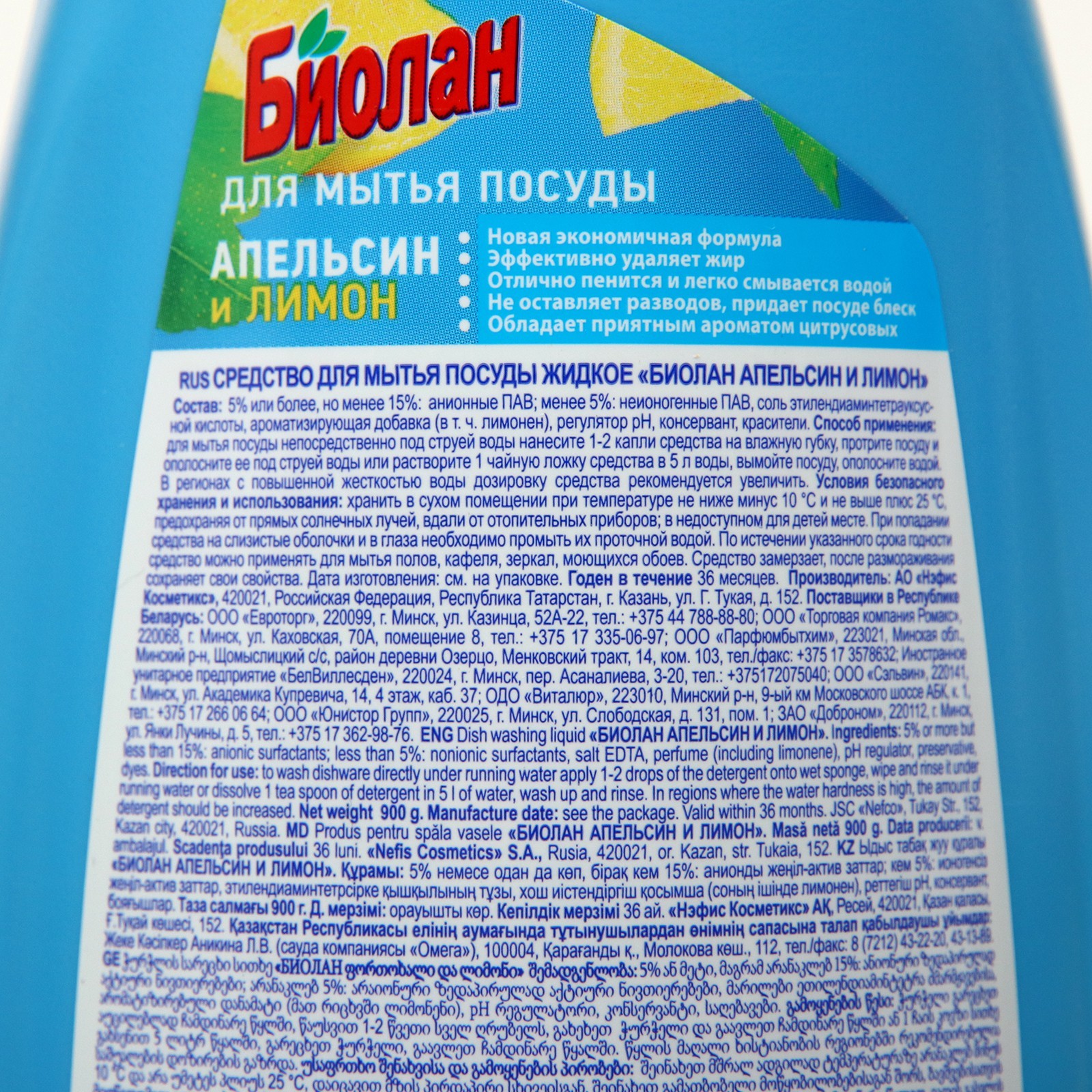 Средство для мытья посуды биолан, "апельсин и лимон", 900 гр. Средство для мытья посуды Биолан, "Апельсин и лимон", 900 гр -Новая экономичная формула -Эффективно удаляет жир -Отлично пенится и легко смывается водой -Не оставляет разводов, придает посуде блеск -Обладает приятным ароматом цитрусовых Способ применения:Для мытья посуды непостредственно под струей воды нанесите 1-2 капли средства на влажную губку, протрите посуду и ополосните ее под струей воды или растворите 1 чайную ложку средства в 5 л воды, вымойте посуду, ополосните водой. Состав:5% или более, но менее 15%: анионные ПАВ; менее 5%: неионогенные ПАВ, соль этилен-диаминтетрауксусной кислоты, ароматизирующая добавка (в т. ч. лимонен), регулятор рН, консервант, красители. Меры предосторожности: Использовать средство только по назначению. Хранить в недоступном для детей месте. Хранить вдали от пищевых продуктов. Хранить с закрытой крышкой. Хранить в сухом, прохладном и темном месте. Условия хранения: Хранить в сухом помещении при температуре не ниже минус 10 0С и не выше плюс 25 0С, предохраняя от прямых солнечных лучей, вдали от отопительных приборов; в недоступном для детей месте. При попадании средства на слизистые оболочки и в глаза необходимо промыть их проточной водой. По истечении указанного срока годности средство можно применять для мытья полов, кафеля, зеркал, моющихся обоев. Средство замерзает, после размораживания сохраняет свои свойства. Вес, г/Объём, мл: 900 Температурное ограничение: Нет Вид: Гель  развернуть описание ▼