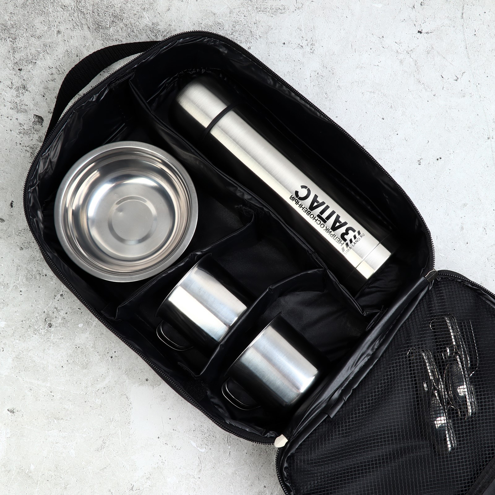 Набор посуды для пикника «неприкосновенный запас», 7 предметов. Цвет: Чёрный Цвет: Серебристый Для кого: Для мужчины Количество персон: 2 В наборе, шт.: 7 Время сохранения тепла/холода, ч: 24 Вид упаковки: Пакет Адресат: Мужчине Материал: Пластик Материал: Полиэстер Материал: Коррозионно стойкая сталь Составляющие набора: Чехол Составляющие набора: Кружка Составляющие набора: Термос Составляющие набора: Тарелка Составляющие набора: Мультитул Возраст: Для взрослых Тематика подарка: Посуда Назначение: Для приёма пищи Комплектация: Посуда для приготовления пищи Комплектация: Столовые приборы Комплектация: Посуда для напитков  развернуть описание ▼