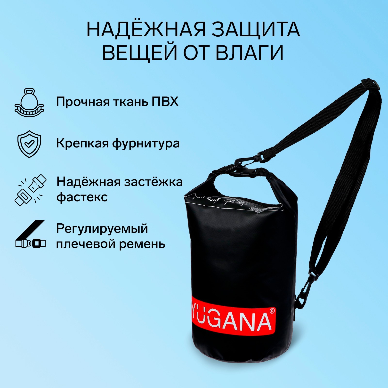 Гермомешок Yugana, пвх, водонепроницаемый 5 литров, один ремень, черный