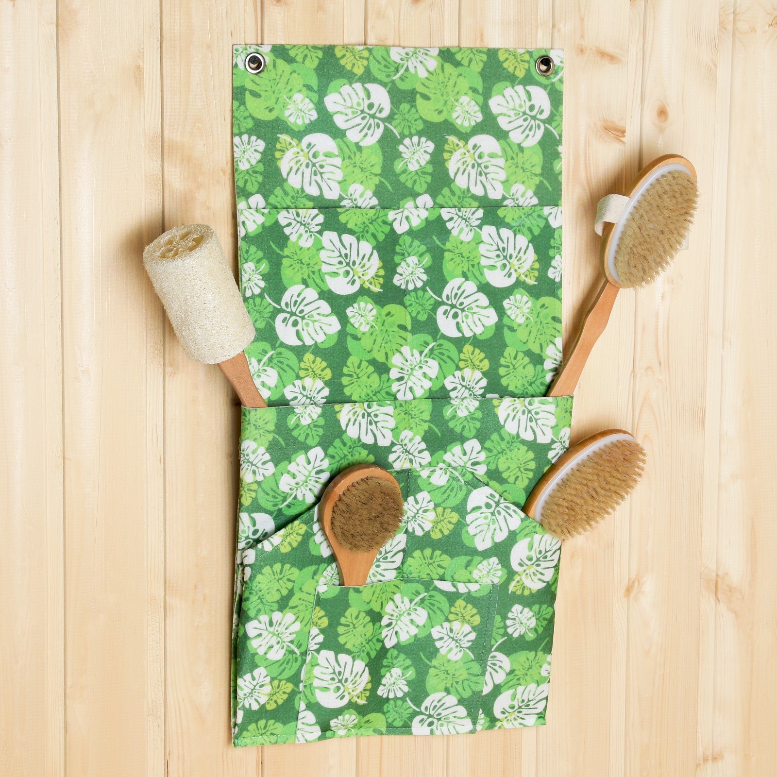 Настенный подвесной органайзер на люверсах 8 отделений, принт зеленые листья, 62х30 см, войл