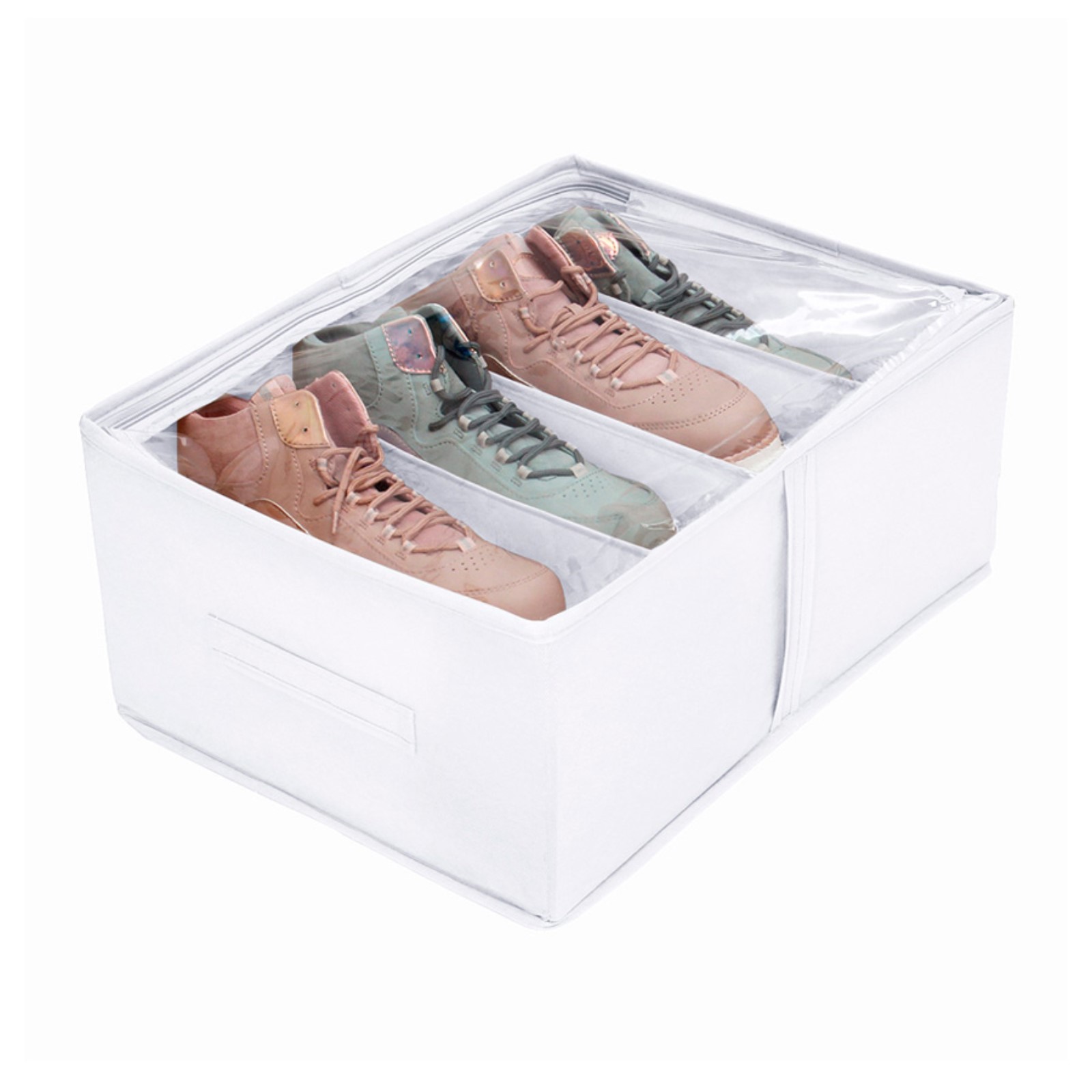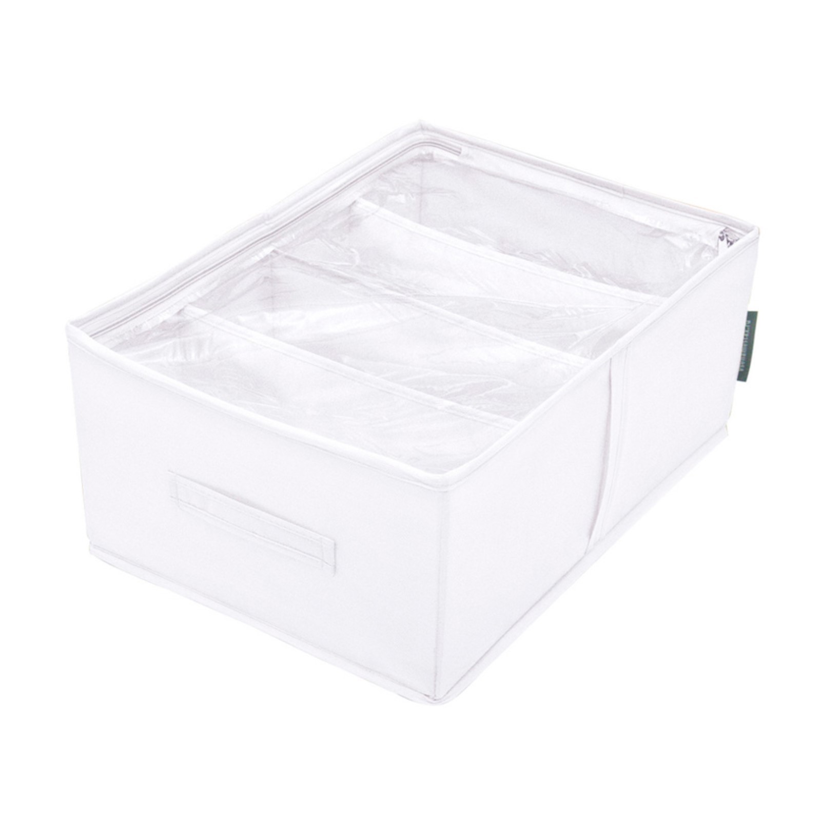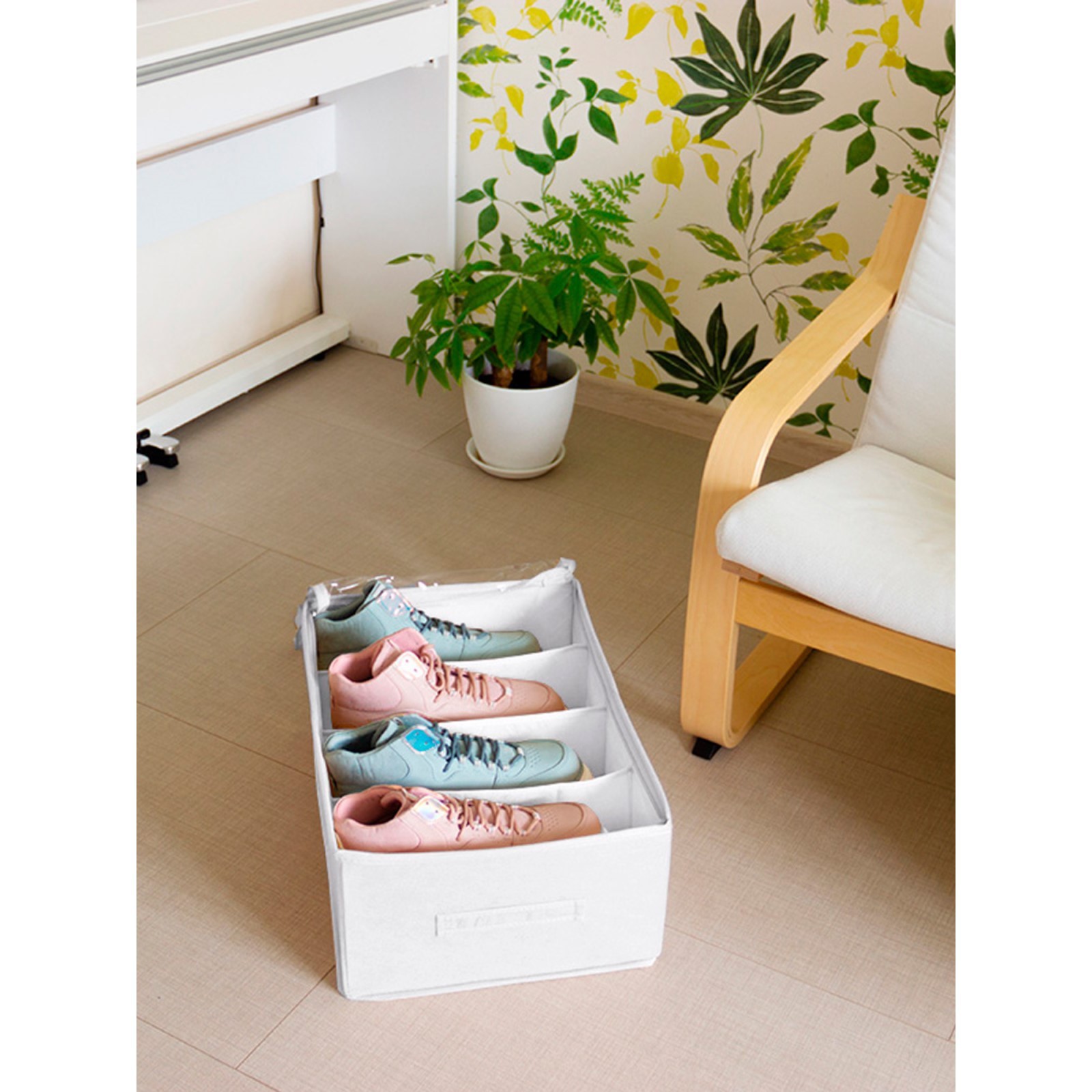 Кофр для обуви «санторини», 34х48х20 см, 4 ячейки. Крышка прозрачная, застёгивается на молнию;На боковой стенке есть ручка для транспортировки;Содержит 4 отсека, укреплённых пластиком - в каждый из них помещается пара обуви размером до 45. Кофр пригодится дома, в путешествиях, поездках. Легко моется мыльной водой. Может также быть использован для перевозки и хранения трикотажных вещей. Цвет: Белый Ширина, см: 34 Высота, см: 20 Глубина, см: 48 В наборе, шт.: 1 Крышка: Да Вид: Чехол для обуви Материал: Спанбонд Материал: ПВХ Колёса/ролики: Нет Вид: Лоток  развернуть описание ▼