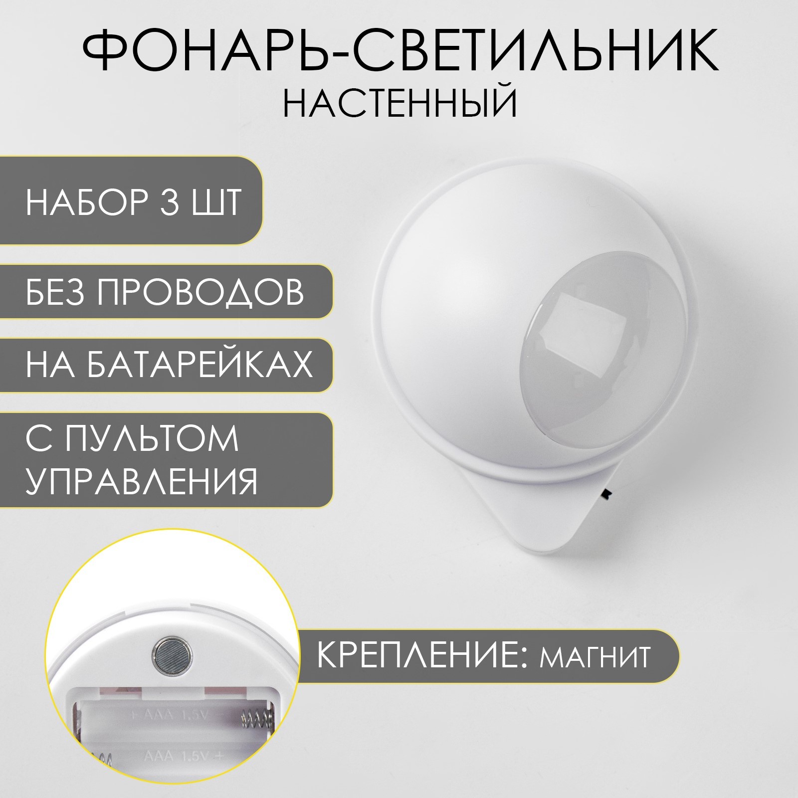 Фонарь-светильник, 3 шт, 50 лм, Cob, 3 ааа, магнит, клейкая основа, с пультом, 7.5 х 9.2 см