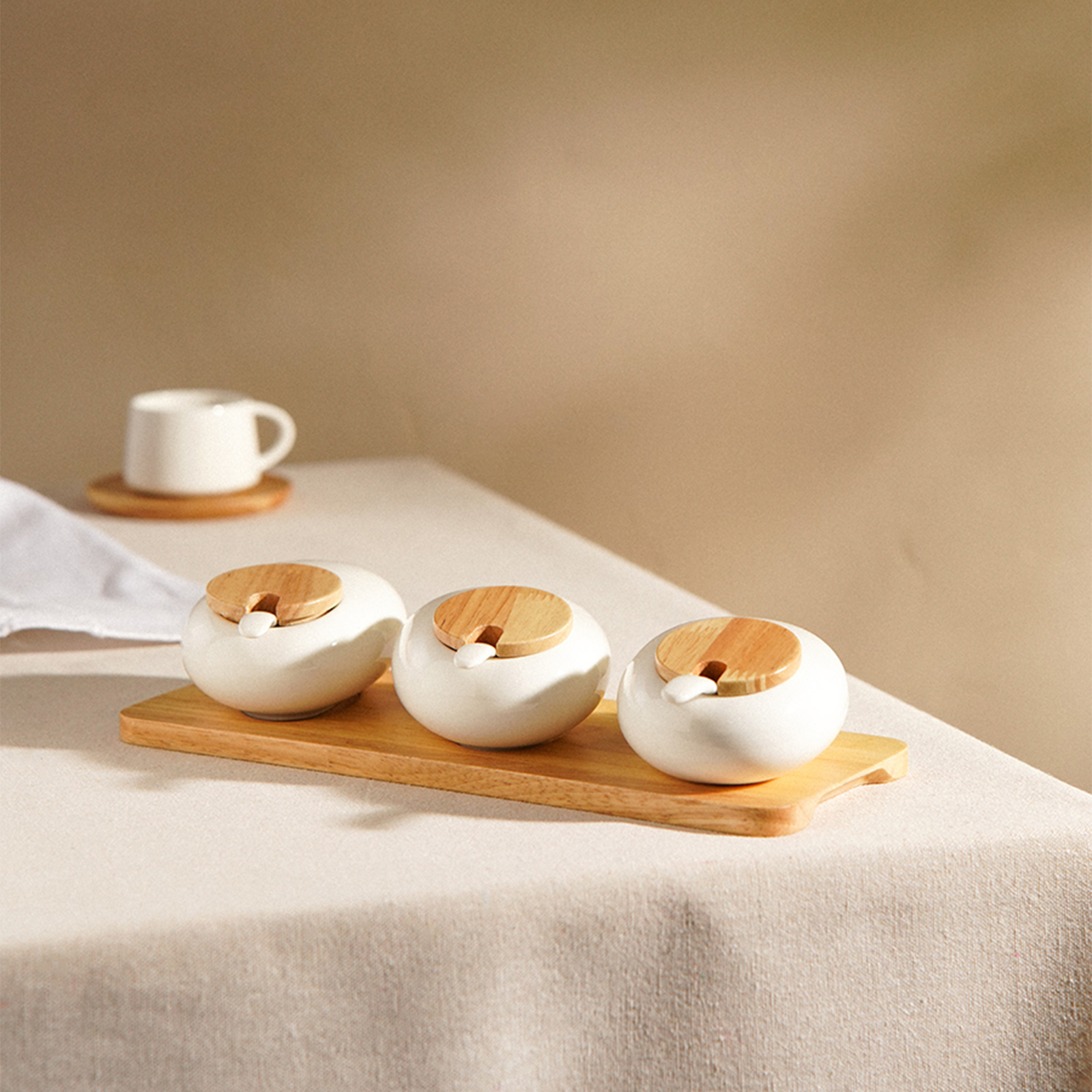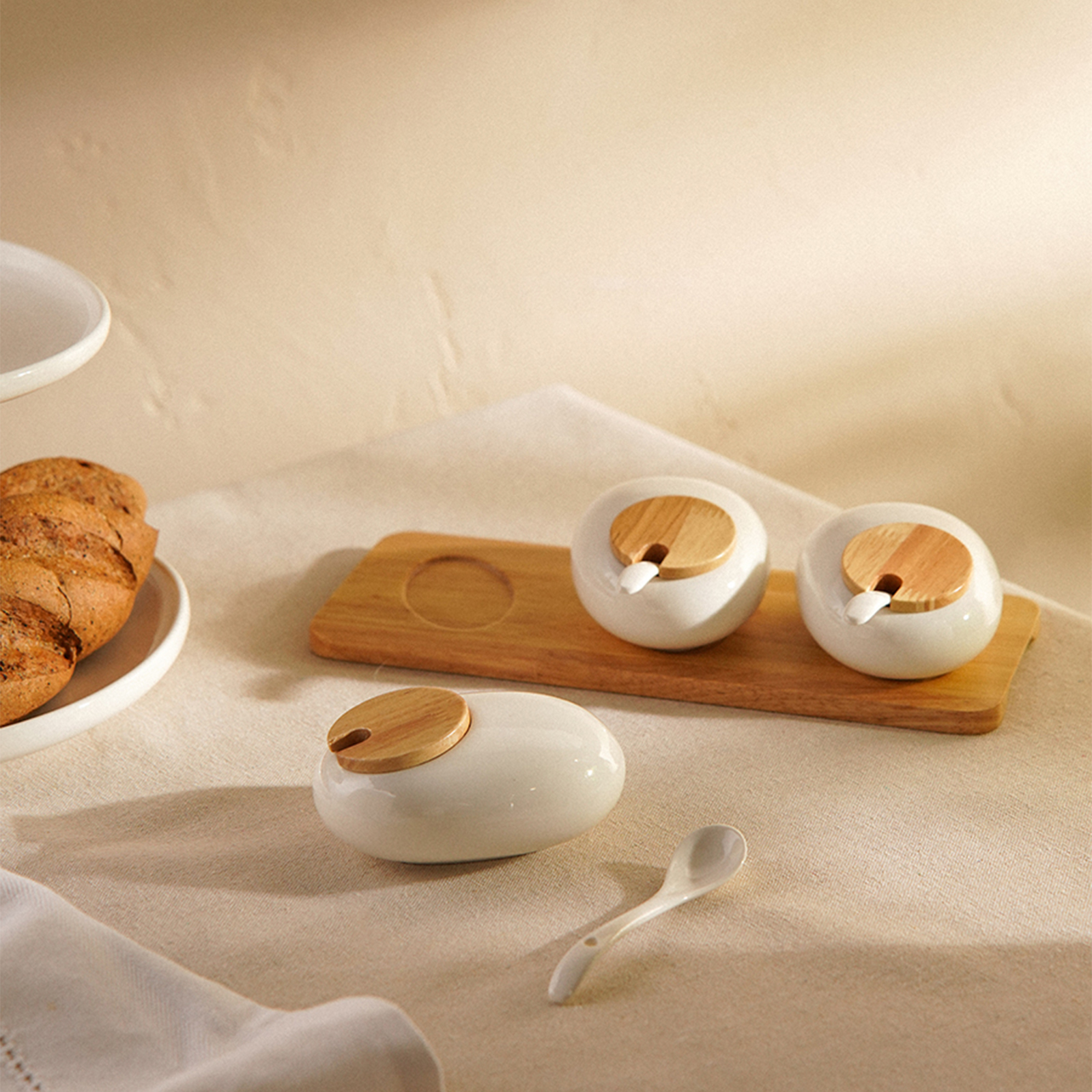 Набор банок для сыпучих продуктов с ложкой sl home "тренто", 27,5х11х5,5 см, 150мл. Цвет: Белый Форма: Круглая Форма: Цилиндрическая Объём, л: 0.15 В наборе, шт.: 4 Материал крышки: Дерево Материал: Фарфор Герметичная крышка: Нет Можно мыть в посудомоечной машине: Нет Текстура: Гладкая Назначение: Для сыпучих Особенности: С ложкой Форма: Круг, шар, цилиндр  развернуть описание ▼