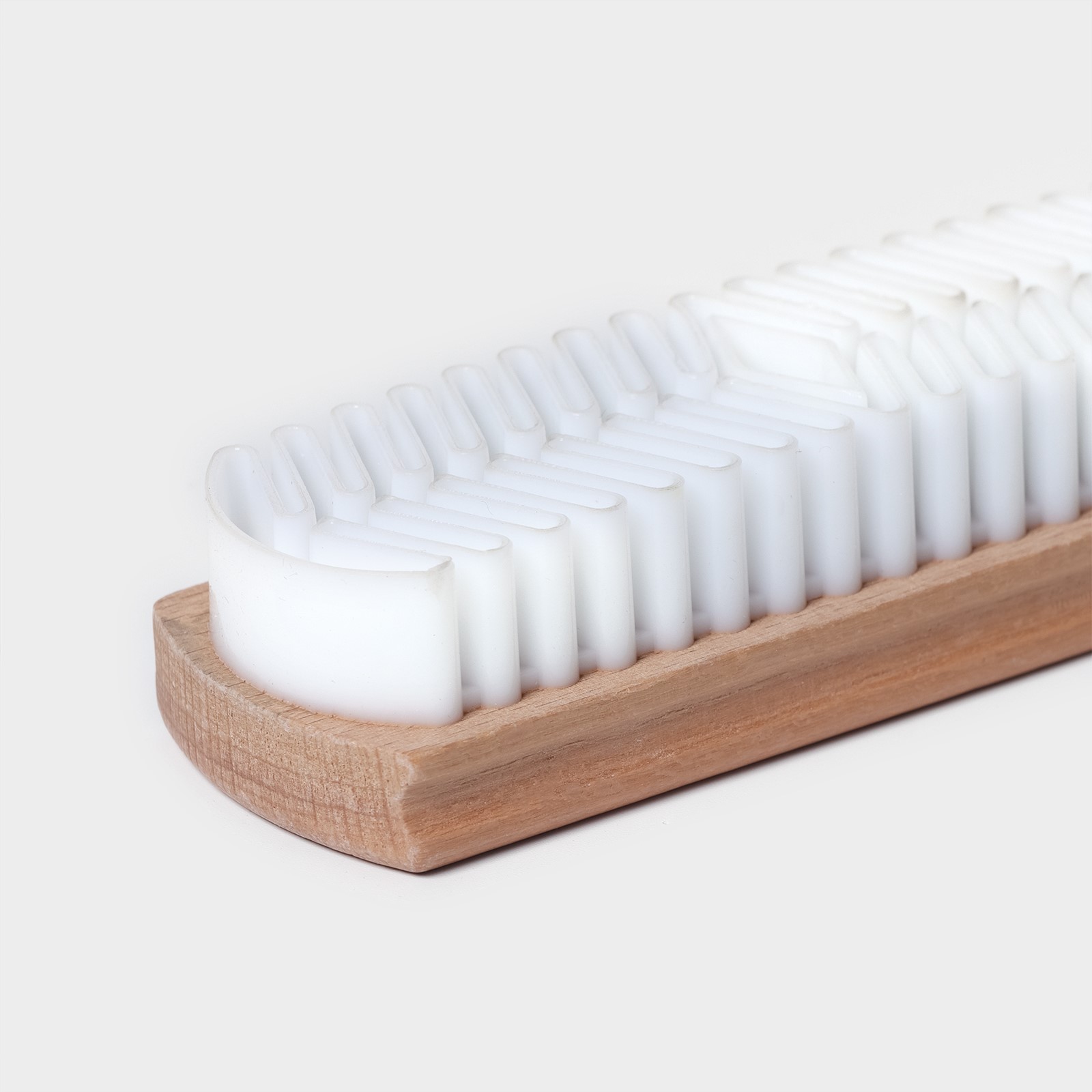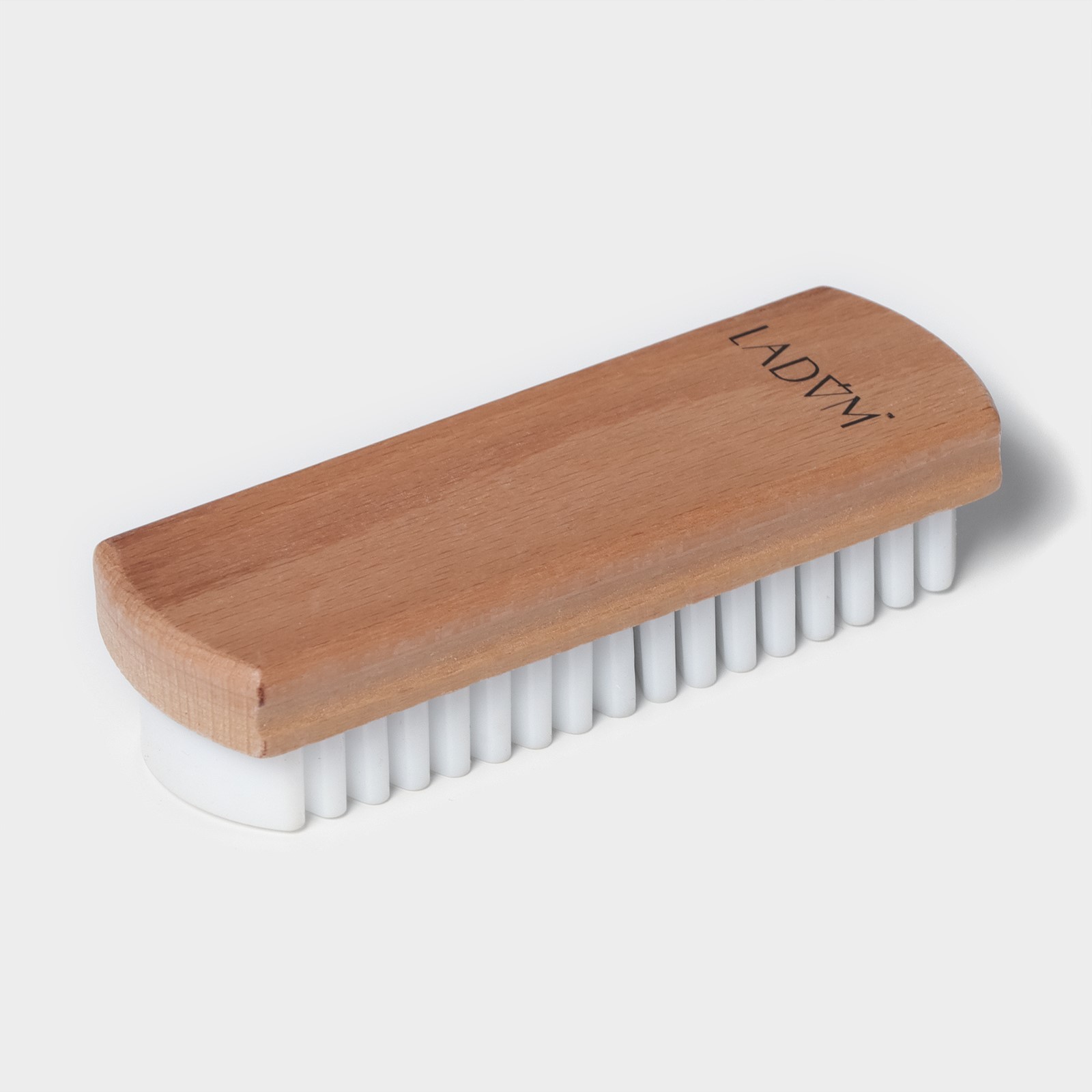 Array. Специальная щетка для чистки обуви и одежды из замши и нубука предназначена для борьбы с грязью, пылью и блеском с сухих загрязненных участков. Уникальная структура щетки позволяет удалять даже сильные, стойкие и старые загрязнения. Бережный уход за вашей обувью, одеждой и сумками. Преимущества: —Рукоять из настоящего дерева; —Термопластичный пластик; —Деликатная сухая чистка; —Компактный размер; —Легко очищается под водой; —Не оставит царапин; —Удаляет сухие загрязнения; —Устраняет потёртости. Использование: 1. Обработать загрязненный участок поверхности изделия против ворса, затем вычистить щеткой. 2. При сильных загрязнениях изделие необходимо предварительно обработать очистителем и просушить. 3. После чистки рекомендуется обработать поверхность изделия подкрашивающими или защитными средствами. Цвет: Коричневый Материал: Дерево Назначение: Для обуви  развернуть описание ▼