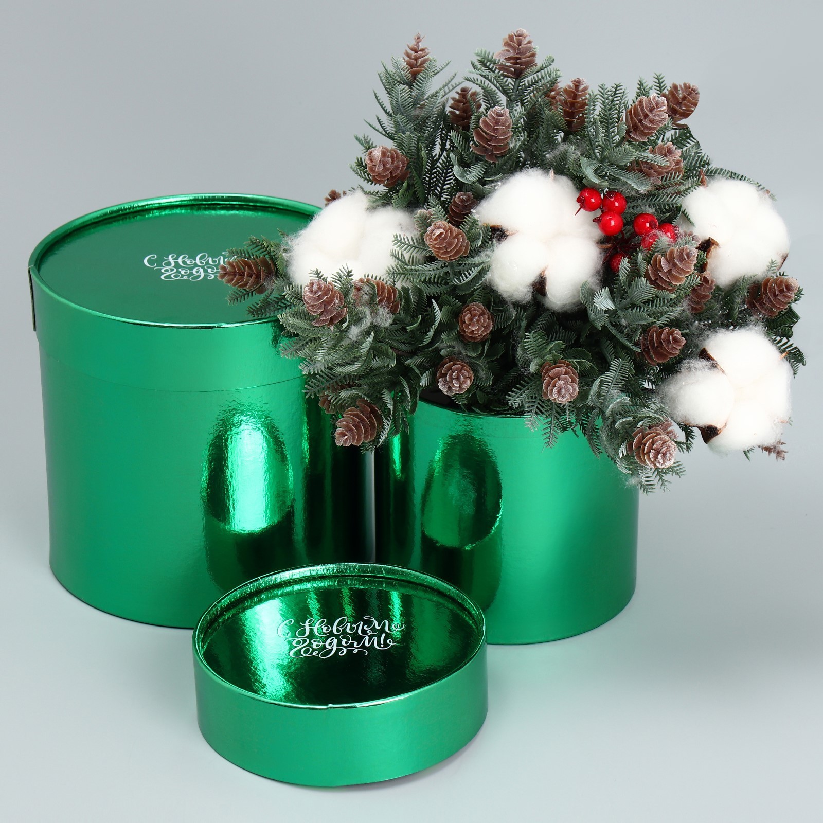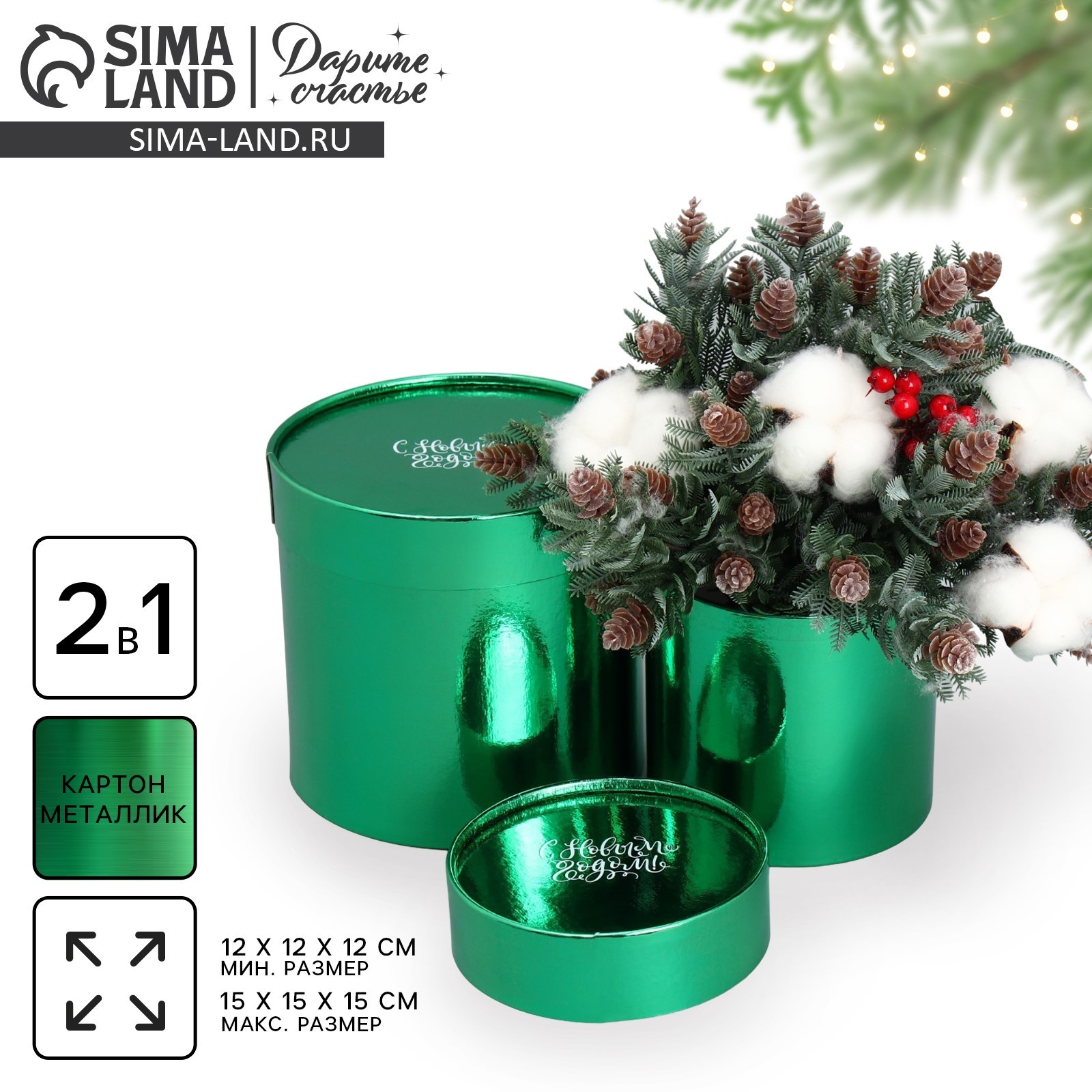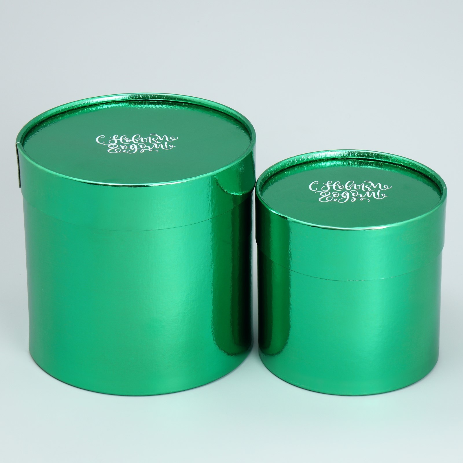 Набор новогодних подарочных коробок 2 в 1 круглые «с новым годом», зелёный металлик, 12 х 12, 15 х 15 см