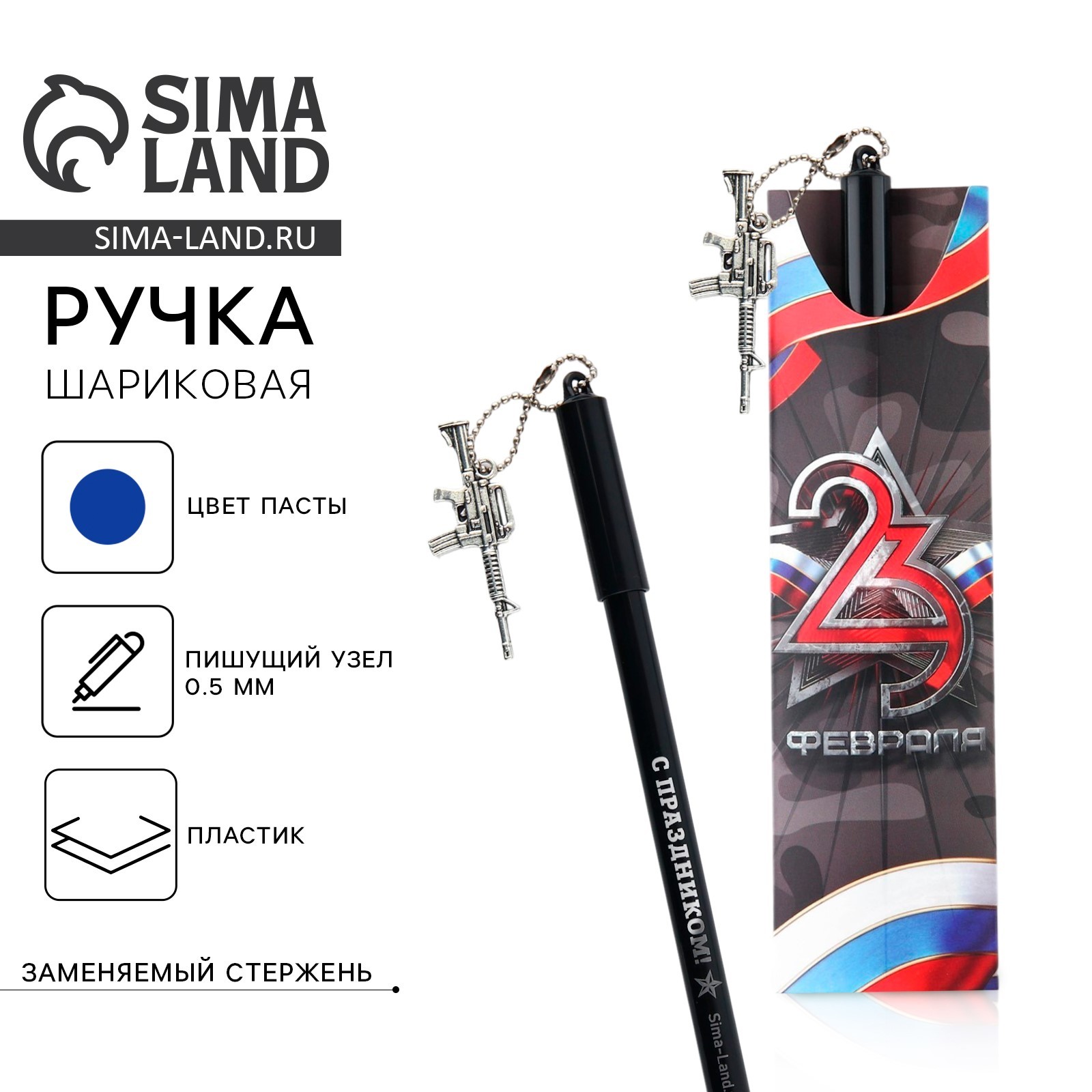Ручка шариковая, синяя паста 0.5 мм с подвеской автомат пластик «23 февраля». Ручка отличное дополнение к подарку. Яркий дизайн несомненно привлечет внимание и будет выделяться среди других предметов, а удобная форма корпуса позволит использовать ее с комфортом. Стержень заменяемый: да;Материал: пластик.Диаметр пишущего узла, мм:0.5|Набор:Нет|Цвет стержня:Синий|Вид упаковки:Пакет|Тематика праздника:23 Февраля|Адресат:Без адресата|Материал:Пластик|Материал упаковки:Полиэтилен|Составляющие набора:Ручка|Штрихкод на единице товара:Да|Наличие грипа:Нет|Страна:Китай  развернуть описание ▼