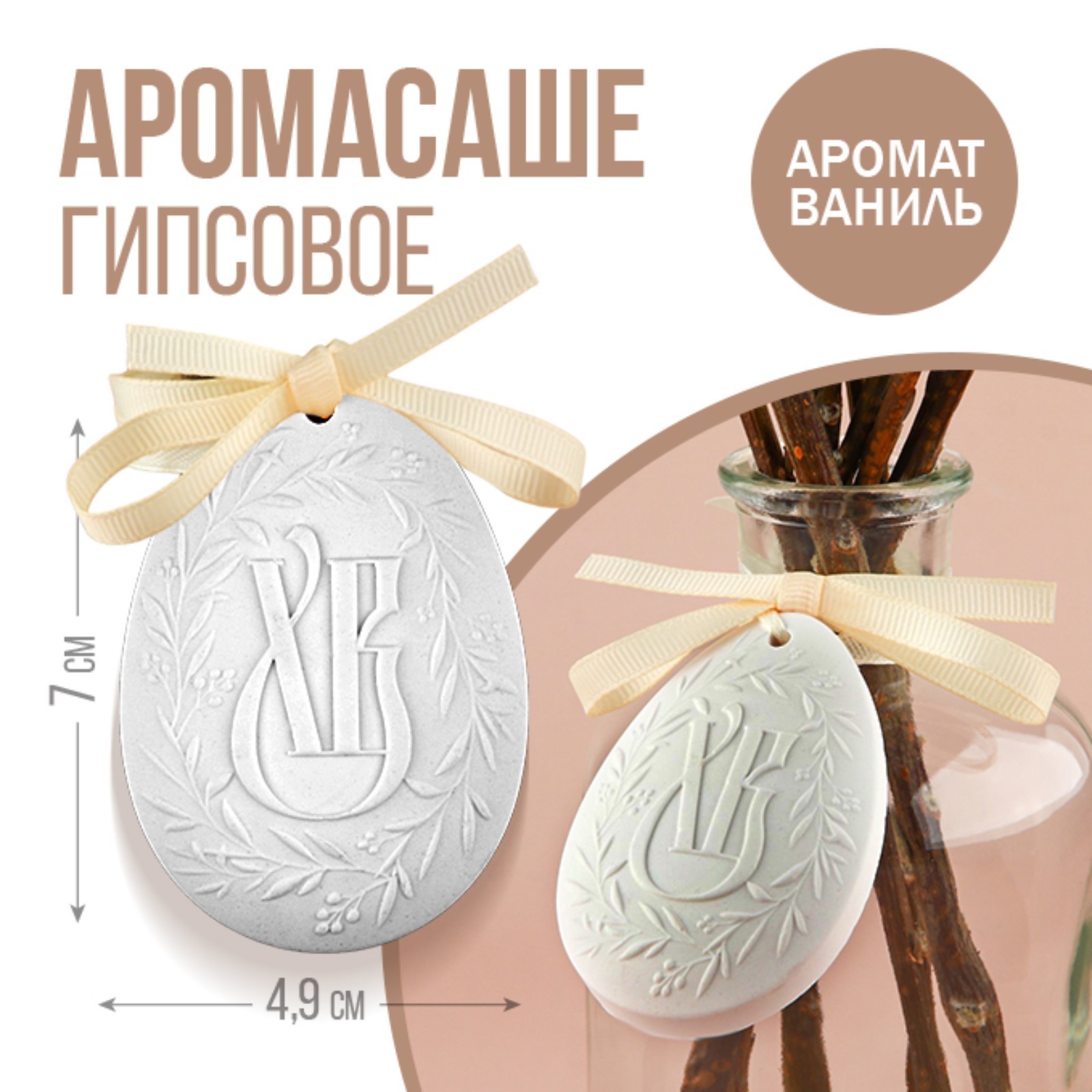 Гипсовое аромасаше «хв», аромат ваниль, 1.5 х 4.9 х 7 см.. Гипсовое аромасаше «ХВ», аромат ваниль, 1. 5 х 4. 9 х 7 см. Аромасаше - один из древнейших методов ароматерапии, который и сегодня не теряет своей актуальности и популярности. Это доступный и легкий способ наполнить помещение и вещи благоуханием. Ароматизатор оказывает антидепрессивное и тонизирующее действия: поднимает настроение, снимает стресс, а также повышает умственную активность, борется с состоянием подавленности. Аромасаше - это замечательный подарок для ваших близких в этот светлый праздник Пасхи. Такой подарок порадует всех без исключения и не имеет возрастных ограничений. Товар имеет индивидуальный рисунок который выполнен на качественном гипсе. Цвет: Бежевый Цвет: Белый Адресат: Племяннице Адресат: Жене Адресат: Бабушке Адресат: Дочке Адресат: Внучке Вид ароматизатора: Аромасаше Аромат: Ваниль Вид: Фигурка Индивидуальная упаковка: Да Универсальный: Да  развернуть описание ▼
