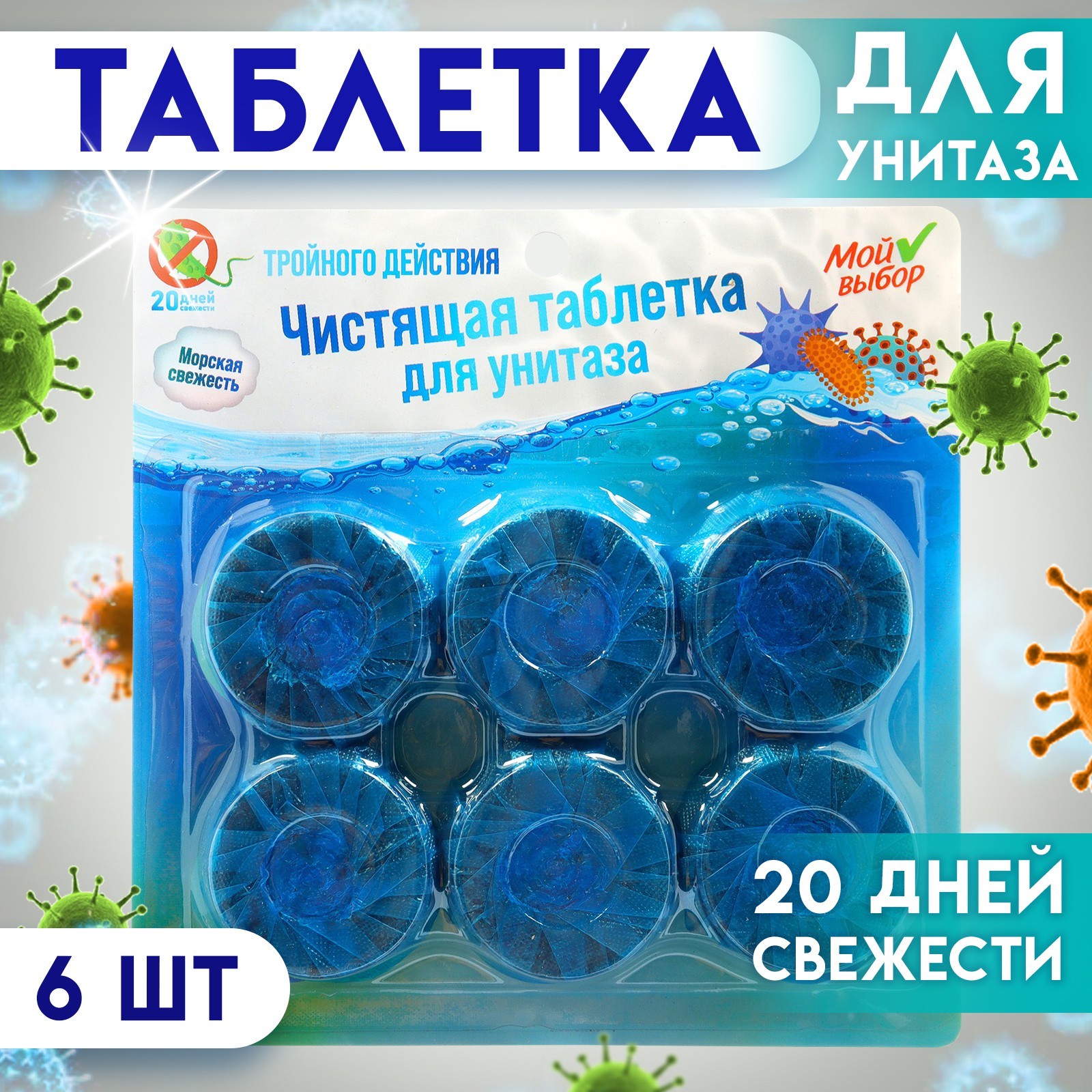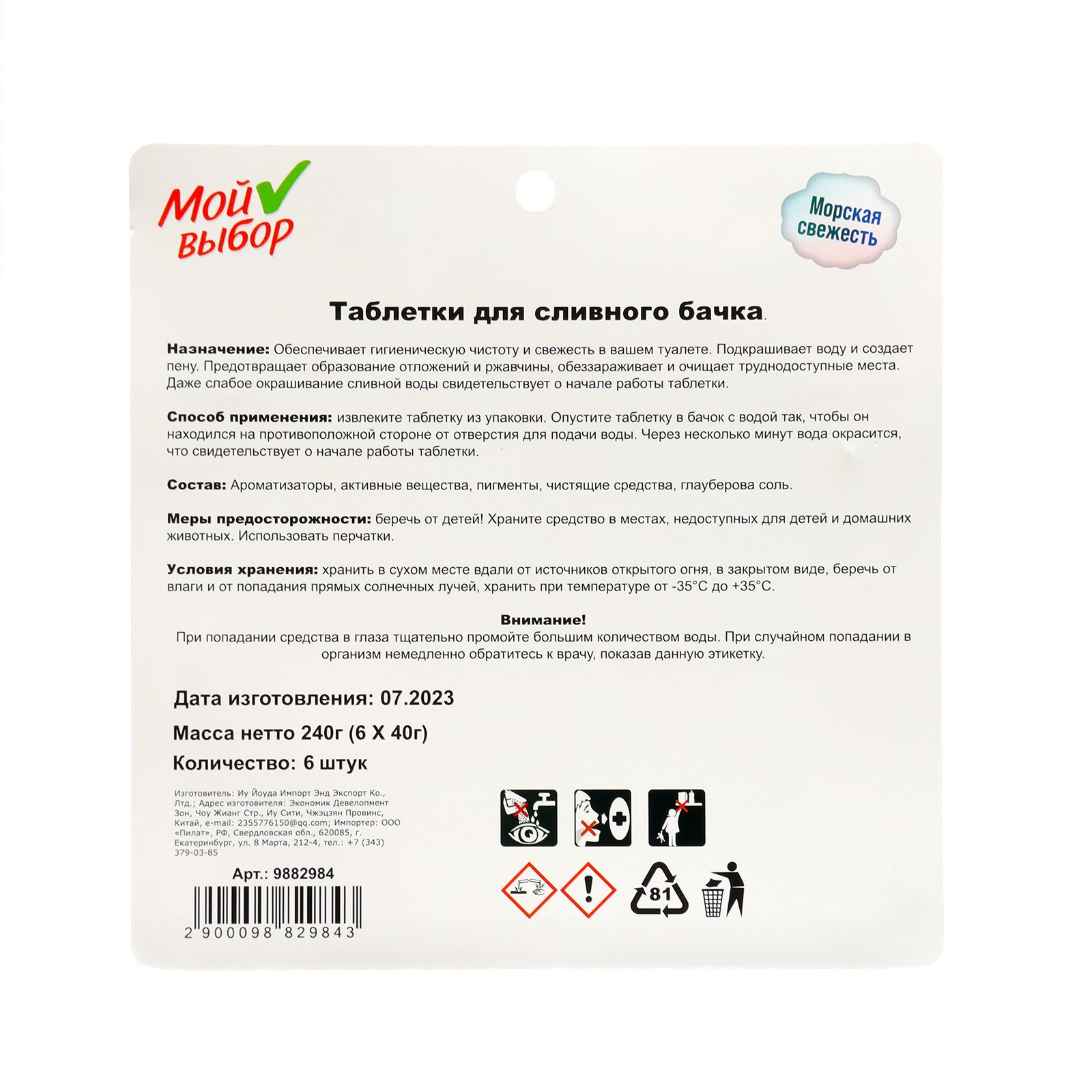 Таблетка для сливного бачка мой выбор , 40 гр, 6 шт. Таблетка для сливного бачка "Мой Выбор" предназначена для поддержания чистоты и свежести в туалетной чаше. Это эффективное и удобное средство обеспечивает не только освежающий аромат, но и предотвращает образование накипи и неприятных запахов. Просто опустите таблетку в сливной бачок, и она начнет действовать при каждом смыве воды. Таблетка растворяется, высвобождая активные компоненты, которые предотвращают образование известкового налета и помогают поддерживать чистоту в унитазе. Таблетки "Мой Выбор" не только поддерживают гигиеничность туалета, но и придают ванной комнате свежий и приятный аромат. Регулярное использование этого продукта помогает поддерживать чистоту и гигиеничность в вашем туалете. Аромат: Морская свежесть Вид средства: Таблетка  развернуть описание ▼