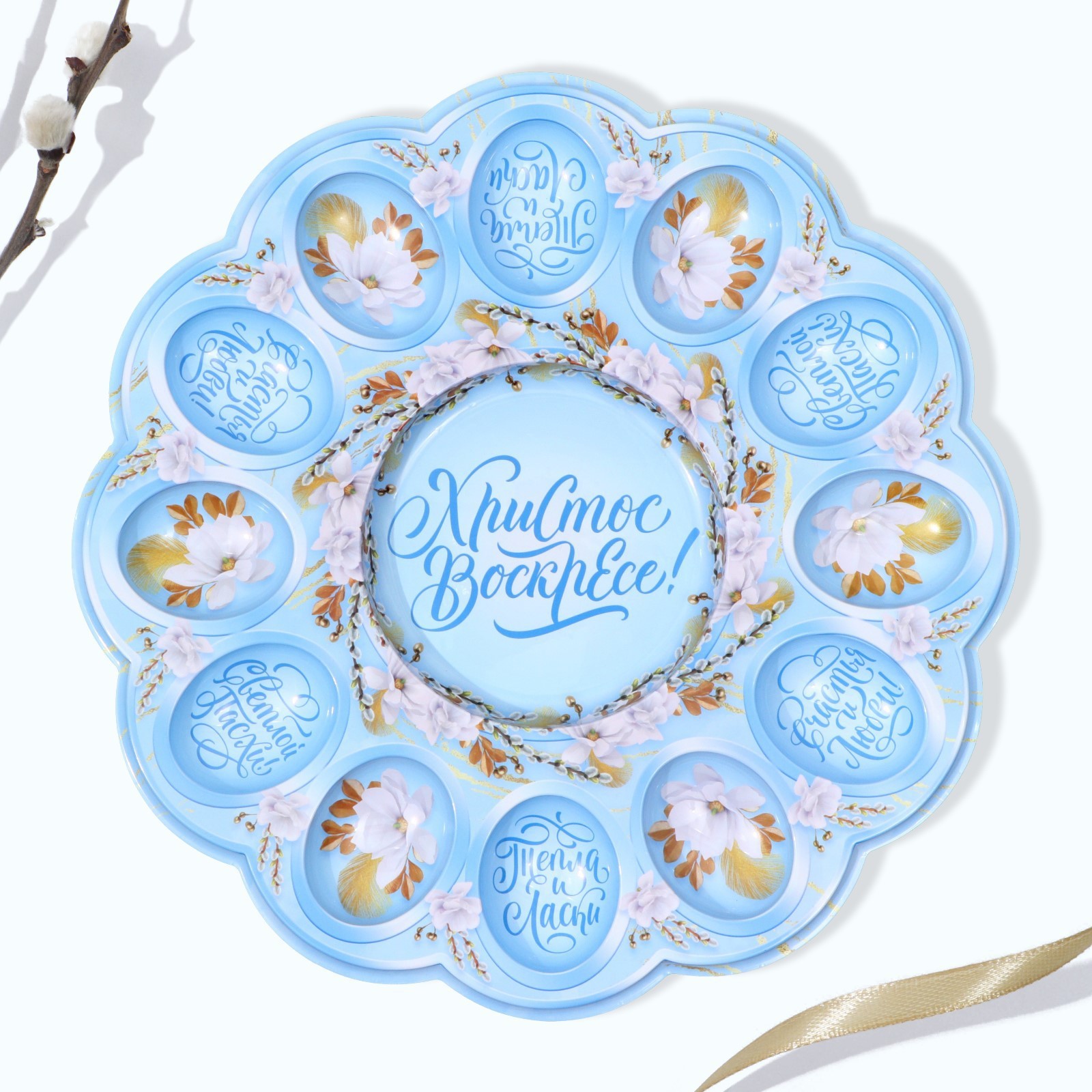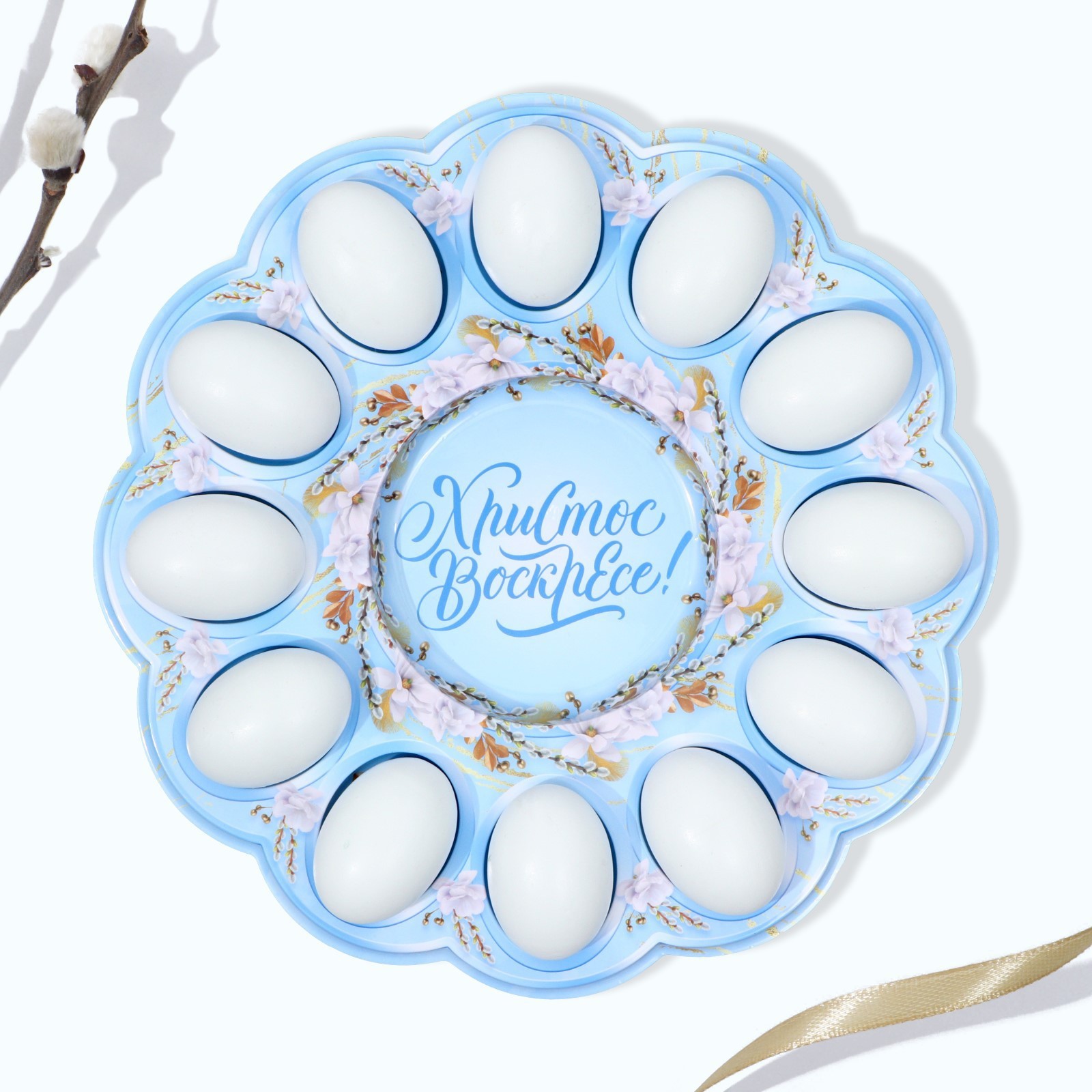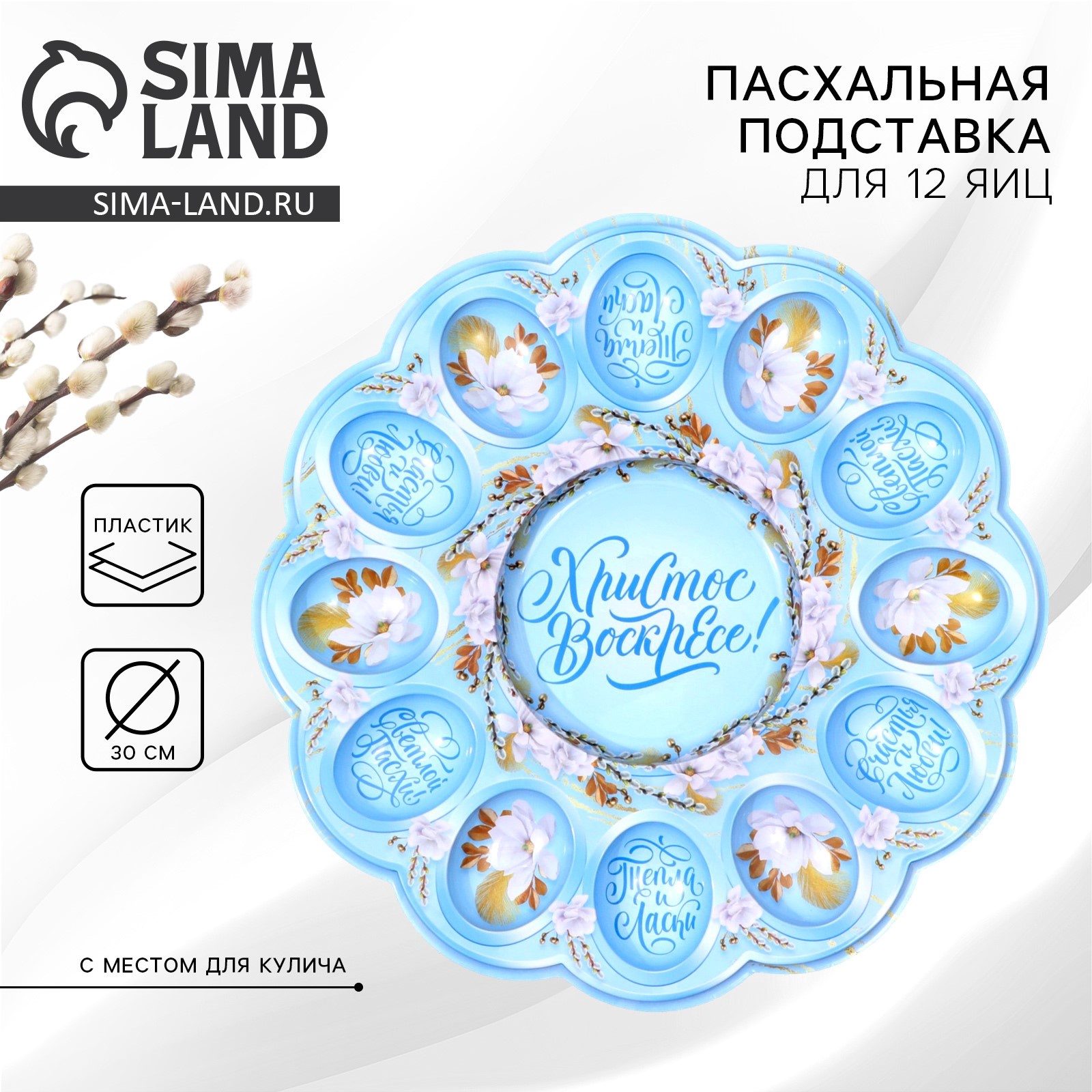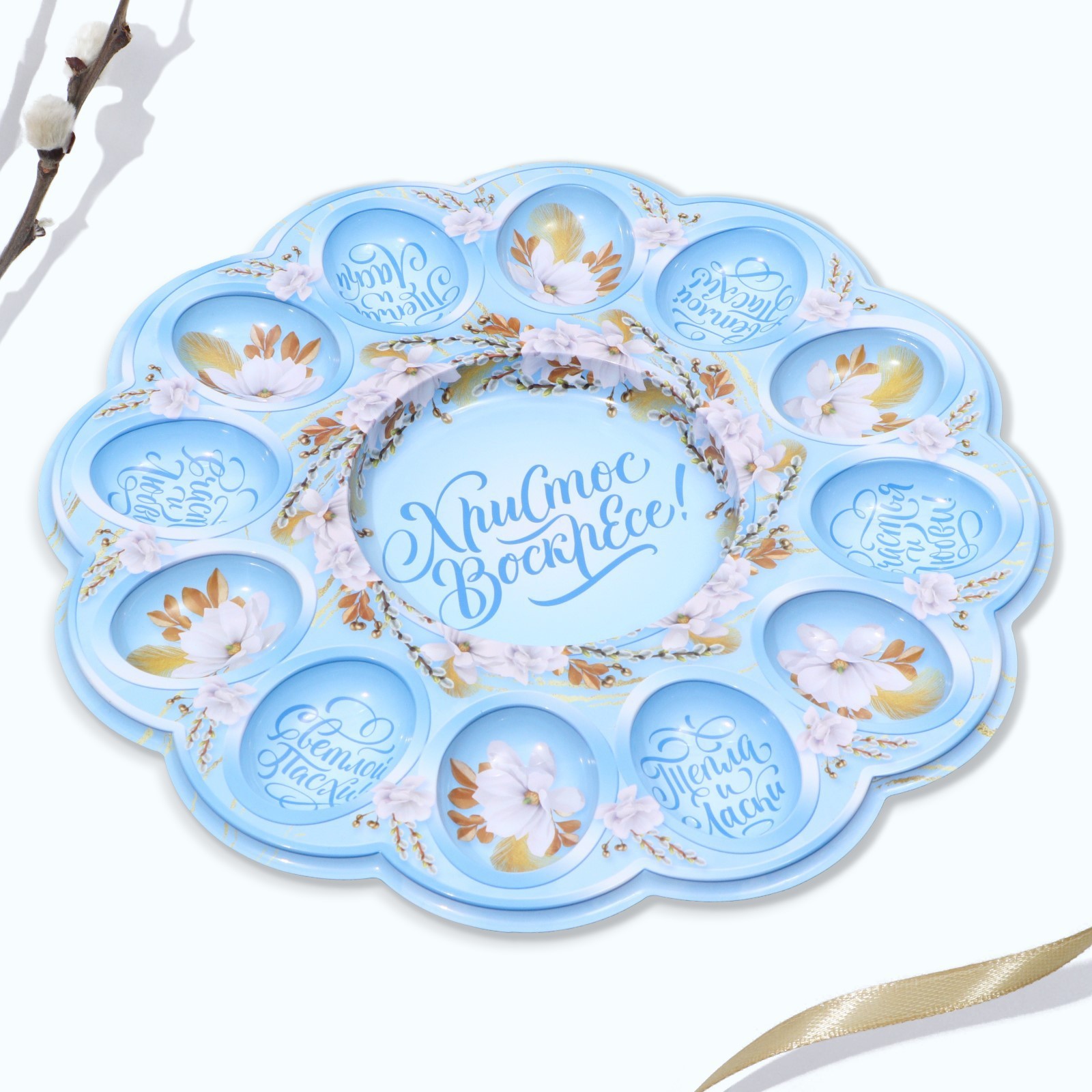 Пасхальная подставка на 12 яиц и кулич «христос воскресе!» на пасху, 30 х 30 см.. Перед светлым праздником Пасхи хочется украсить свой стол. Пасхальная подставка для яиц и кулича станет хорошим украшением для праздничного стола. Пасхальная подставка для яиц изготовлена пластика, имеет полноцветное яркое изображение и интересную гравировку. Аксессуар станет достойным украшением праздничного стола, создаст радостное настроение и наполнит пространство дома благодатной энергией на год вперёд. Светлой Вам Пасхи! Цвет:Голубой|Диаметр, см:30|Количество ячеек:12|Тематика:Узоры|Рисунок:Да|Тематика праздника:Пасха|Адресат:Жене|Адресат:Маме|Адресат:Бабушке|Материал:Пластик|Можно мыть в посудомоечной машине:Нет|Текстура:Гладкая|Особенности:Без особенностей|Страна:Китай  развернуть описание ▼