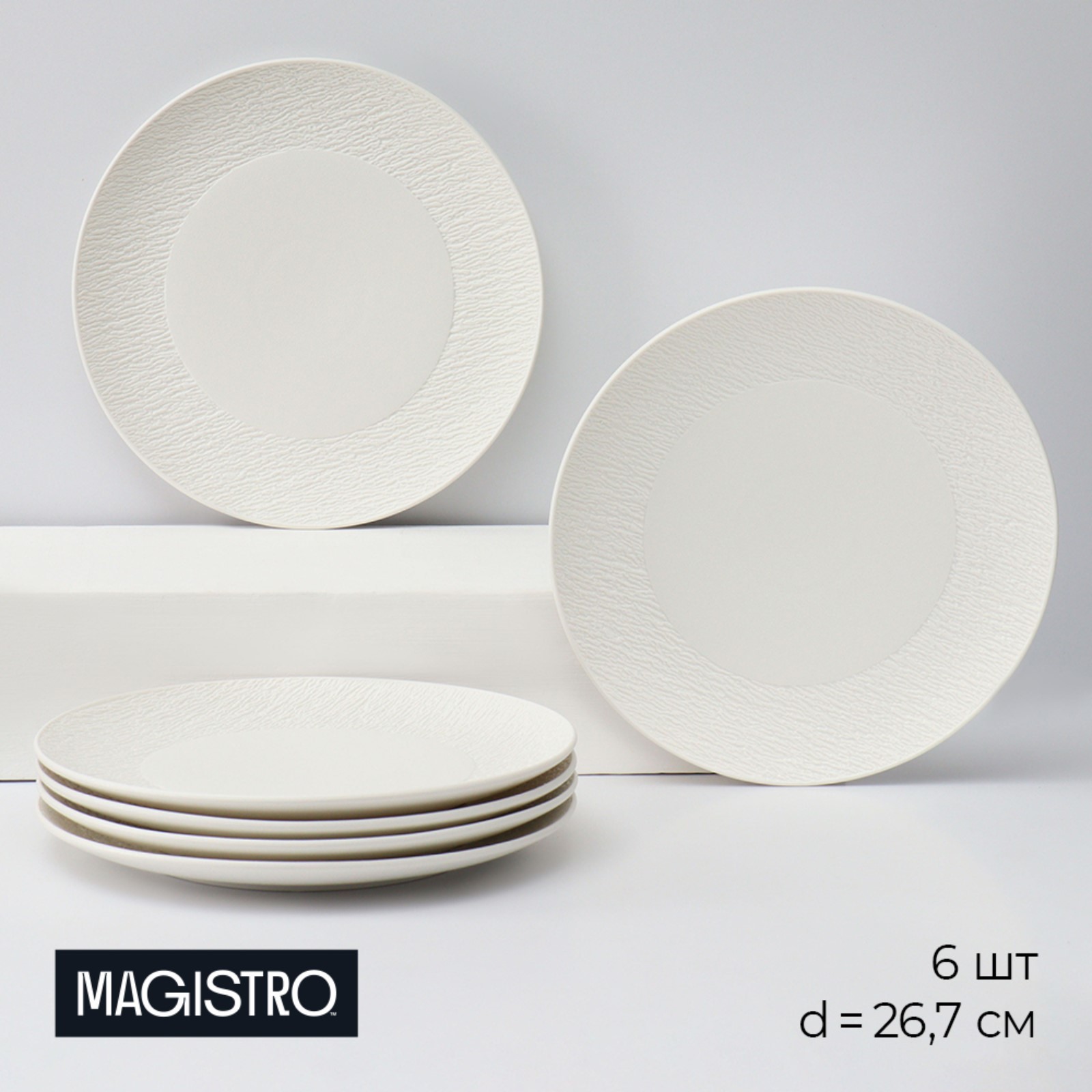 Набор тарелок обеденных фарфоровых magistro lofty, 6 предметов: d=26,7 см, цвет белый. Оригинальная серия посуды Magistro Lofty - прекрасный выбор для любой кухни. В серию входят миски, салатники и десертные тарелки разных размеров и цветов - чёрного и белого. Вся посуда изготовлена из высококачественного фарфора и имеет стильный современный дизайн. Миски и салатники идеально подойдут для современной сервировки блюд в стиле «Лофт» и приготовления еды. Десертные тарелки станут отличным выбором для подачи тортов, пирожных и других сладостей. Благодаря разнообразию размеров и цветов, вы сможете подобрать изделия, которые гармонично впишутся в ваш интерьер. Вся серия Magistro Lofty проста в уходе и может быть использована в посудомоечной машине. Цвет: Белый Форма: Круглая Диаметр, см: 26.7 В наборе, шт.: 6 Тематика: Однотонная Материал: Фарфор Вид тарелки: Плоская Можно мыть в посудомоечной машине: Да Можно использовать в СВЧ-печи: Да Текстура: С рельефом Особенности: Без особенностей Матовая поверхность: Да Для горячего: Да  развернуть описание ▼